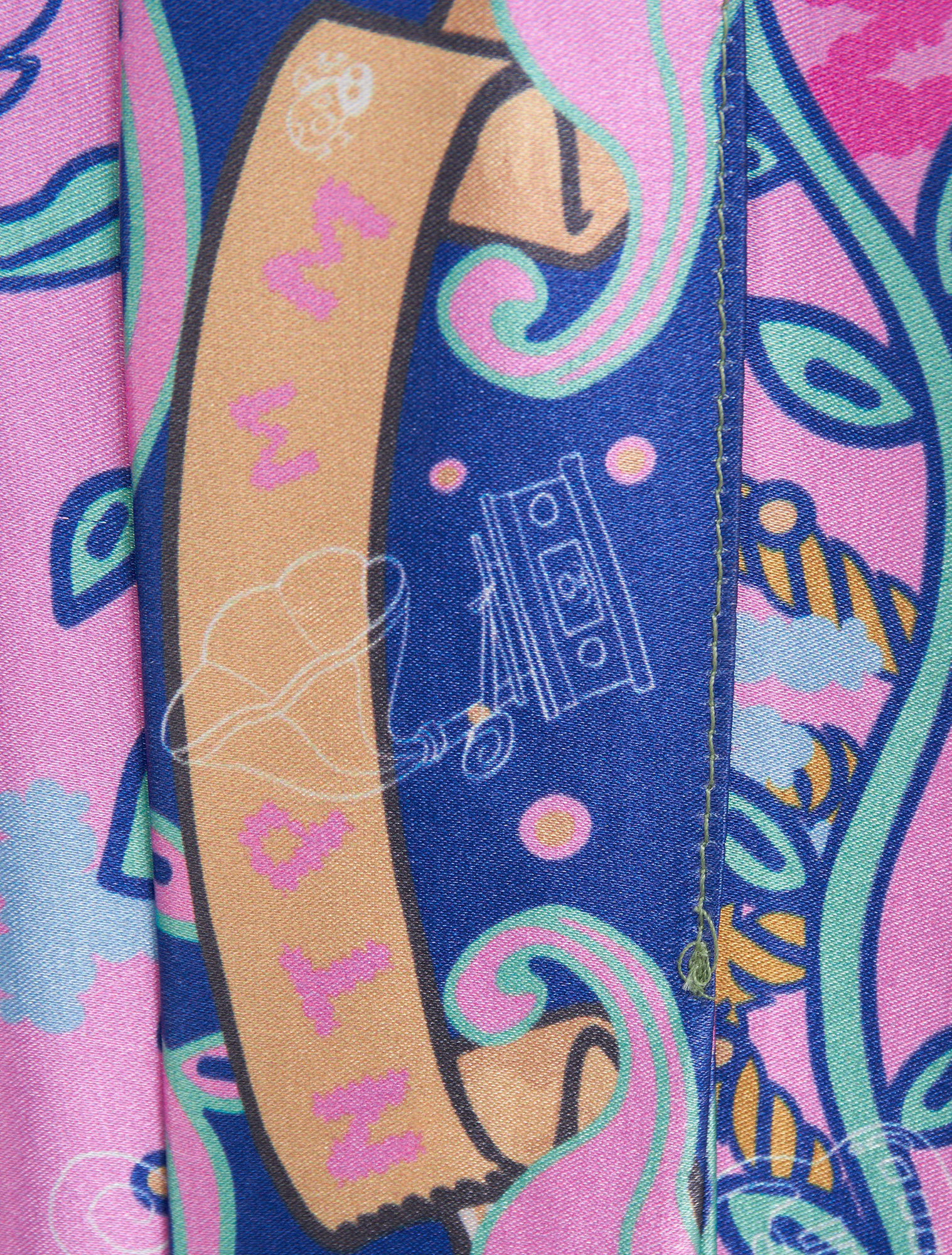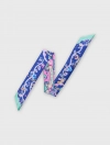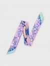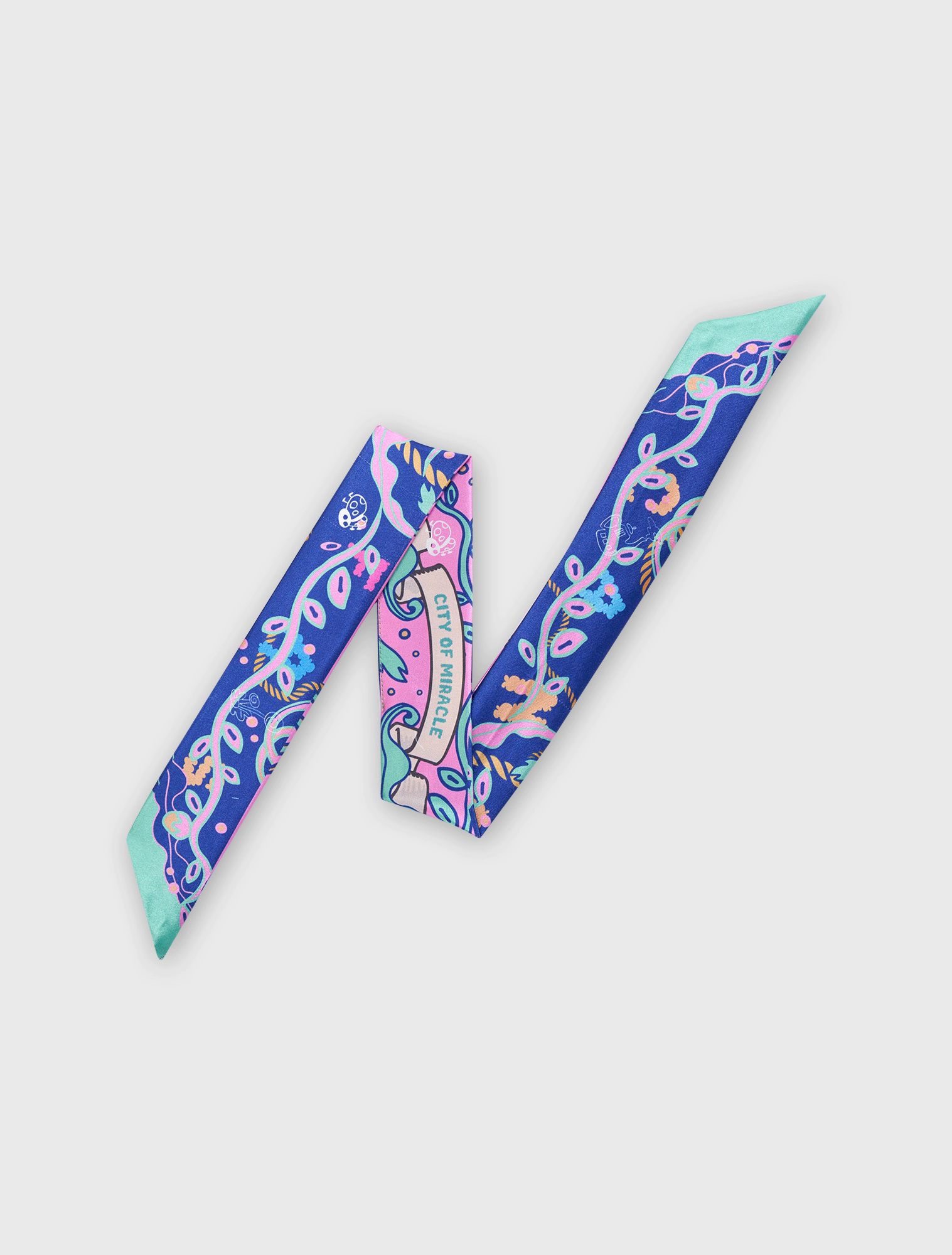 Khăn twilly với họa tiết dây leo uốn lượn và dòng chữ City of Miracle trên nền hồng – tím – xanh tương phản, tạo điểm nhấn mơ màng cho cổ áo, quai túi hoặc mái tóc.