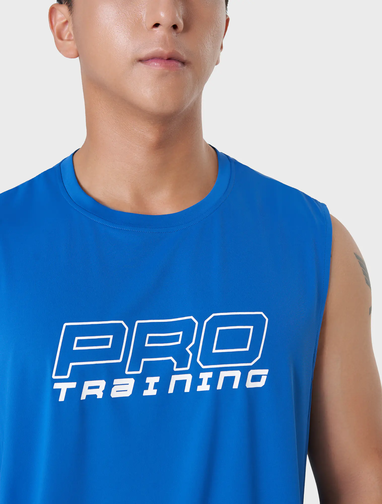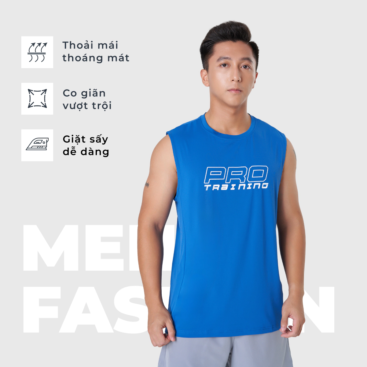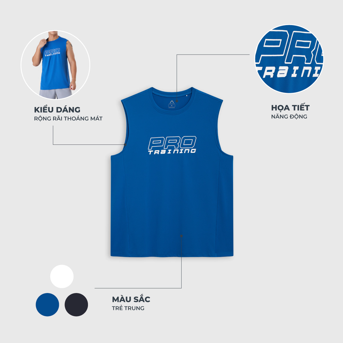 Áo ba lỗ chất liệu polyester co giãn, cổ tròn, phom regular.