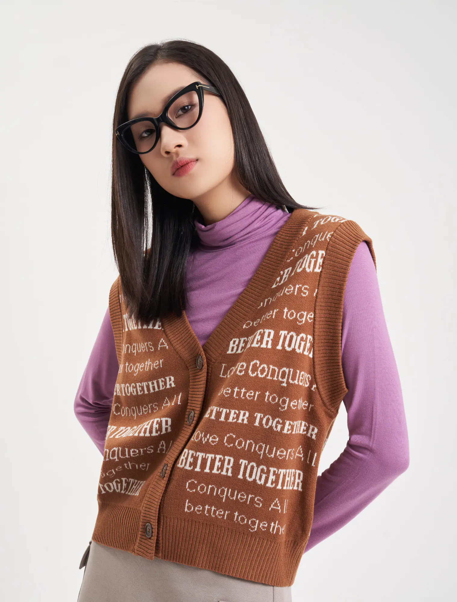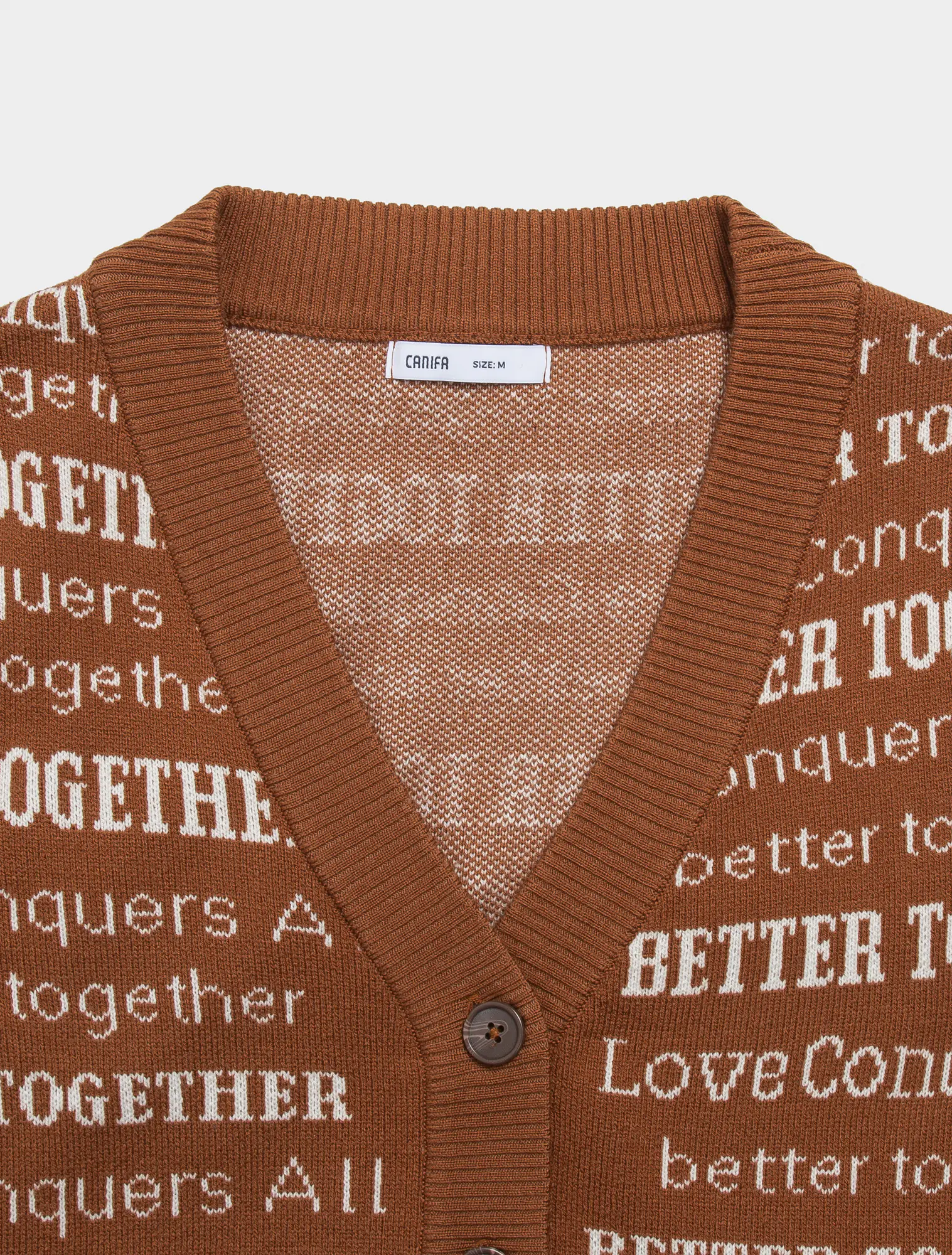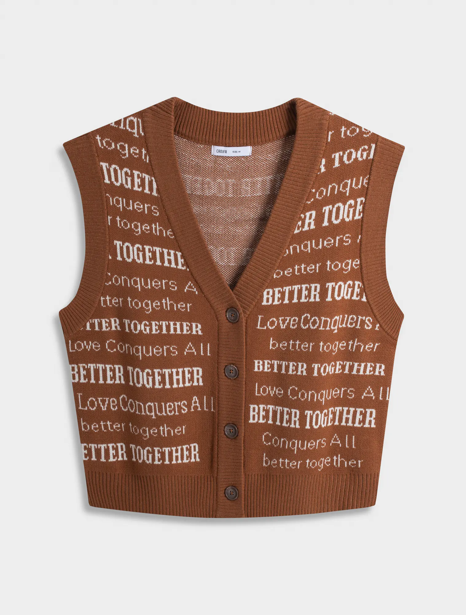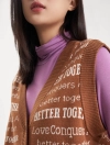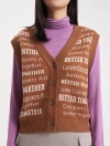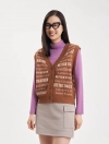 Áo len gilet nữ cổ tim mở cúc, dễ dàng kết hợp với áo sơ mi dài tay và áo khoác. Kiểu dáng ôm vừa, gọn gàng, dệt họa tiết chữ phối màu.