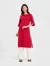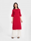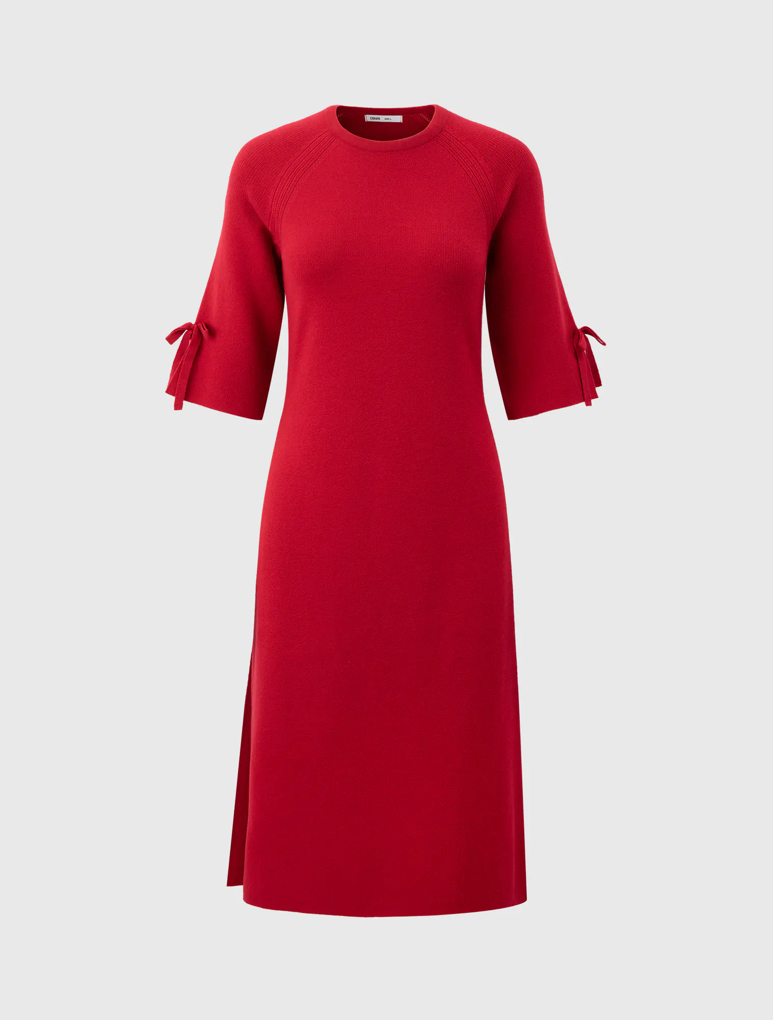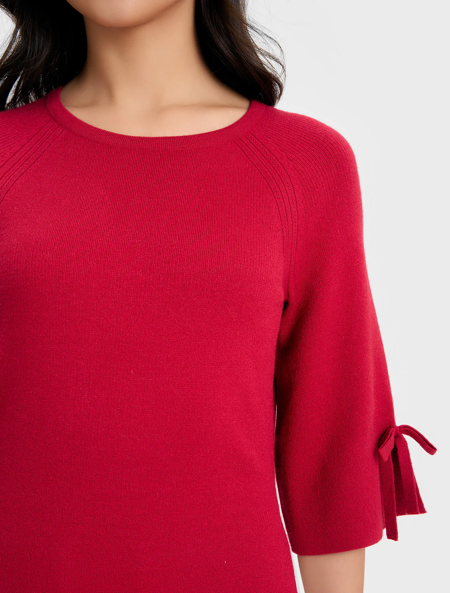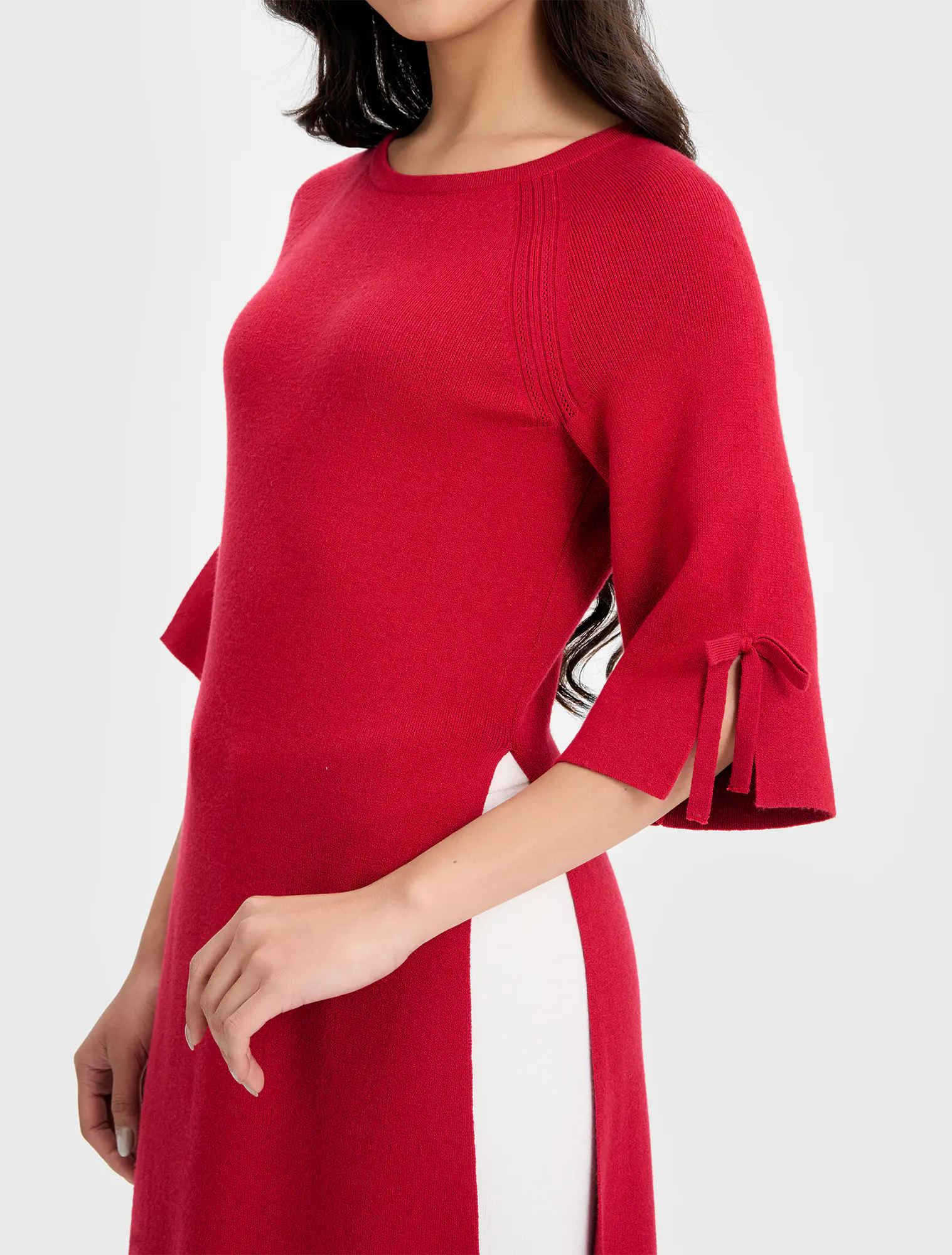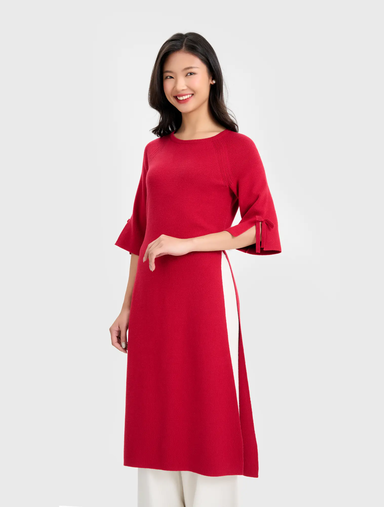 Áo dài len, cổ tròn tay lỡ, đính nơ.