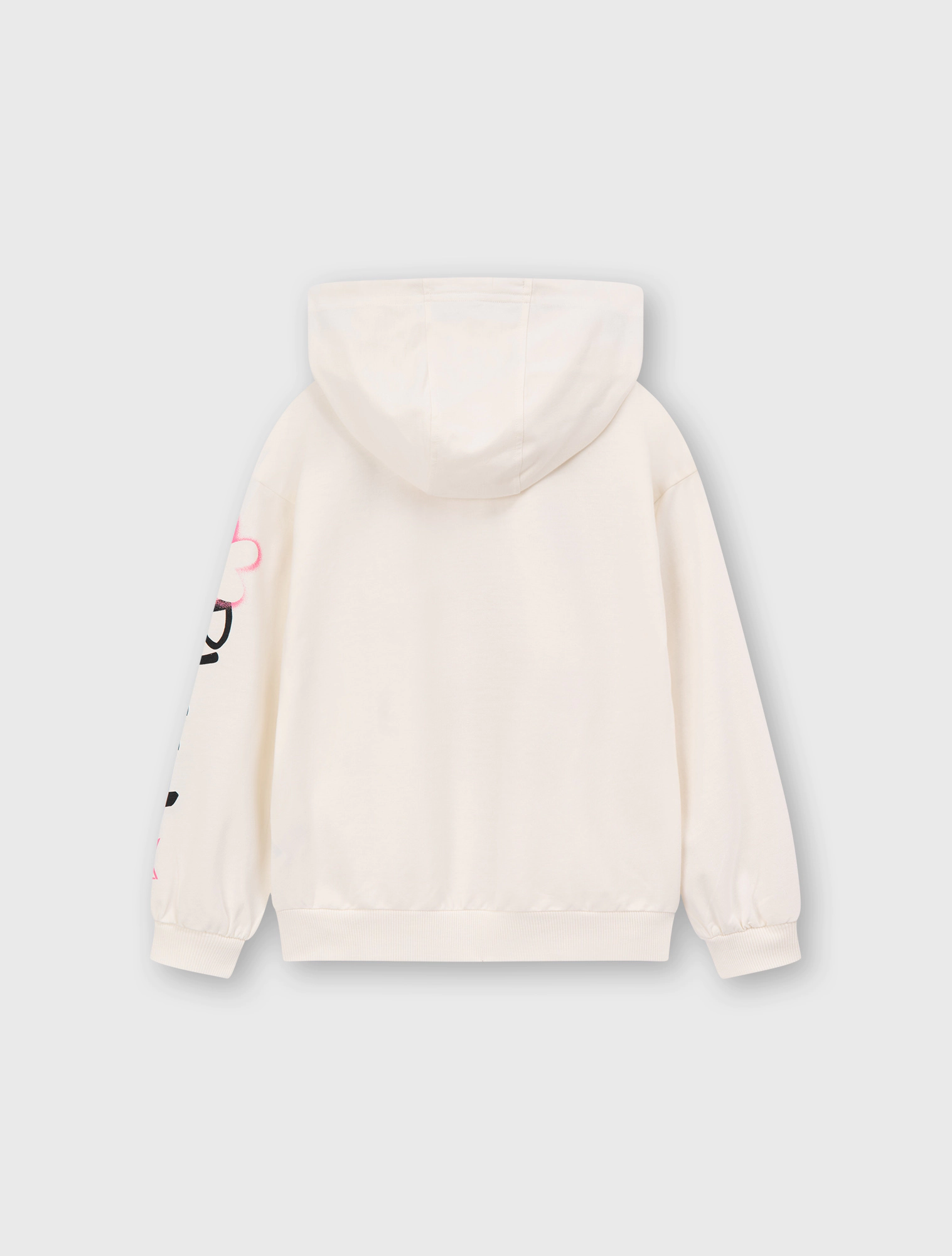 Áo nỉ bé gái có mũ. Phom áo cơ bản dễ mặc. Màu sắc tươi sáng, hình in dễ thương phù hợp bé gái. Chất liệu Cotton pha mềm mại, giữ ấm tốt