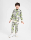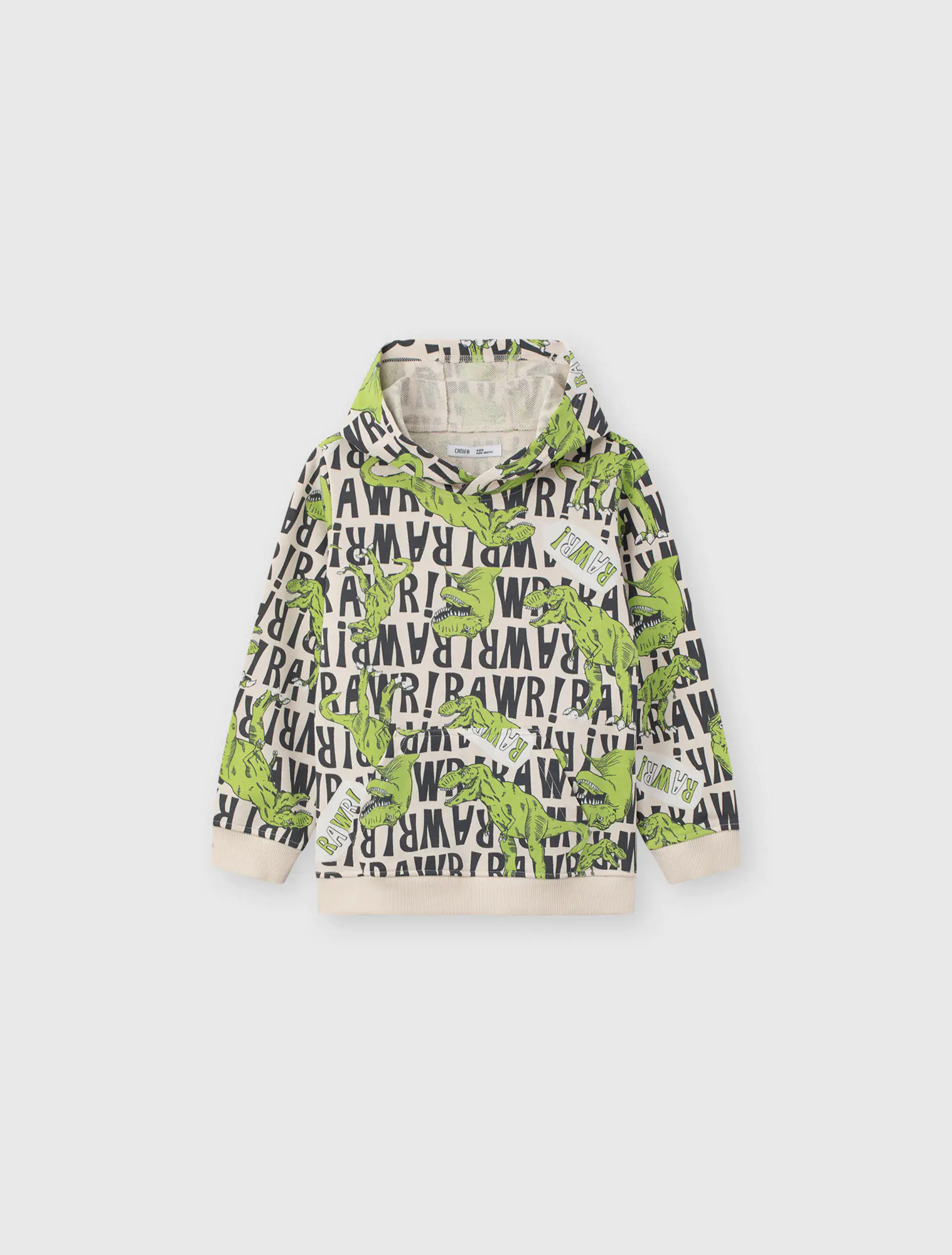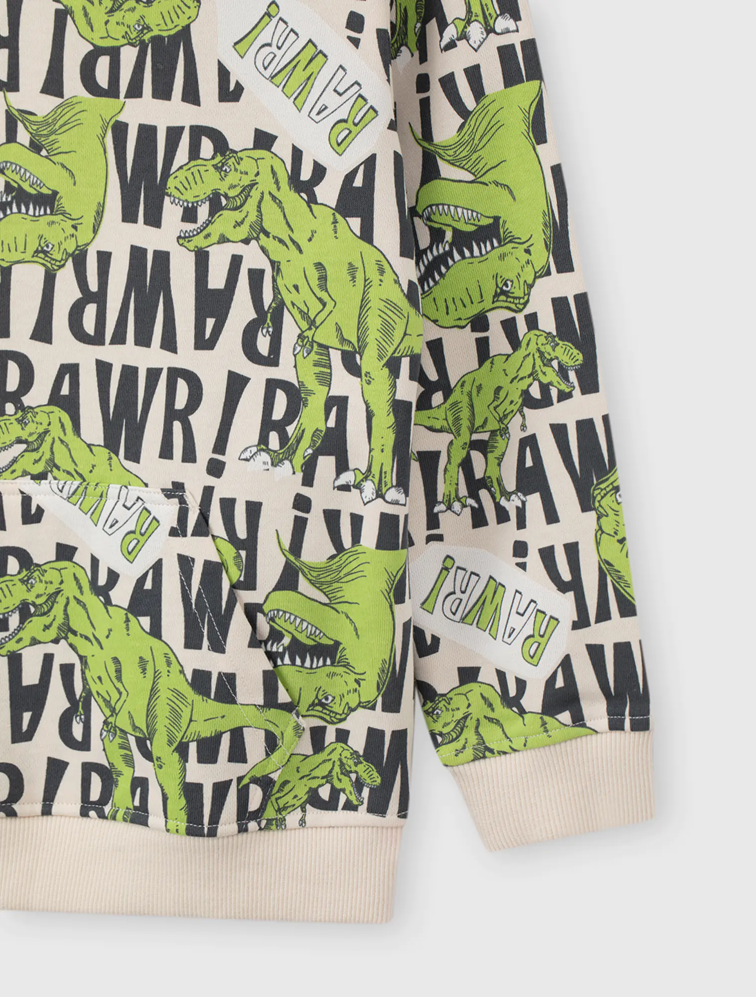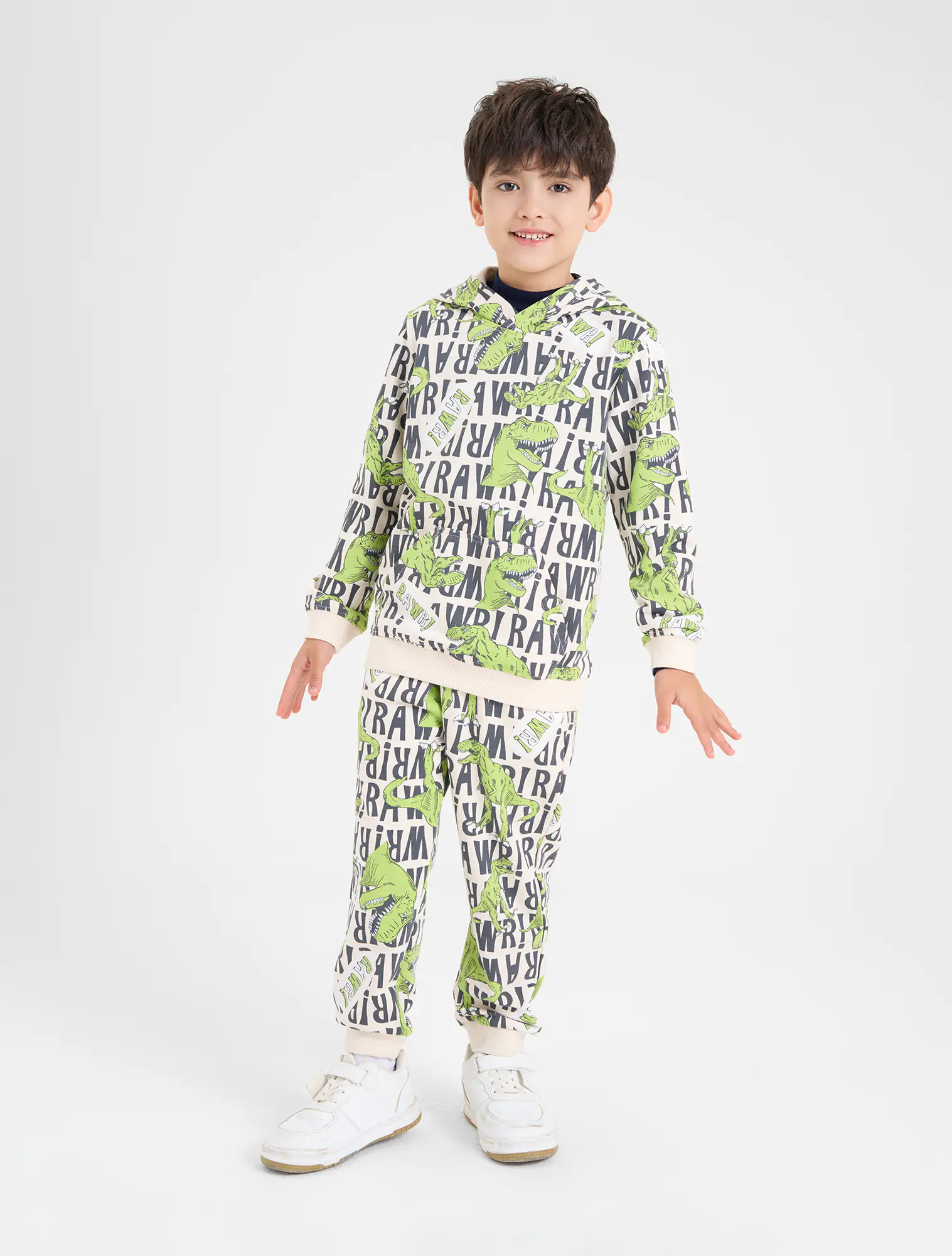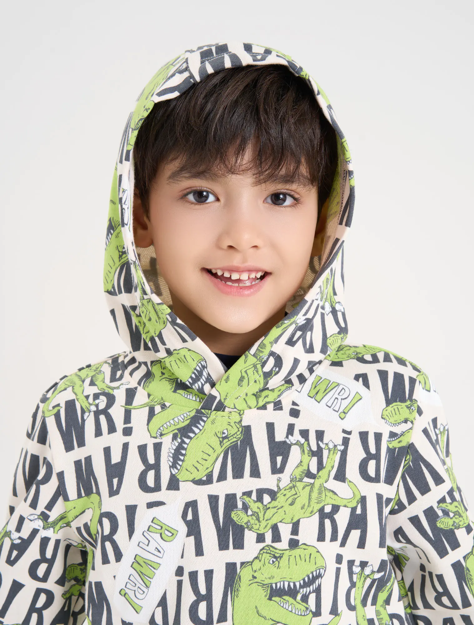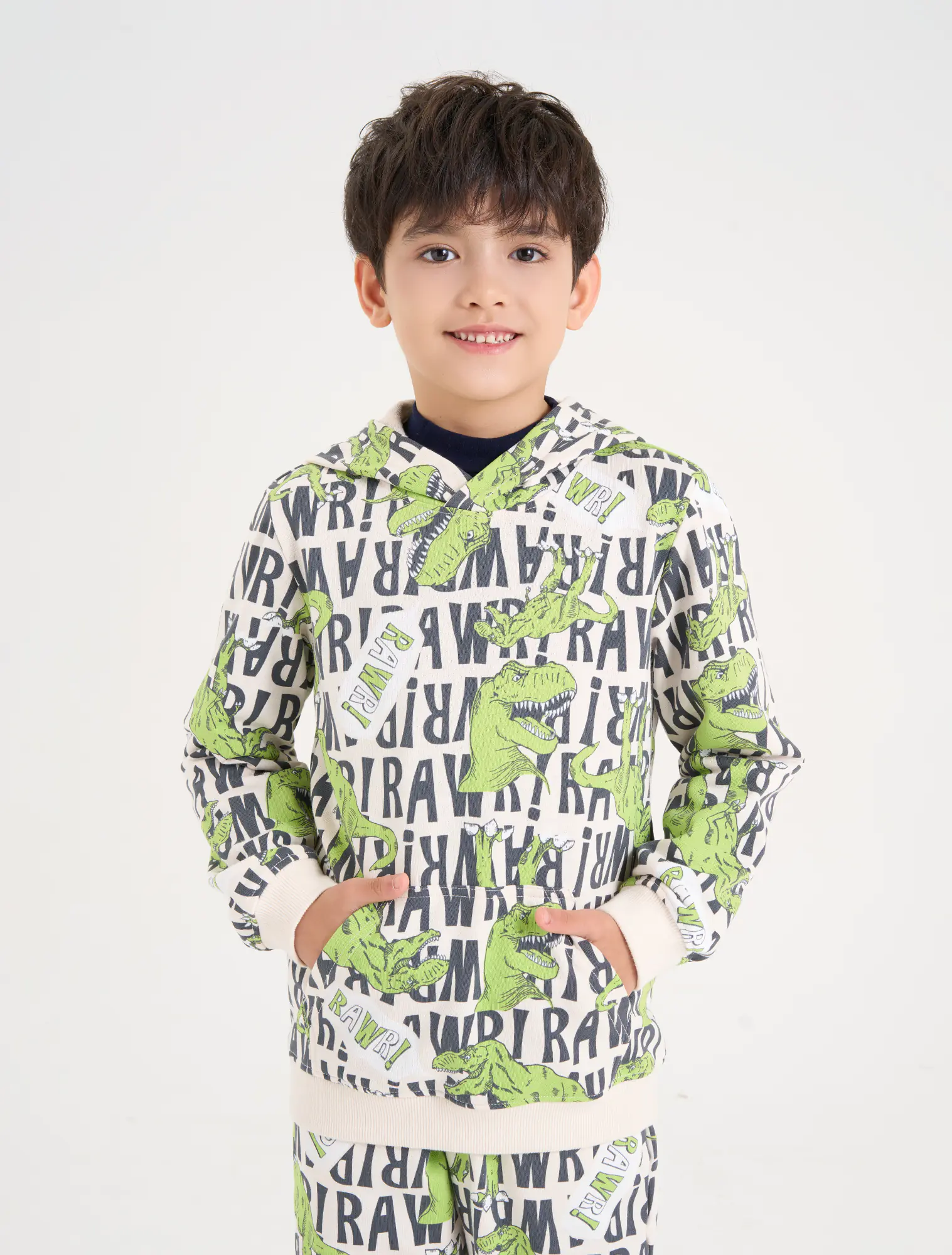 Áo nỉ bé trai có túi ốp, chất liệu vảy cá hình in tràn khủng long phù hợp với sơ thích của các bạn nhỏ.