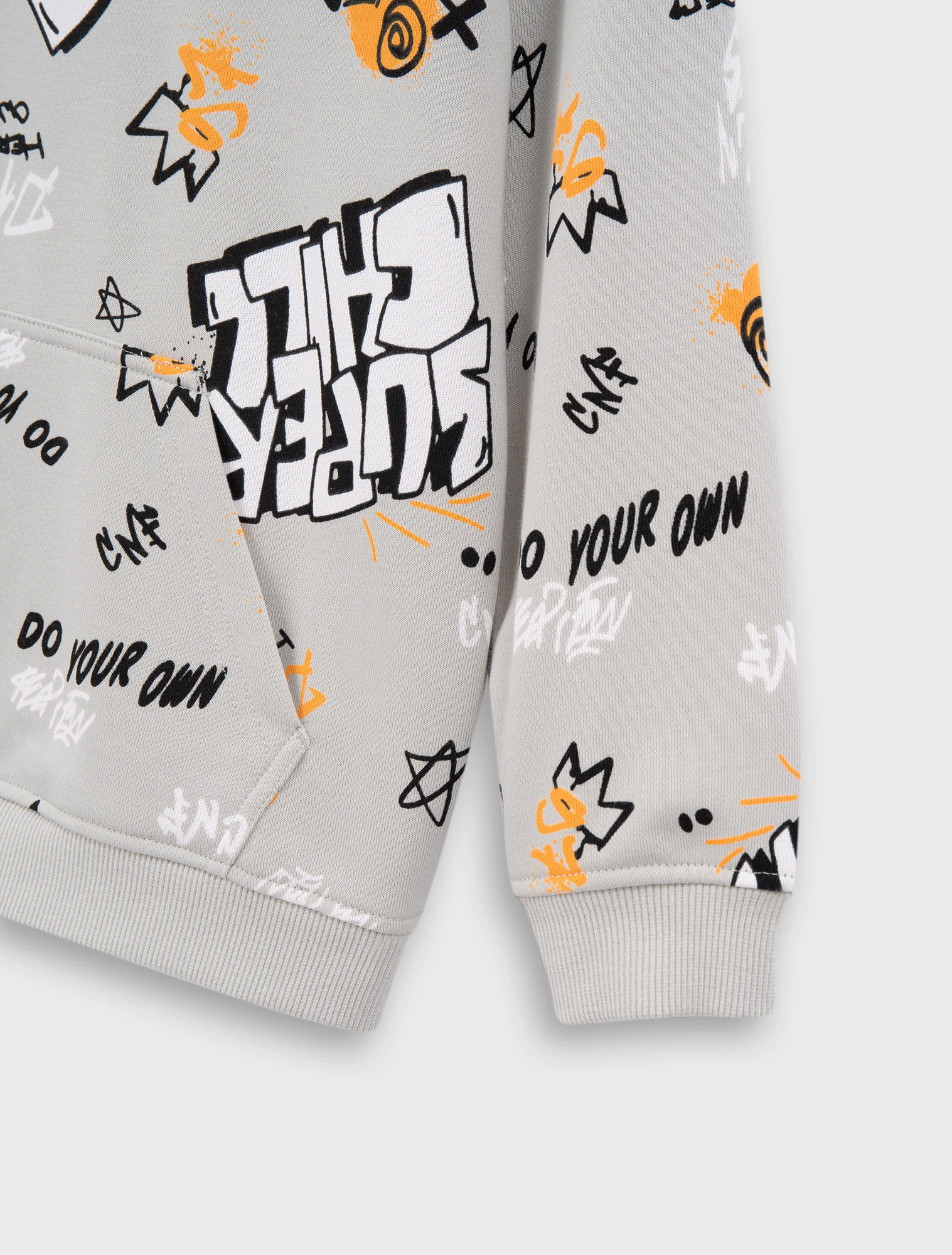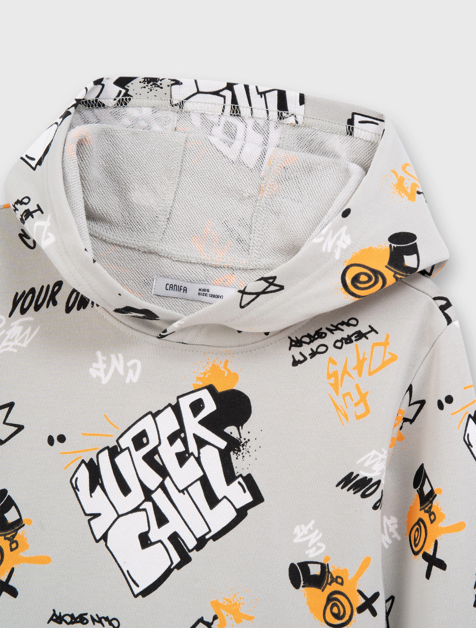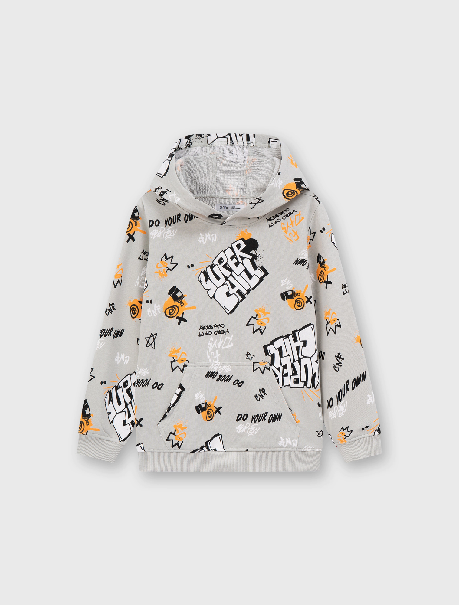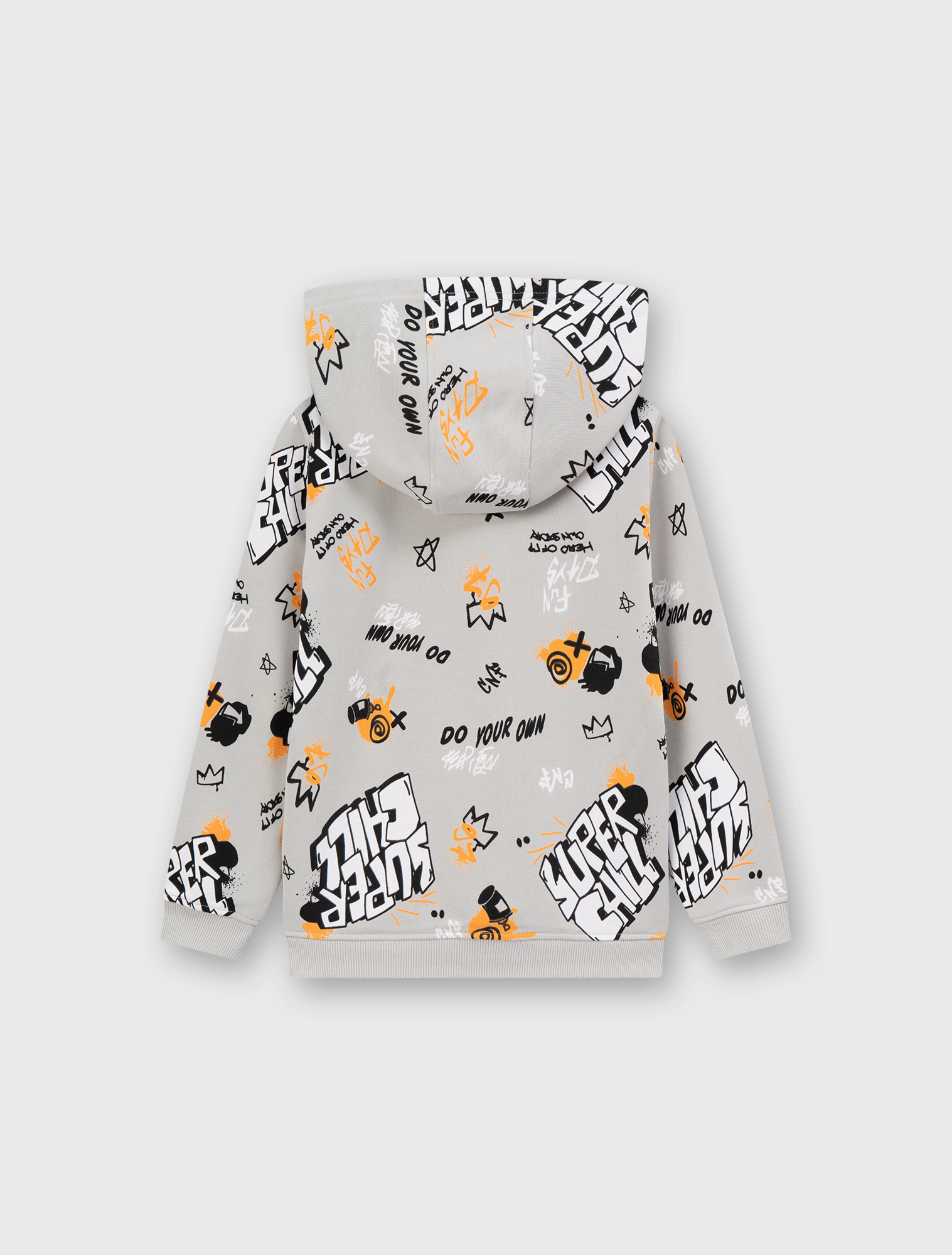 Áo nỉ bé trai có túi ốp, chất liệu vảy cá hình in tràn khủng long phù hợp với sơ thích của các bạn nhỏ.