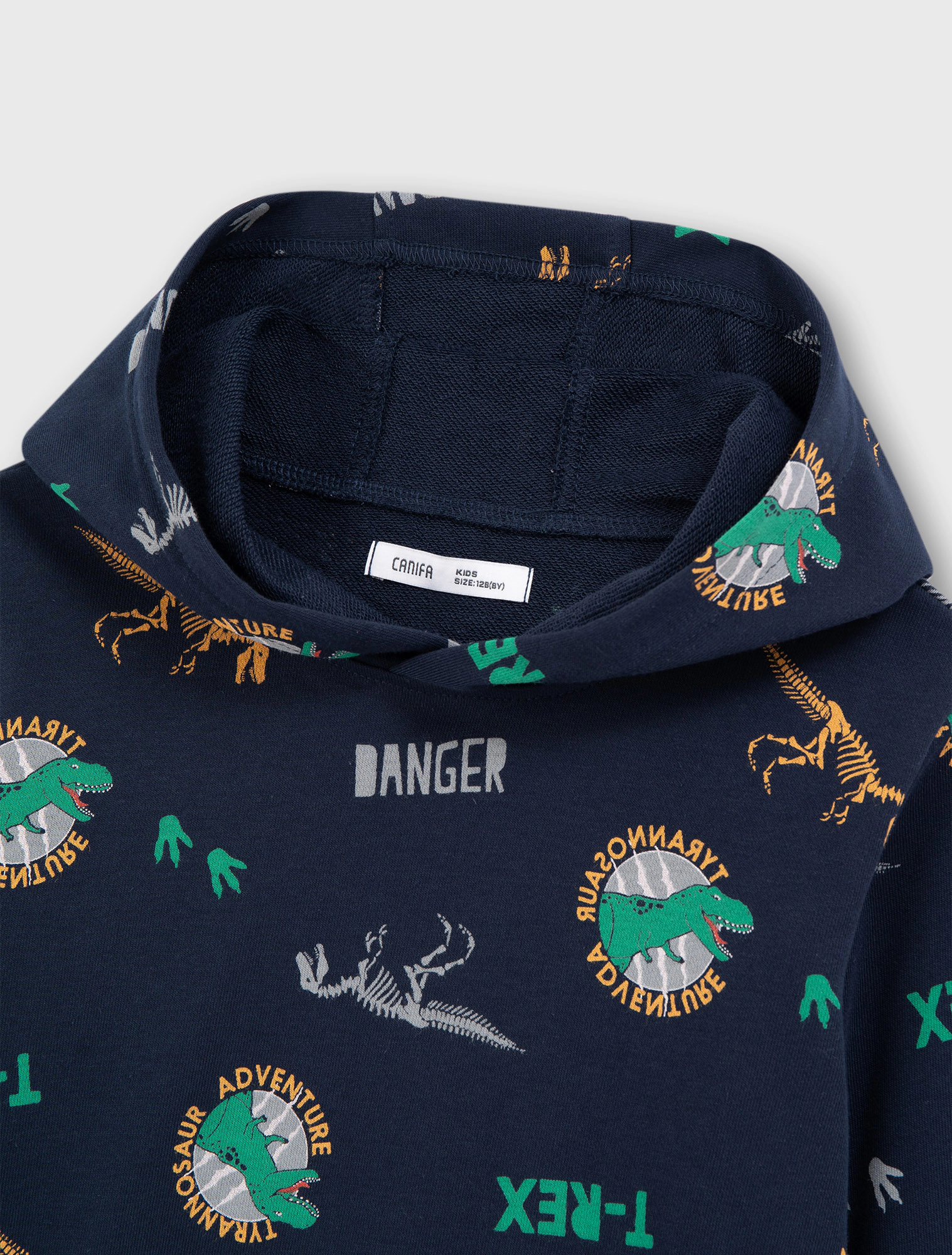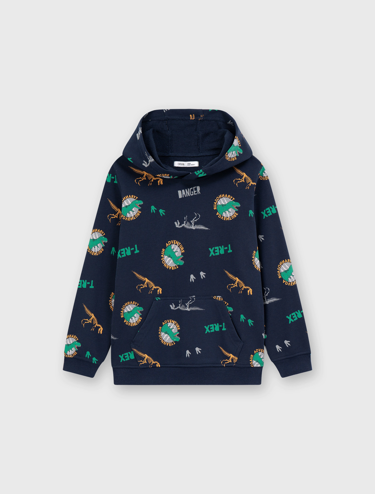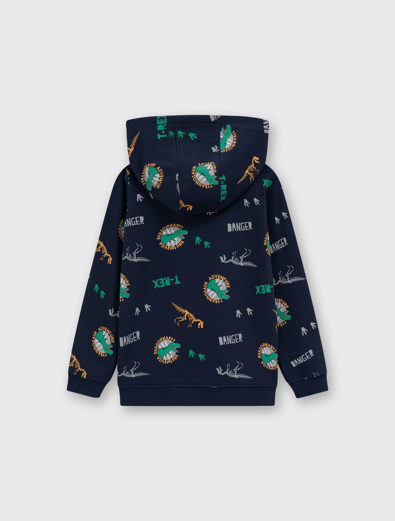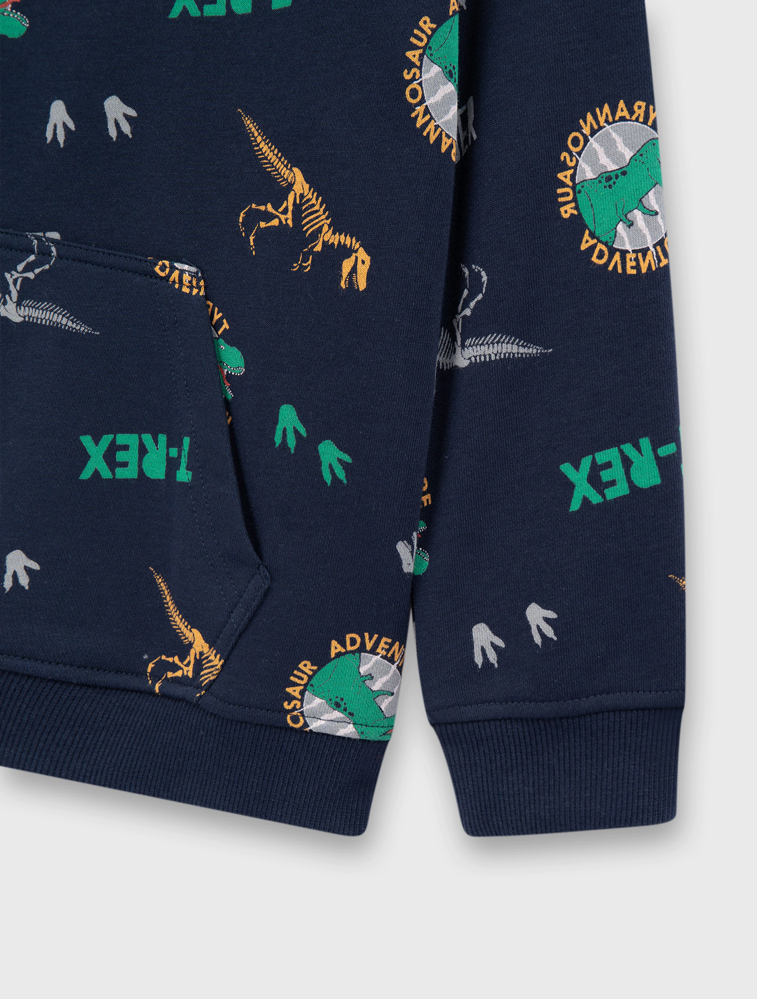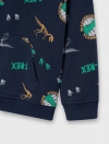 Áo nỉ bé trai có túi ốp, chất liệu vảy cá hình in tràn khủng long phù hợp với sơ thích của các bạn nhỏ.