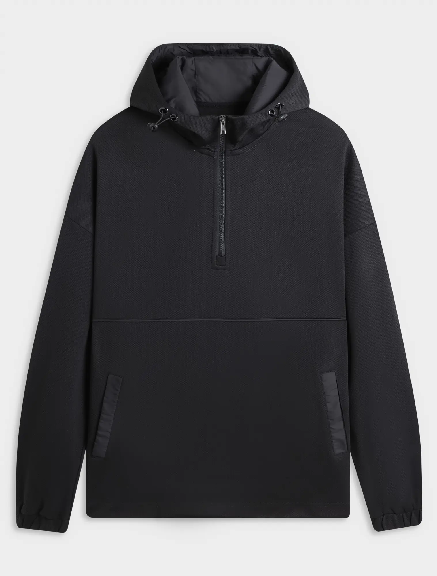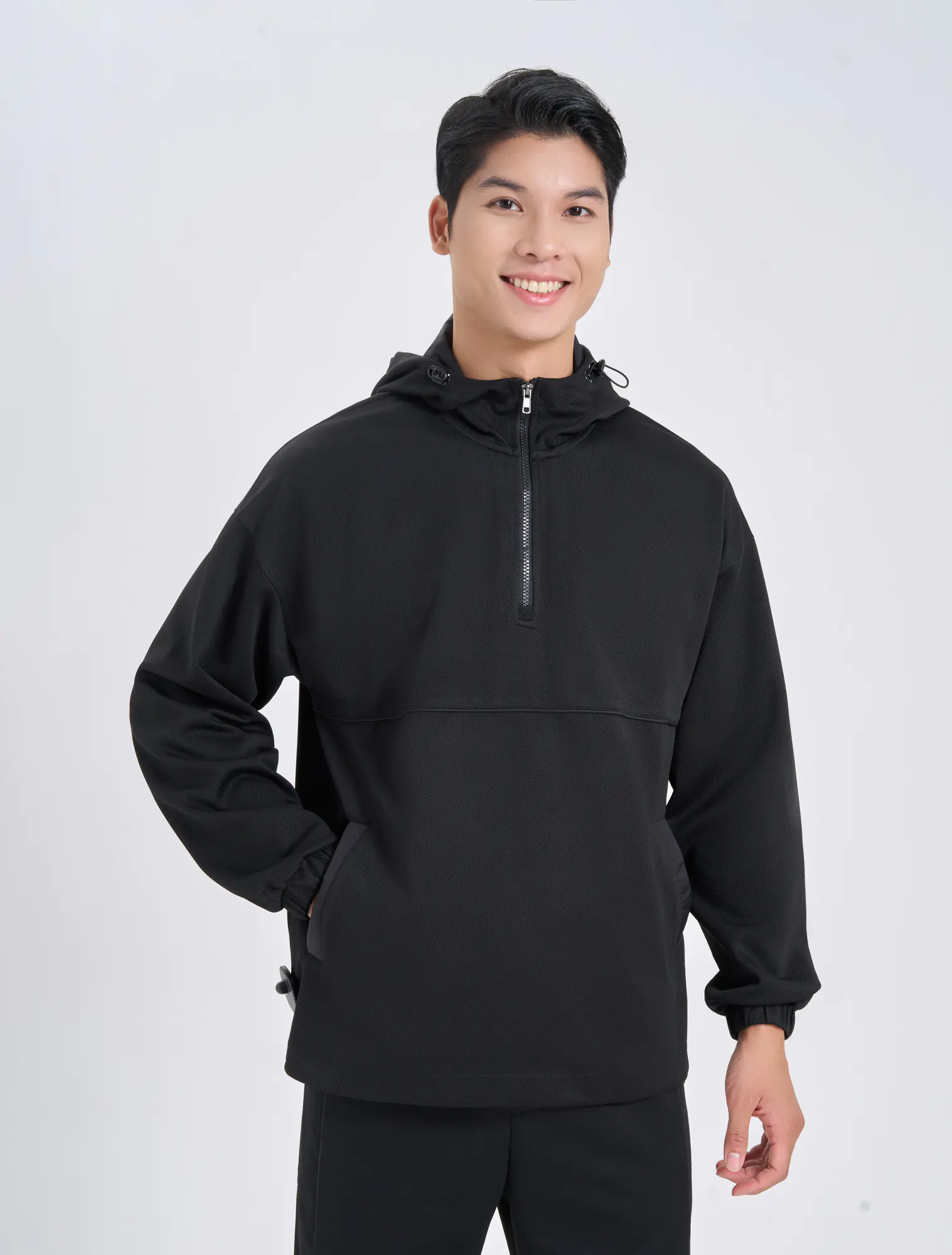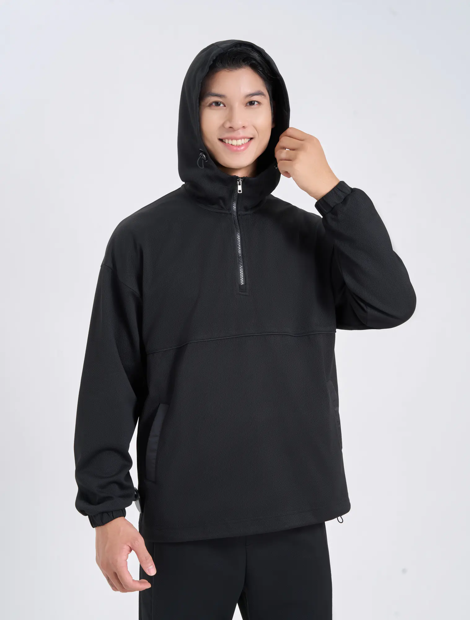 Áo khoác nỉ có mũ, dài tay, chui đầu mở khóa lửng. Có 2 túi thân trước phối vải gió, gấu luồn chun co giãn. Phù hợp nhiều hoàn cảnh sử dụng.