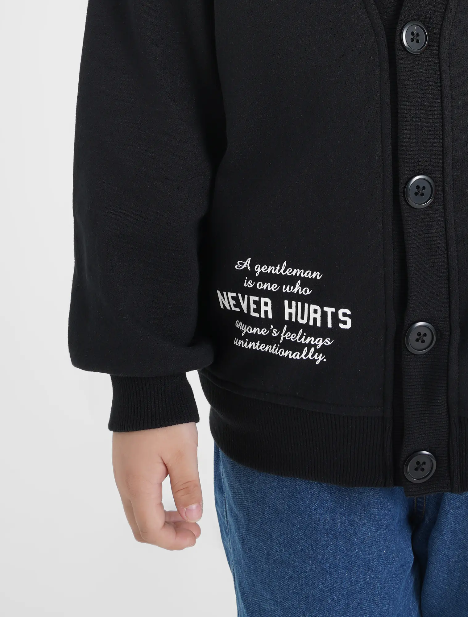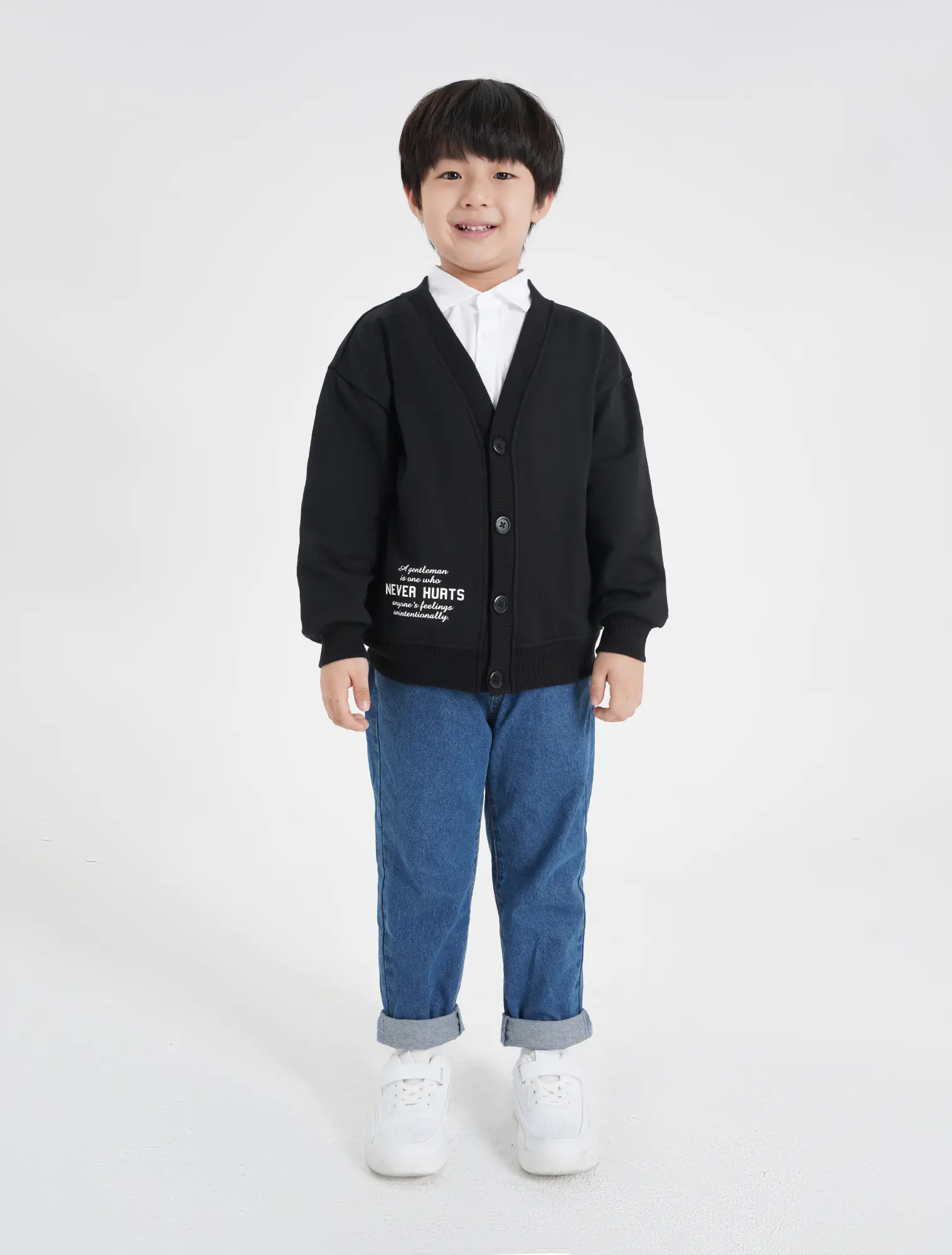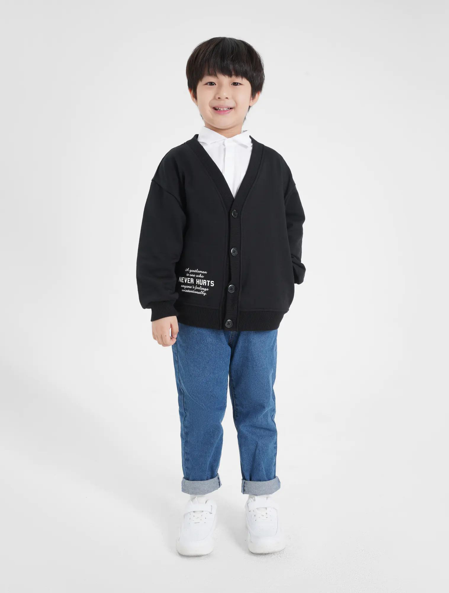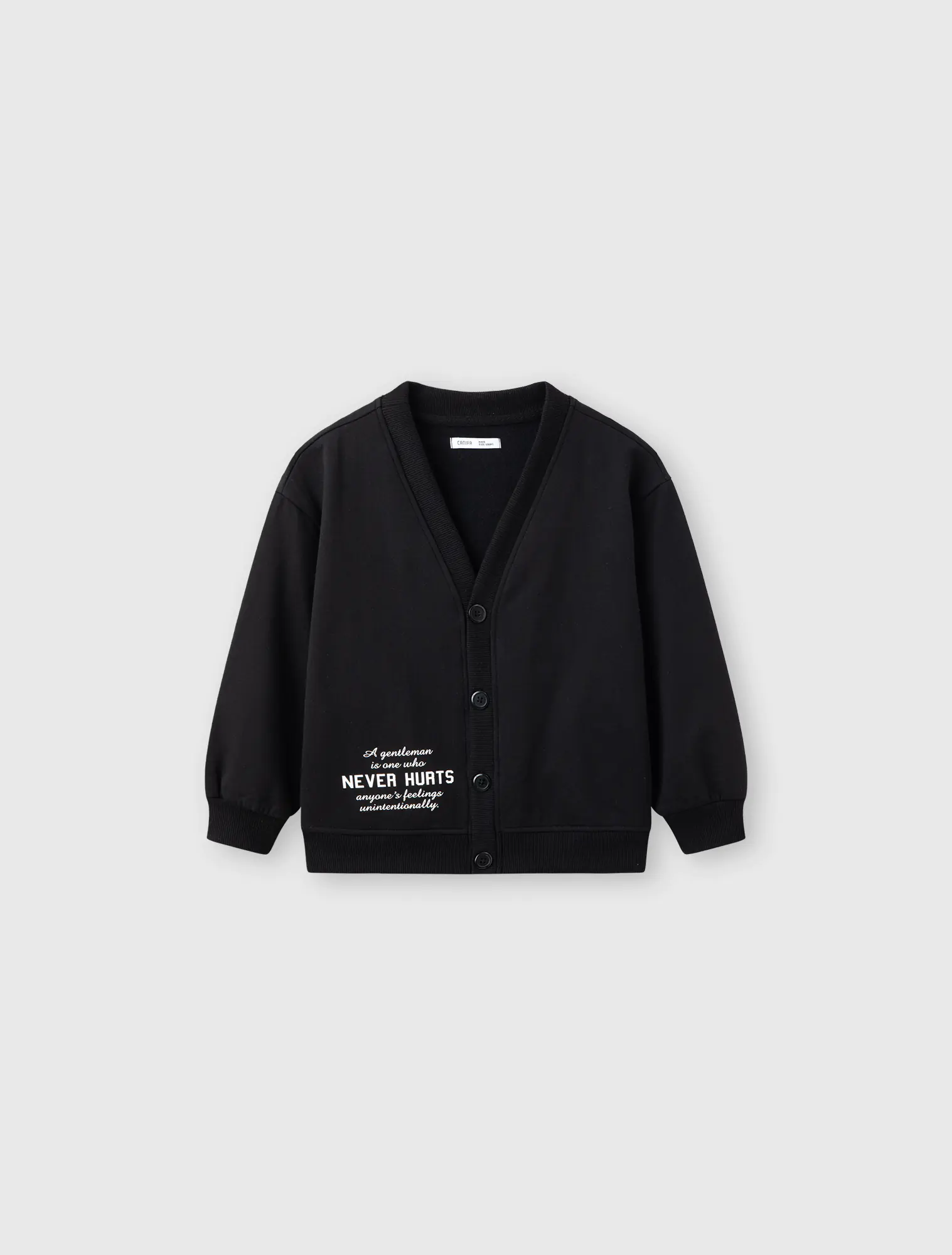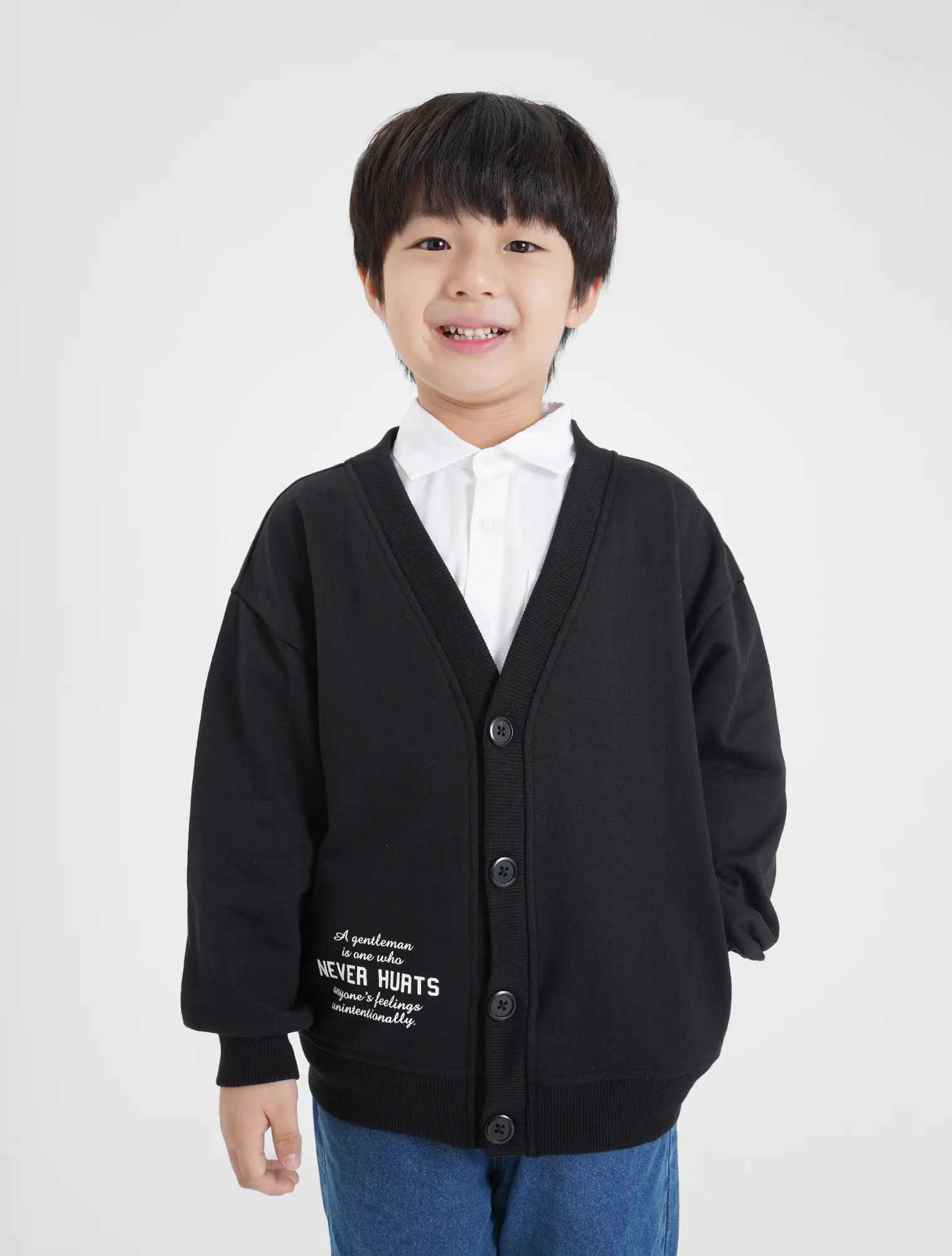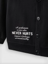 Áo khoác dệt kim bé trai. Áo cài cúc bấm, hình in chữ hiện đại, màu sắc kiểu dáng cơ bản, phù hợp bé trai.