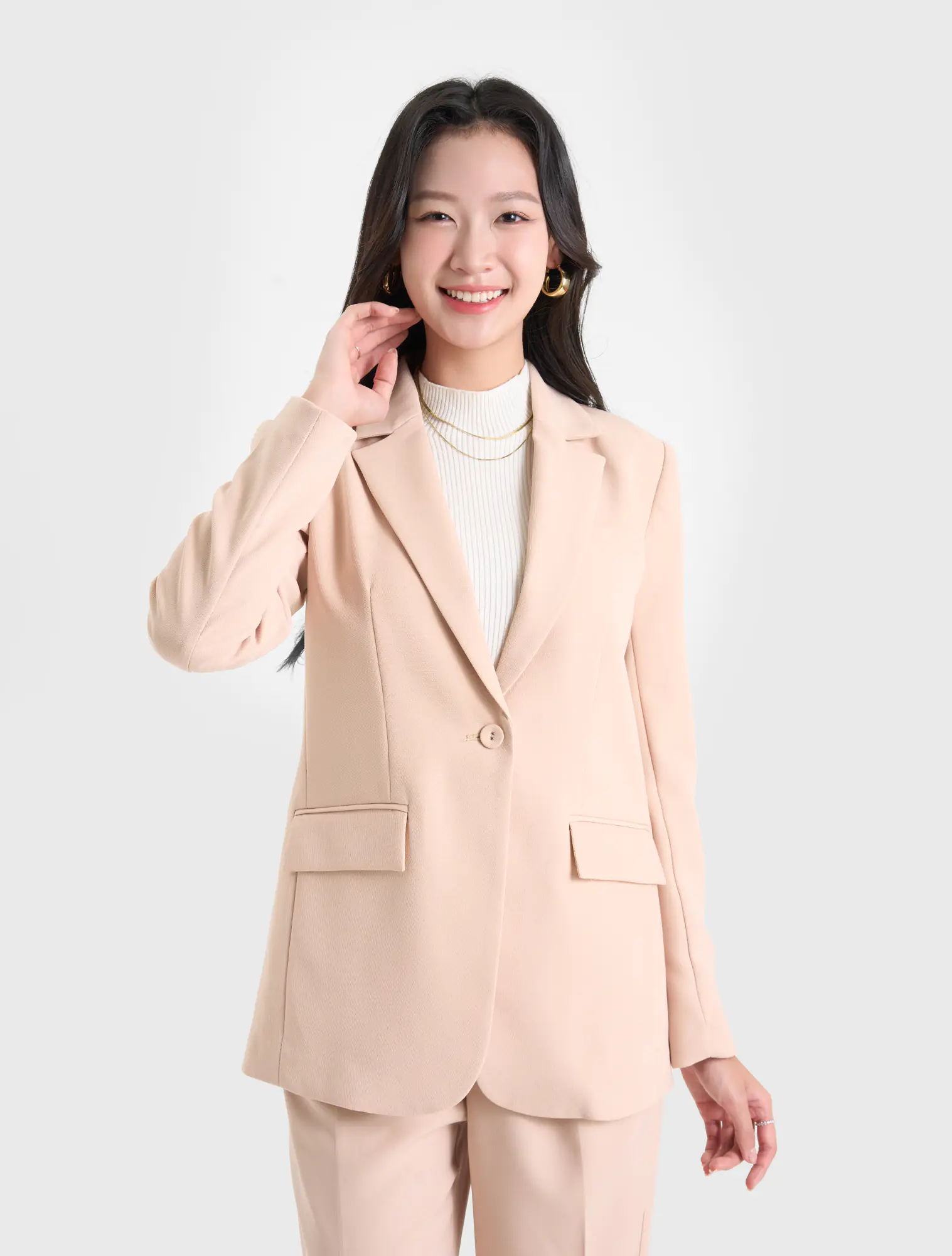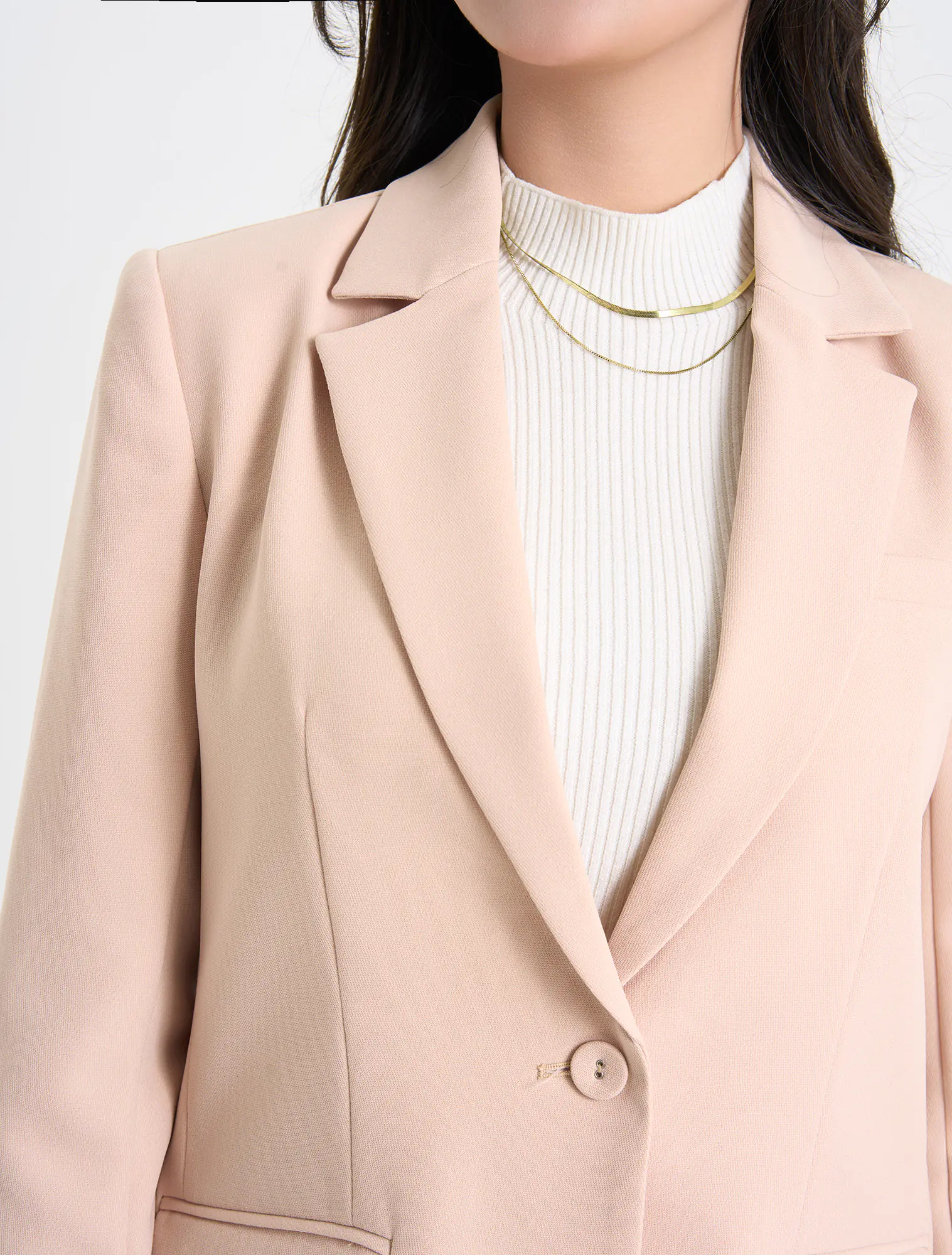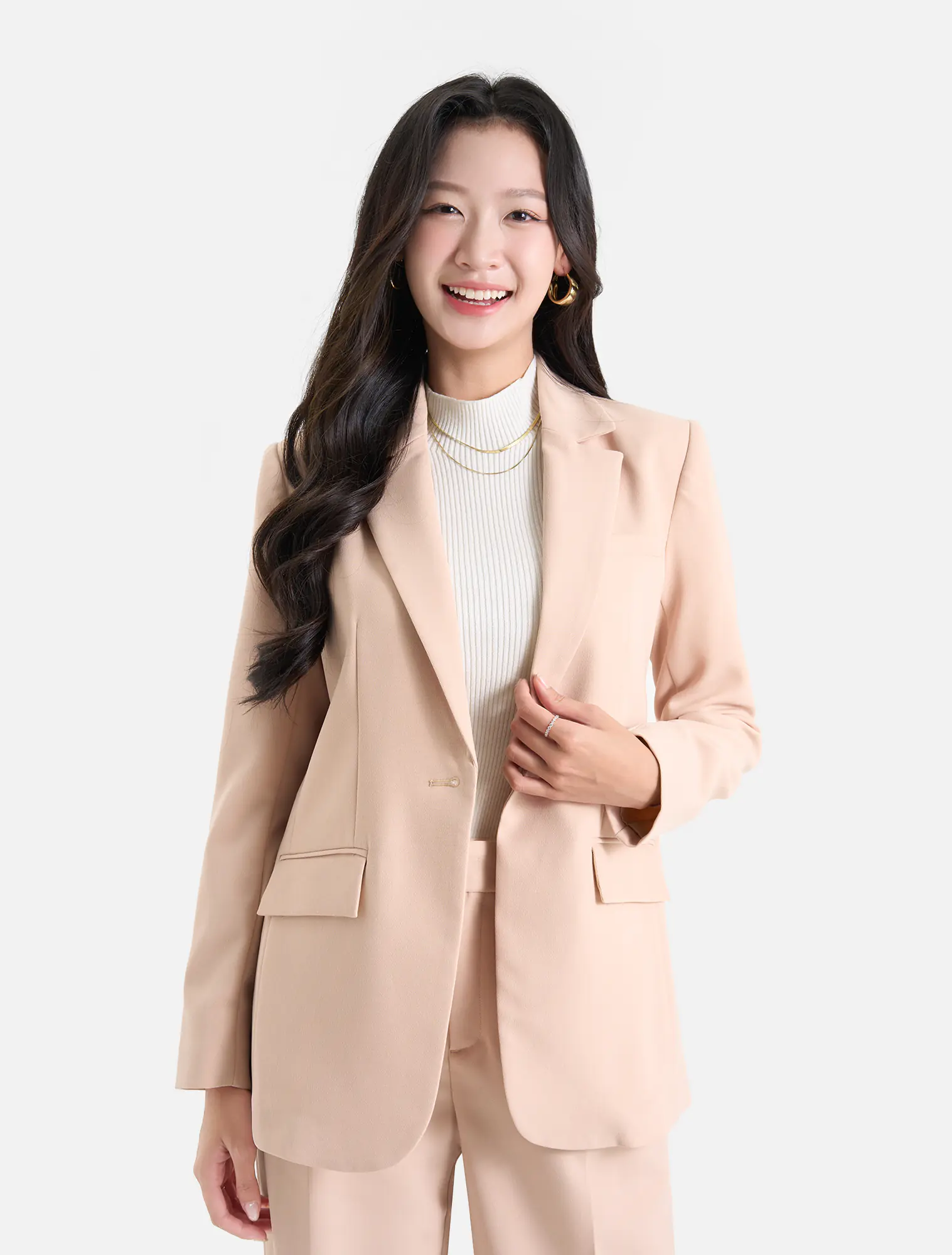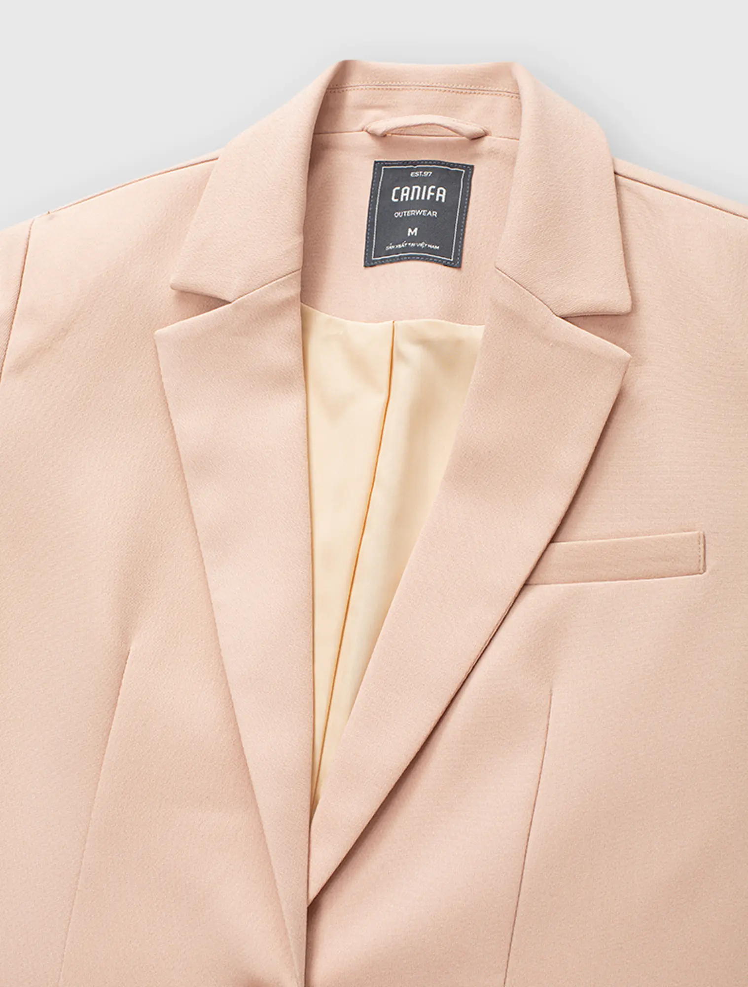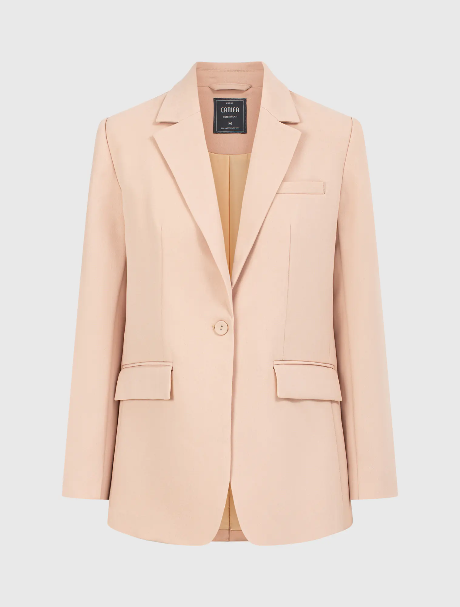 Áo blazer hai lớp dài tay, cổ bẻ ve, dáng suông. Chất liệu poly pha mang lại cảm giác mềm mại, đứng dáng. Phù hợp với môi trường công sở, dạo phố.