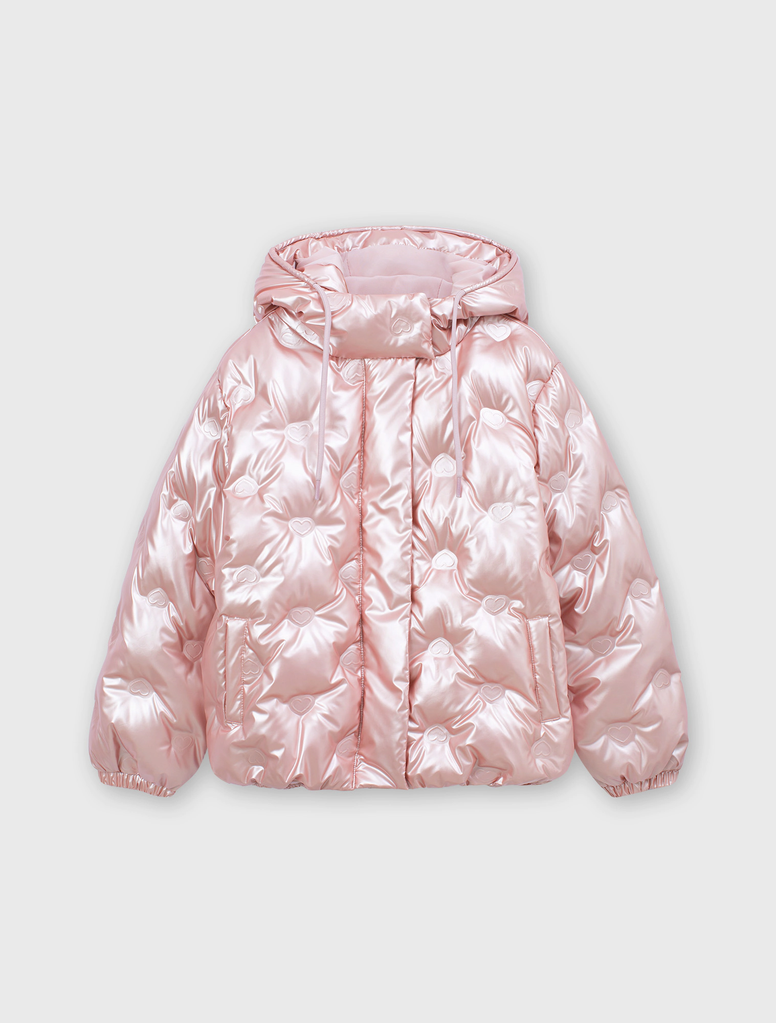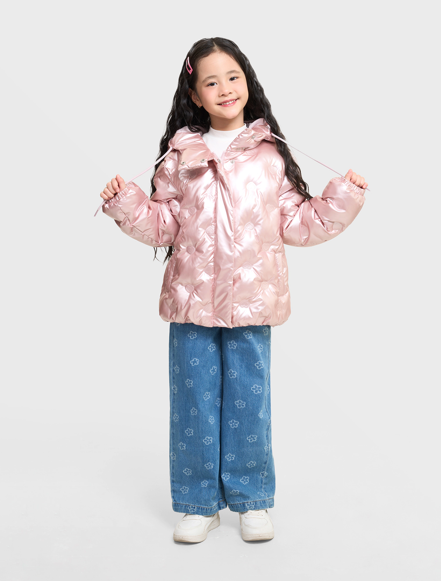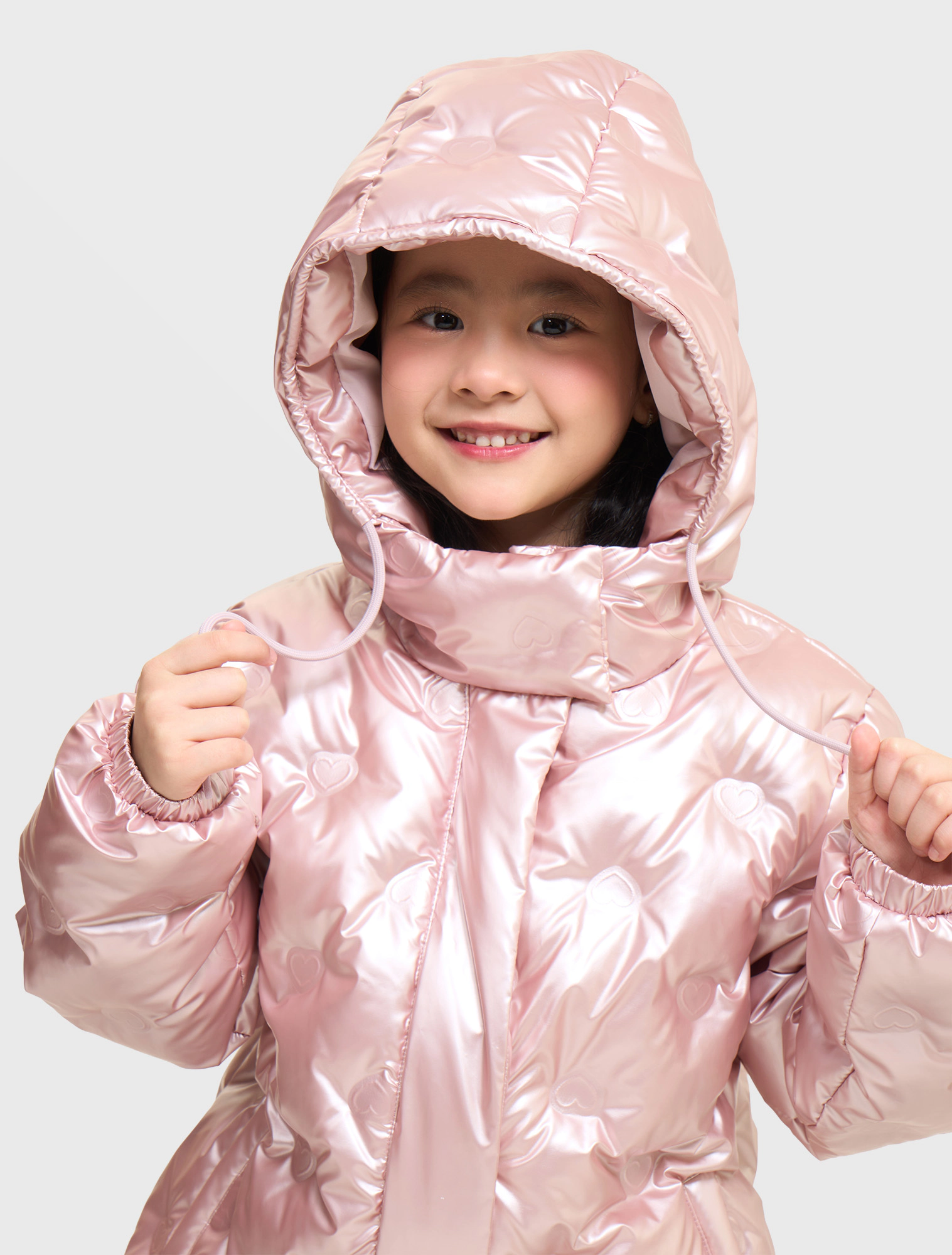 Áo khoác chần bông có mũ bé gái chống thấm nước. Phom áo thổi bông phồng thời trang. Bề mặt công nghệ ép dập hình trái tim hiện đại, ấn tượng. Áo 3 lớp dày dặn giữ ấm tốt. Màu sắc tươi sáng phù hợp bé gái.