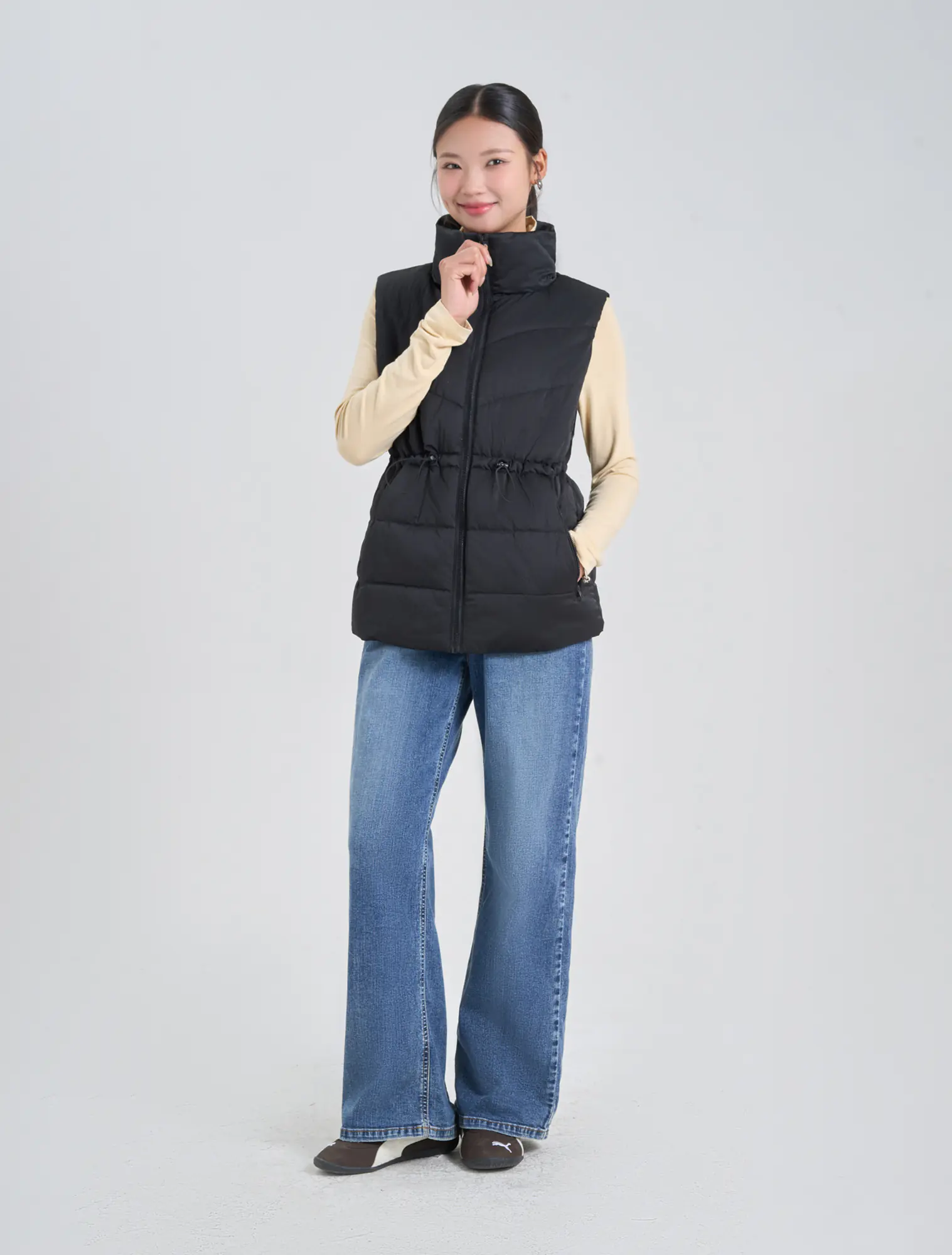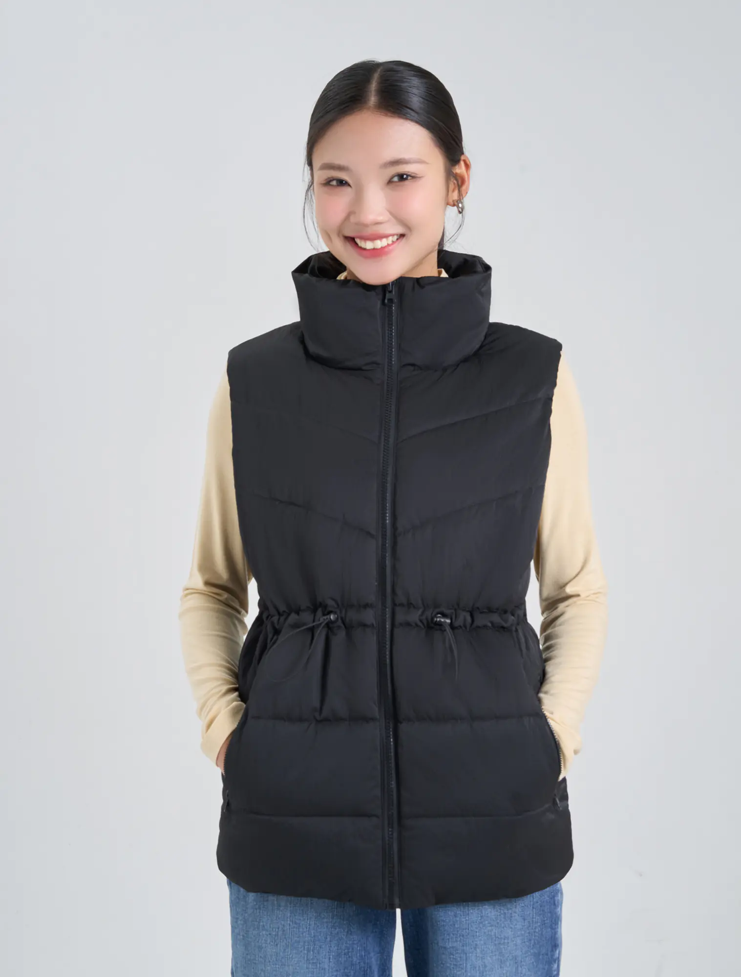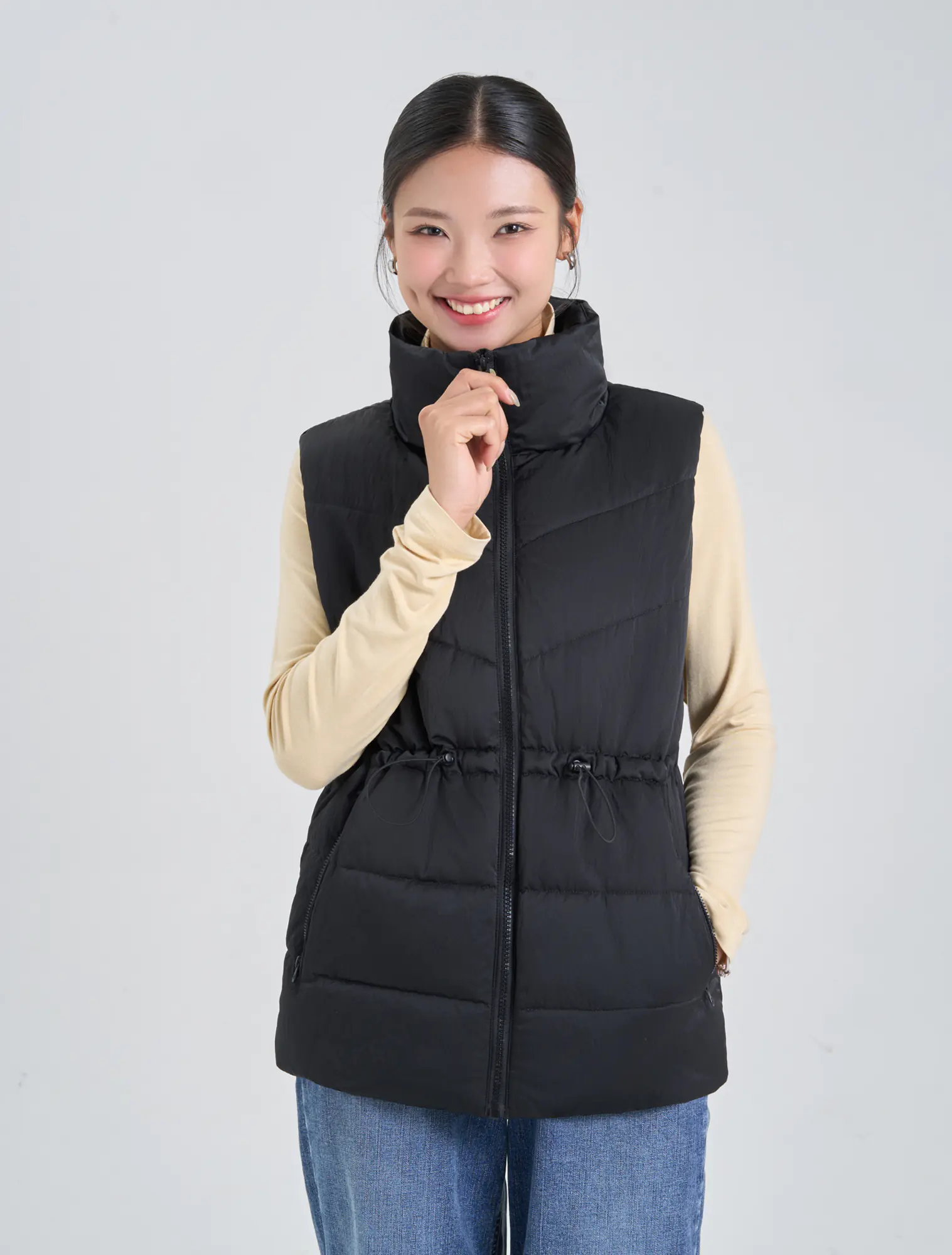 Áo khoác gilet bông thổi kéo khóa của nữ, chi tiết rút eo, có thể thay đổi kiểu mặc cho người sử dụng. Phù hợp với thời tiết lạnh sâu và có khả năng chống thấm nhẹ.