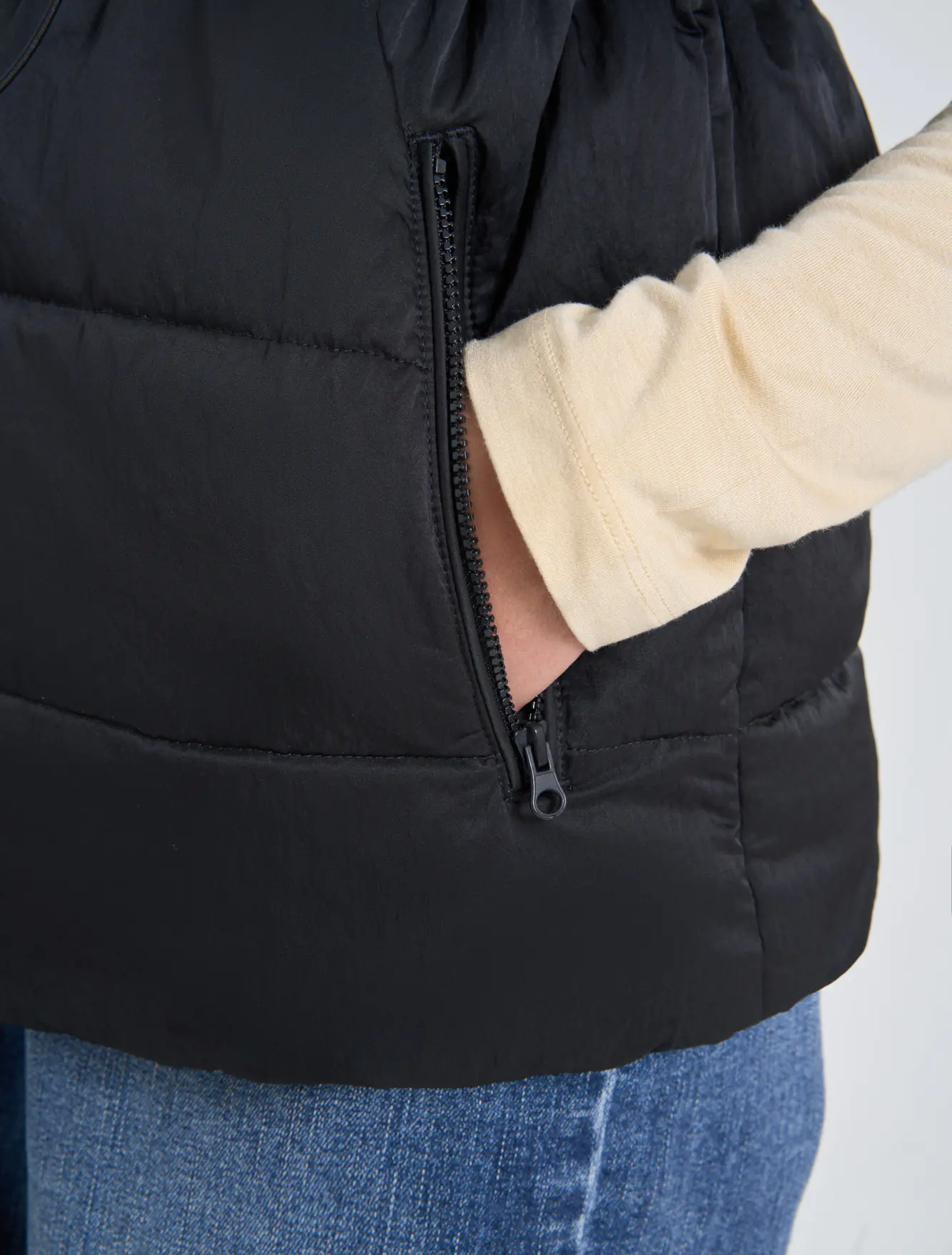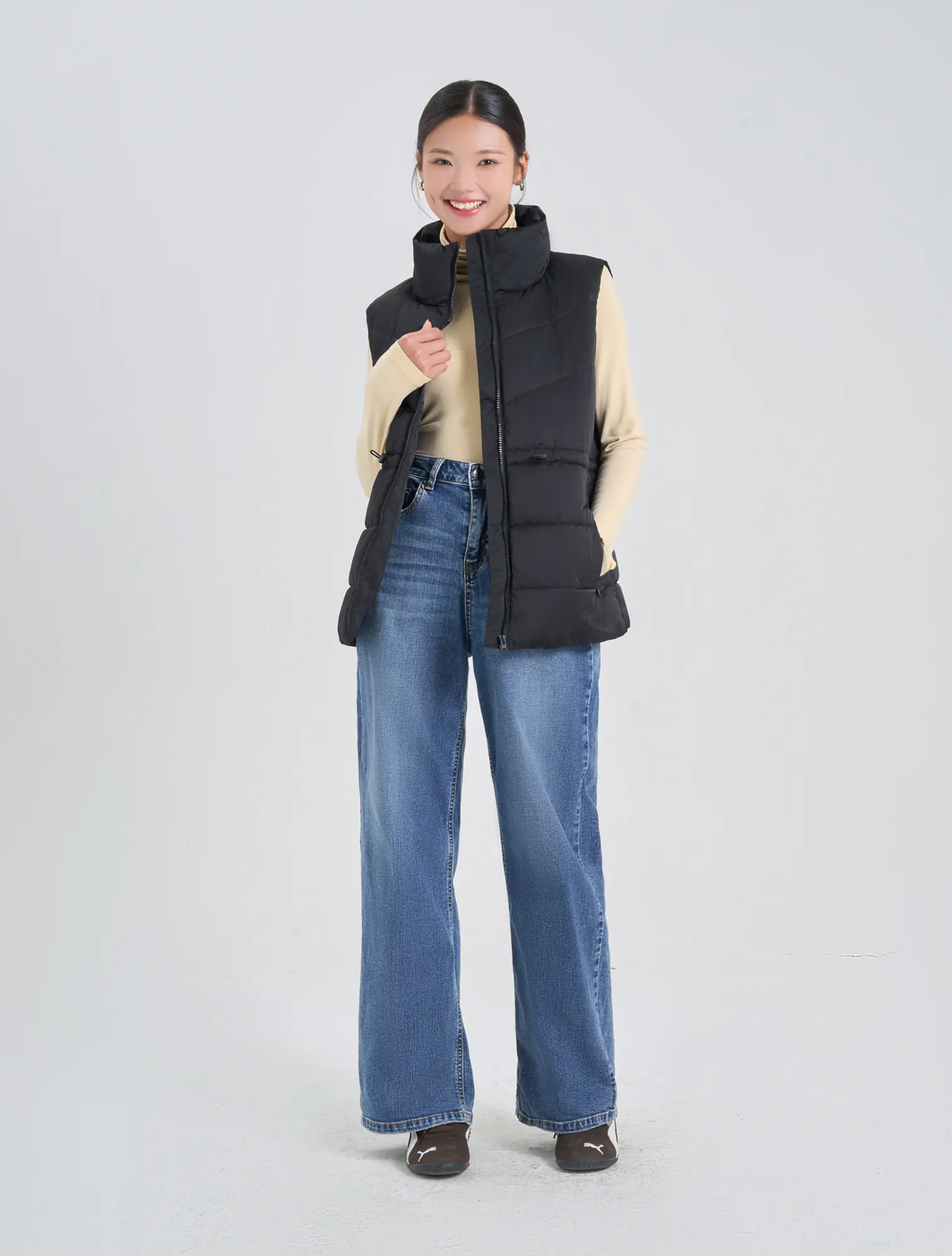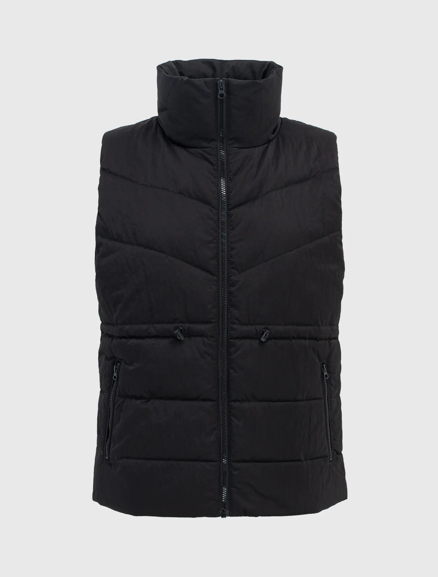 Áo khoác gilet bông thổi kéo khóa của nữ, chi tiết rút eo, có thể thay đổi kiểu mặc cho người sử dụng. Phù hợp với thời tiết lạnh sâu và có khả năng chống thấm nhẹ.