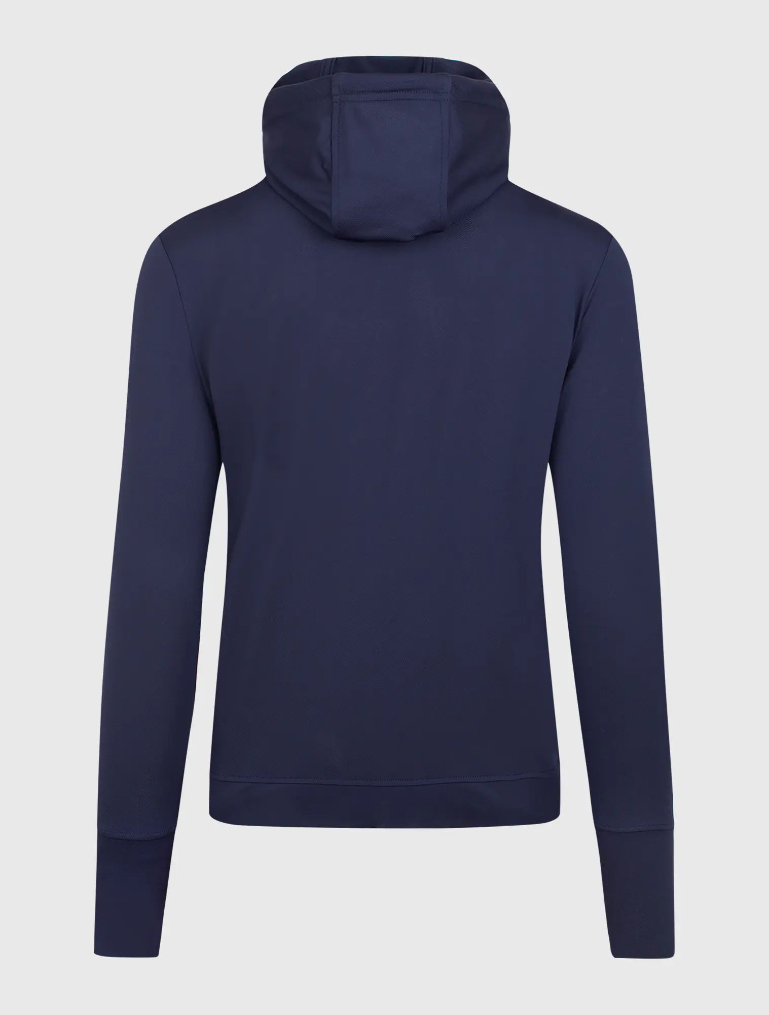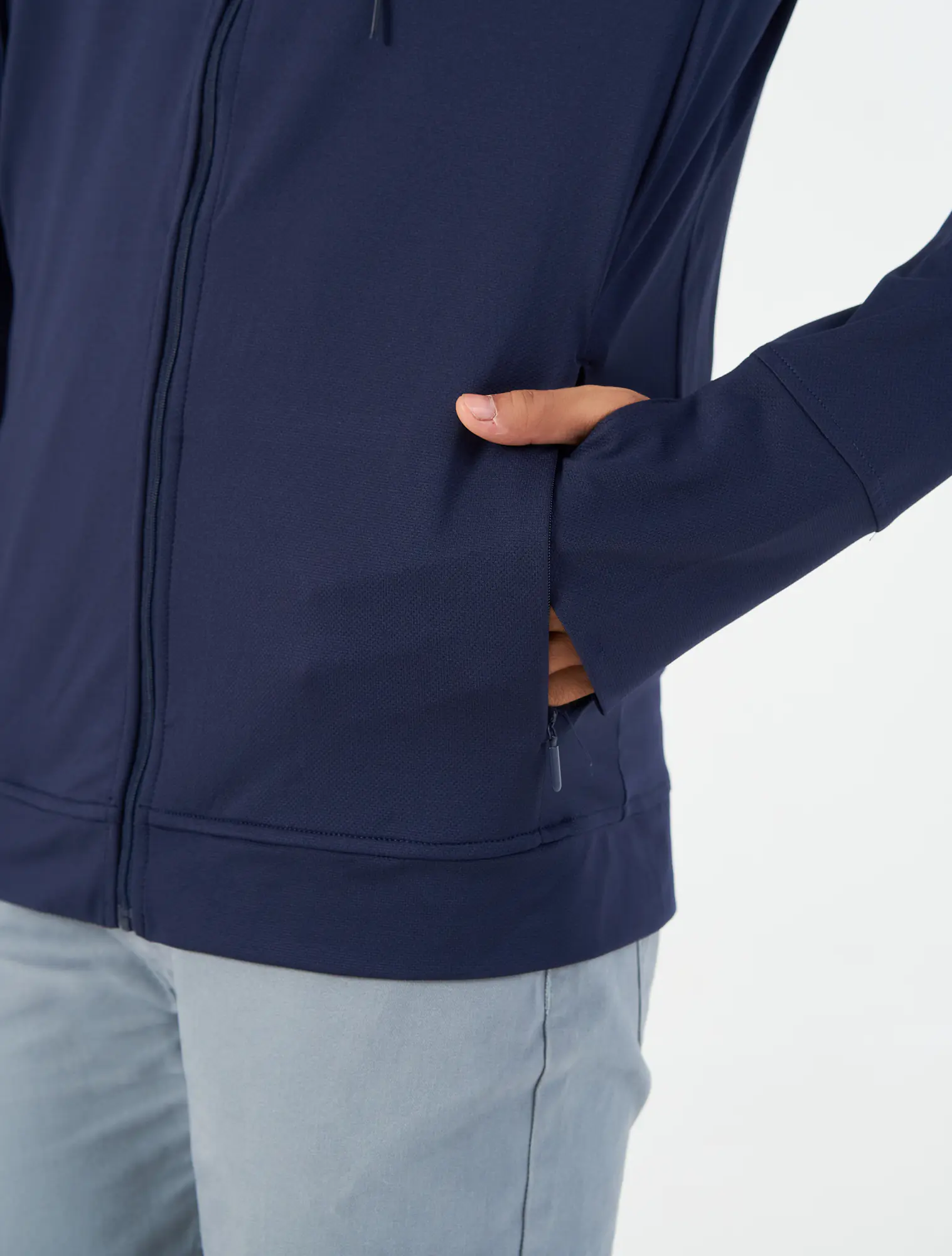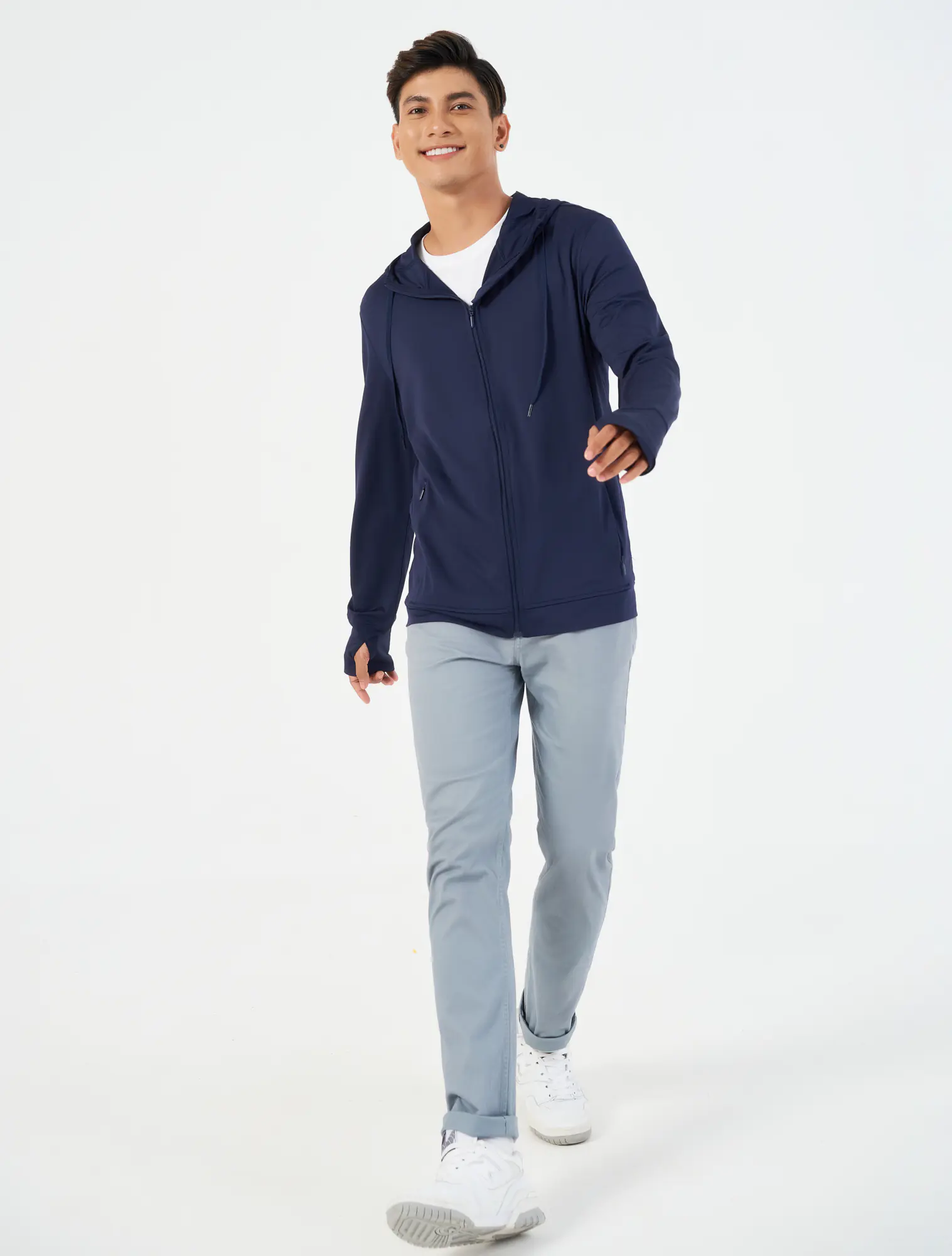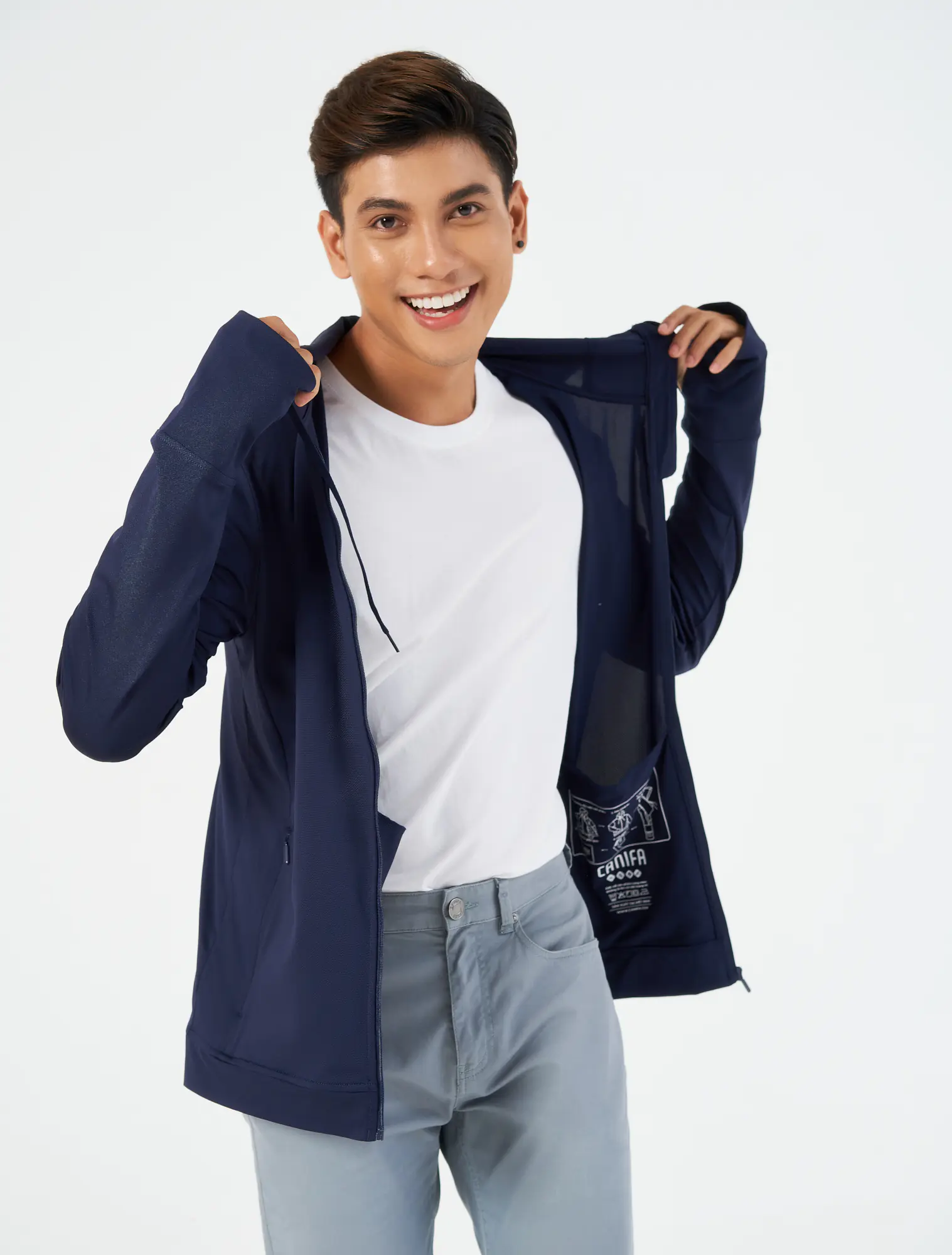 Áo khoác chống nắng chất liệu lacoste polyester spandex, có mũ, tay xẻ xỏ ngón, túi khoá 2 bên.
