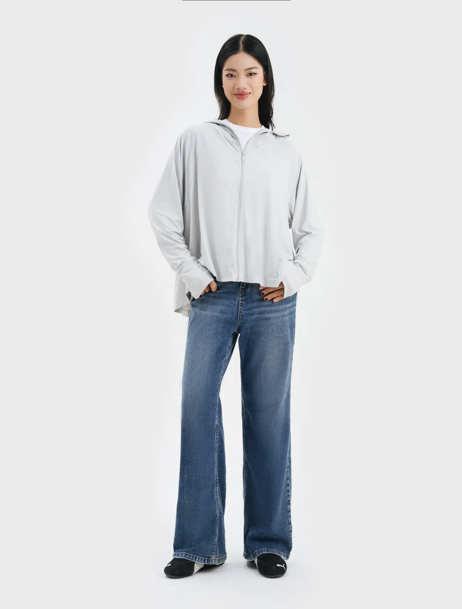 Áo khoác chống nắng nữ dáng rộng freesize, kiểu dáng cánh dơi tạo cảm giác thoải mái kể cả khi mặc nhiều đồ bên trong.