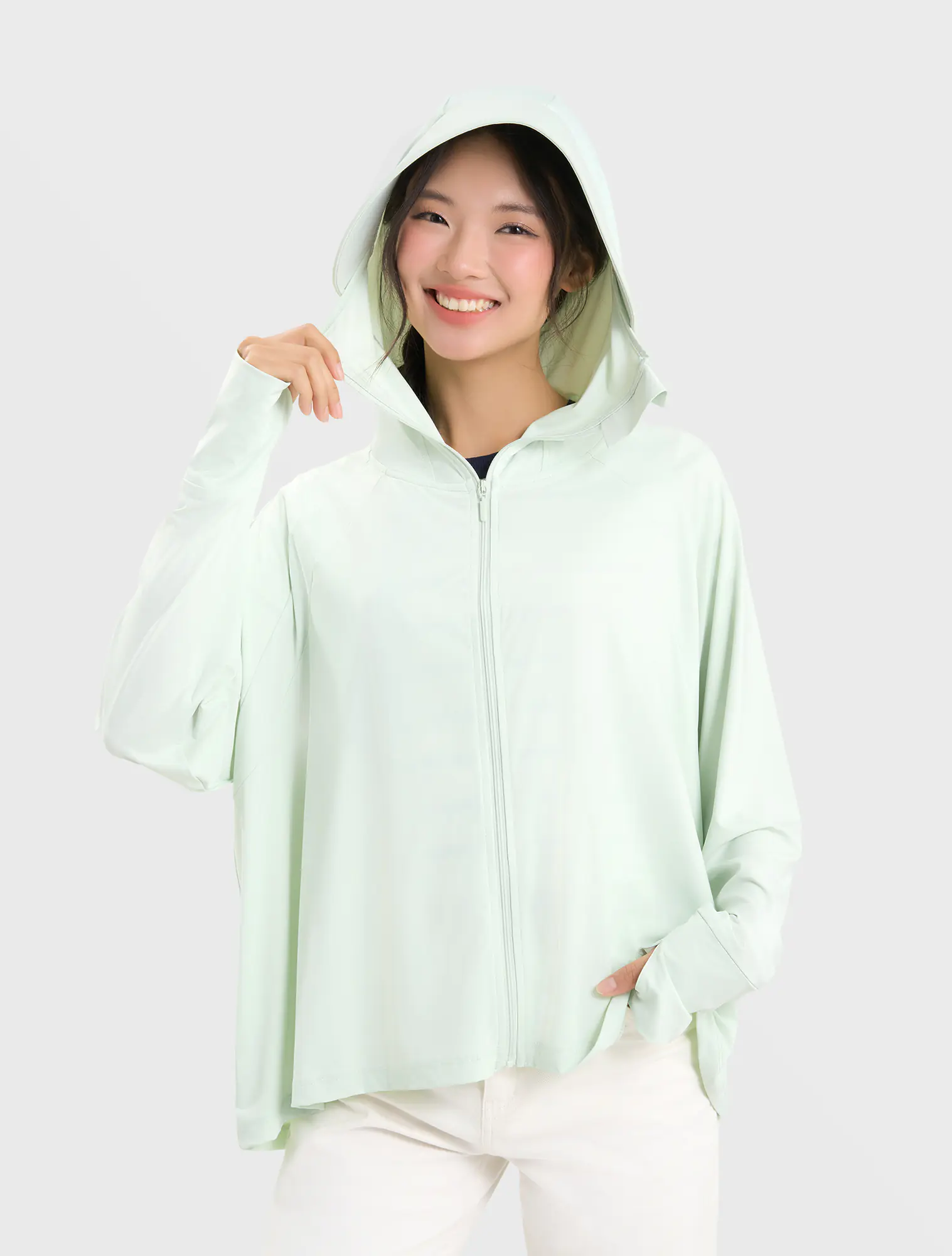 Áo khoác chống nắng nữ dáng rộng freesize, kiểu dáng cánh dơi tạo cảm giác thoải mái kể cả khi mặc nhiều đồ bên trong.