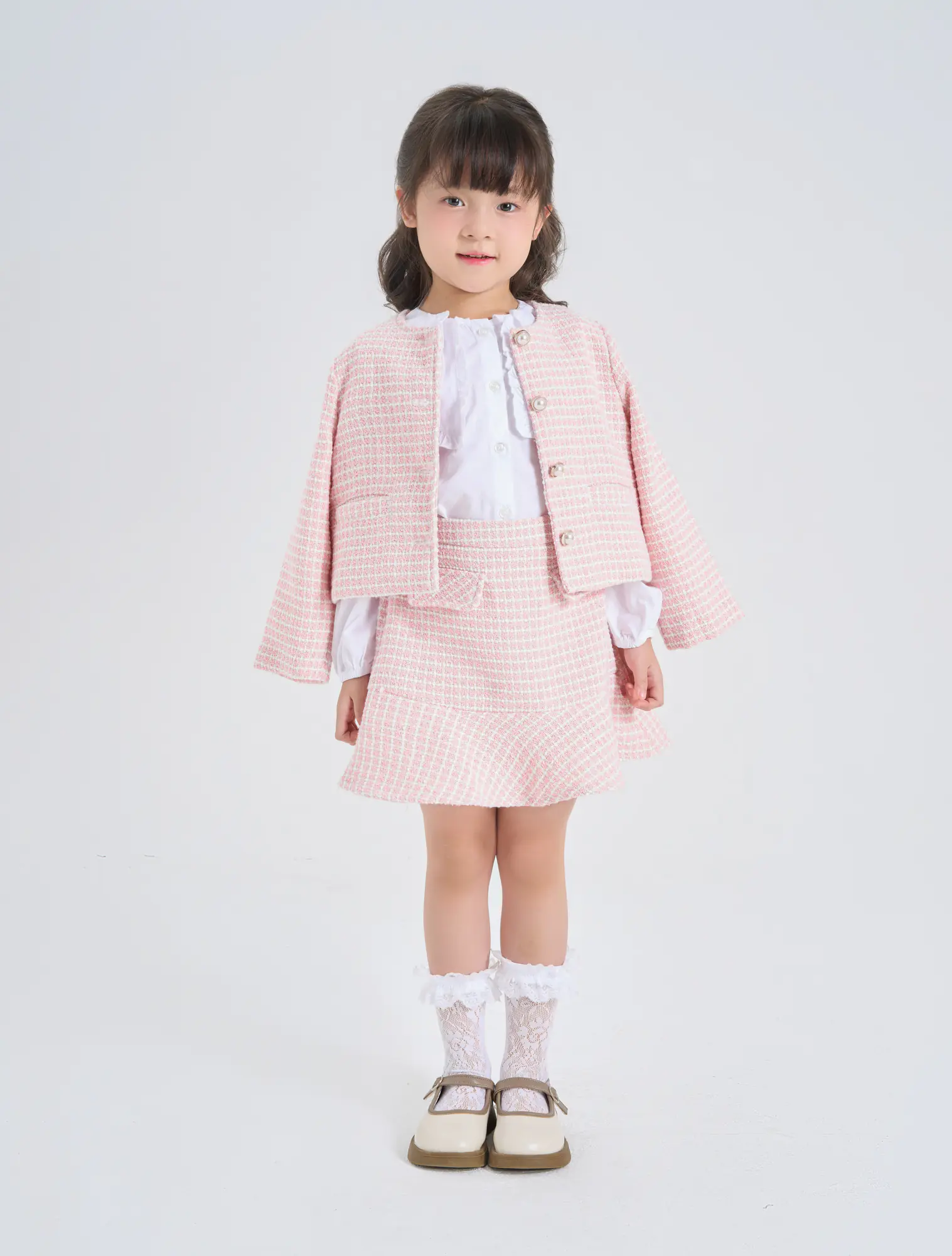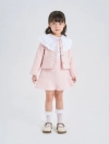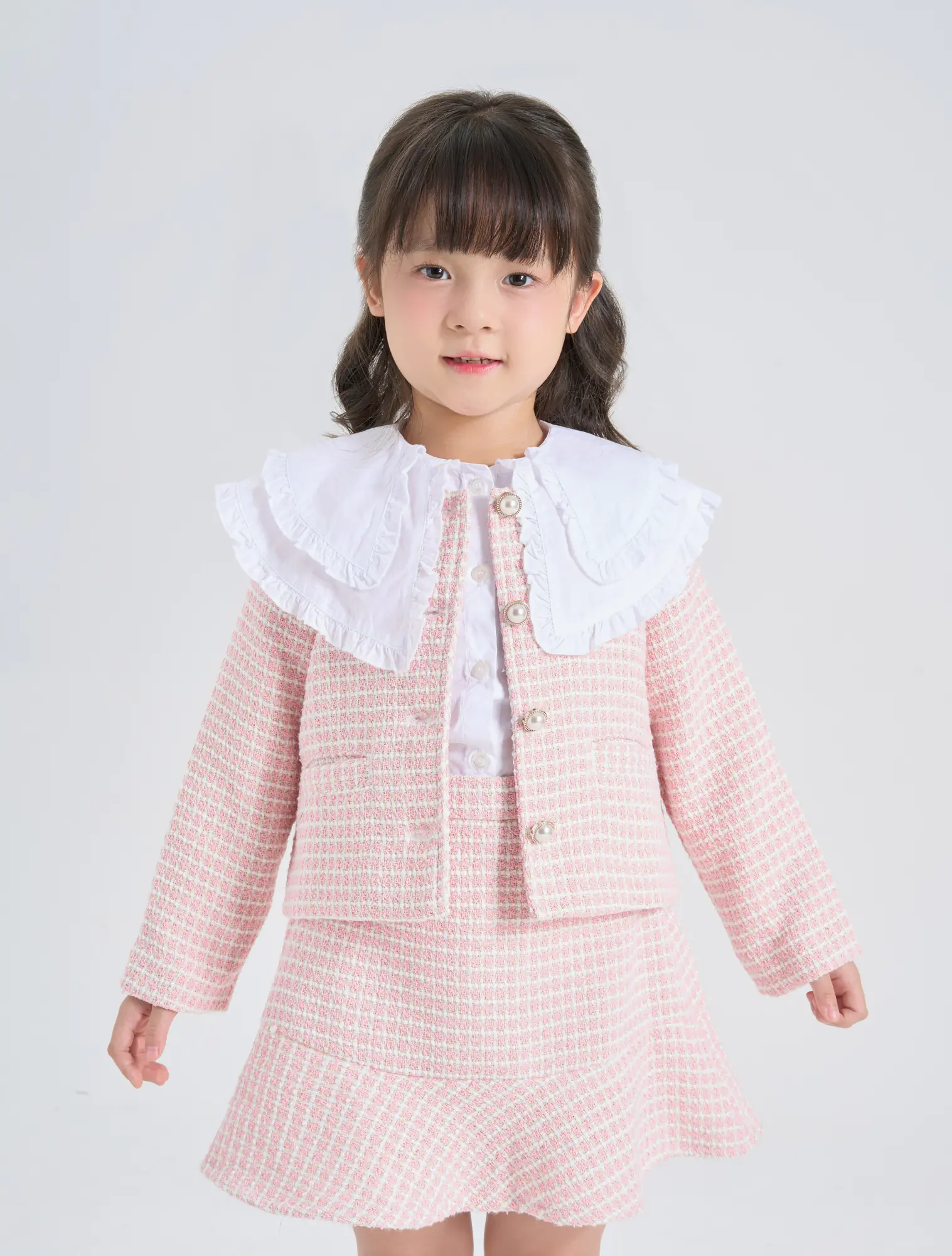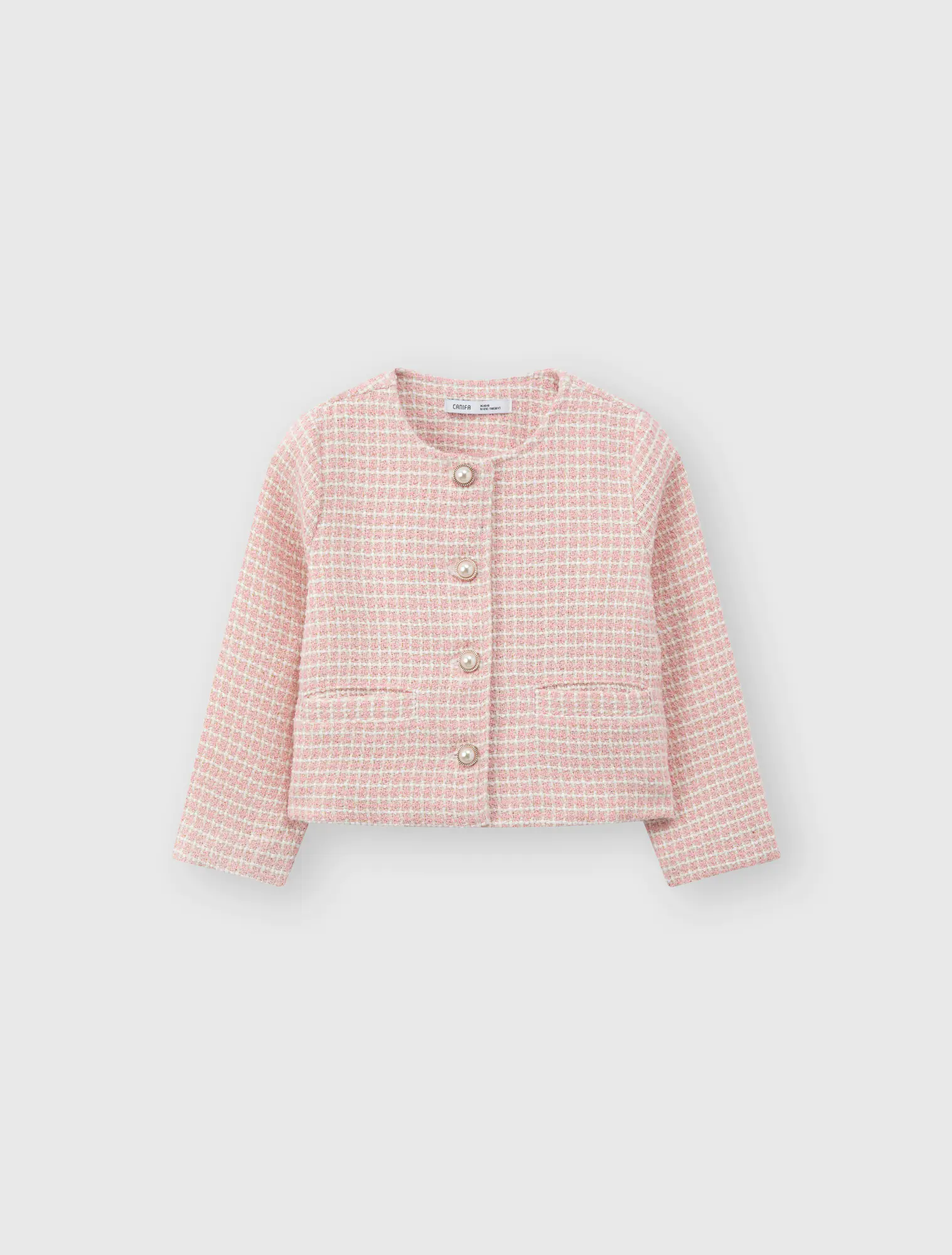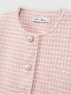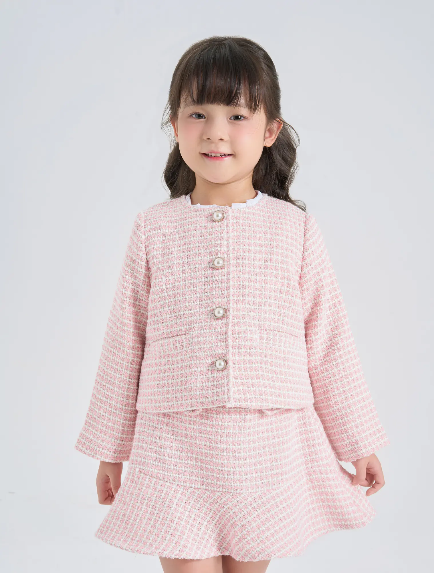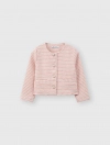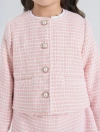 Áo khoác dạ tweed bé gái. Kiểu dáng hiện đại, cổ tròn, đính cúc giả ngọc trai điệu đà, nữ tính, dễ kết hợp đồ mùa đông.