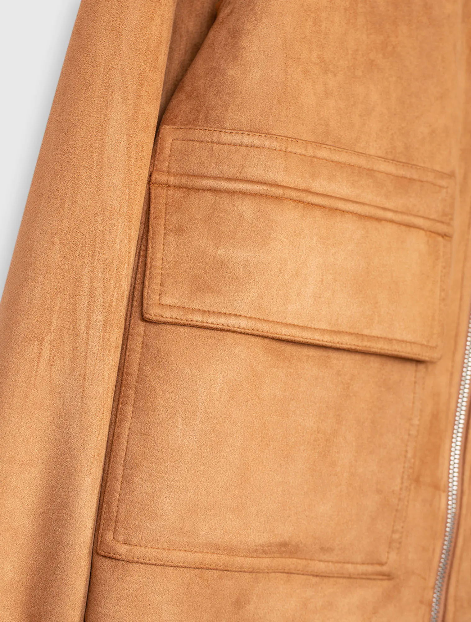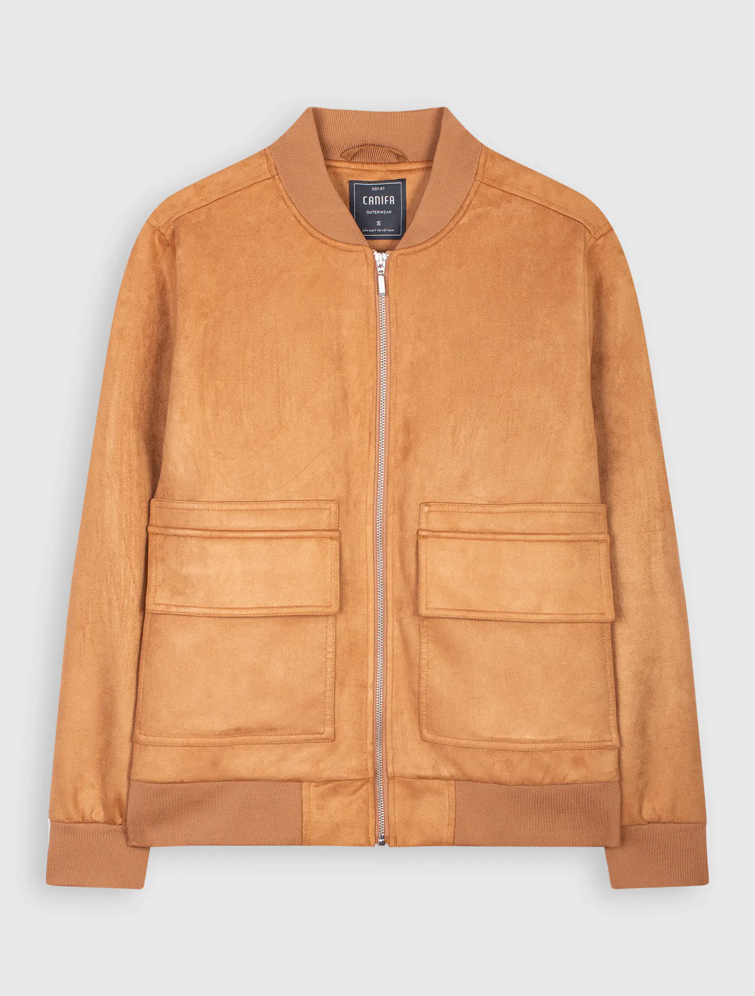 Áo khoác bomber da lộn. Mở khoá thân trước, túi hộp 2 bên. Gấu áo, cổ áo dùng bo dệt