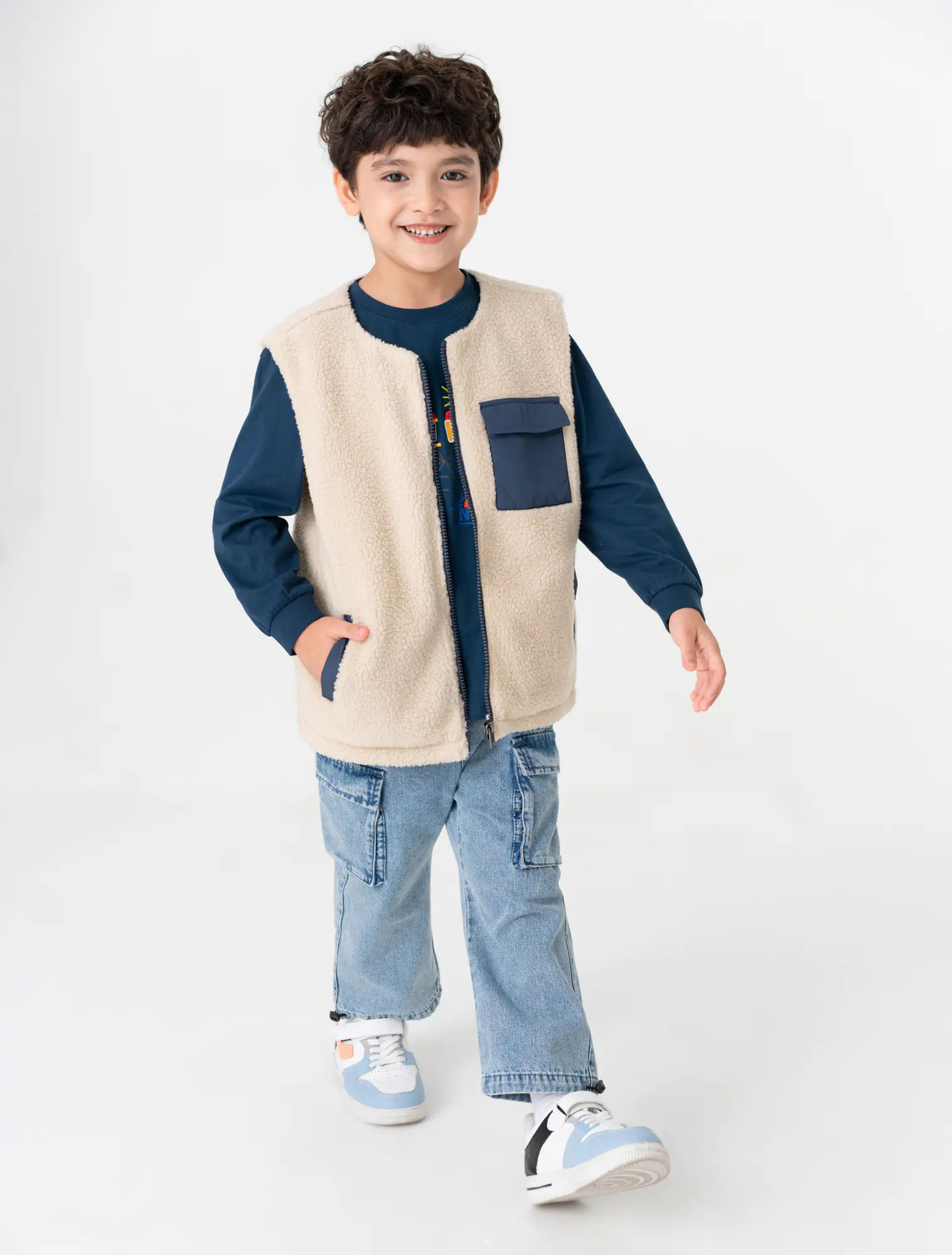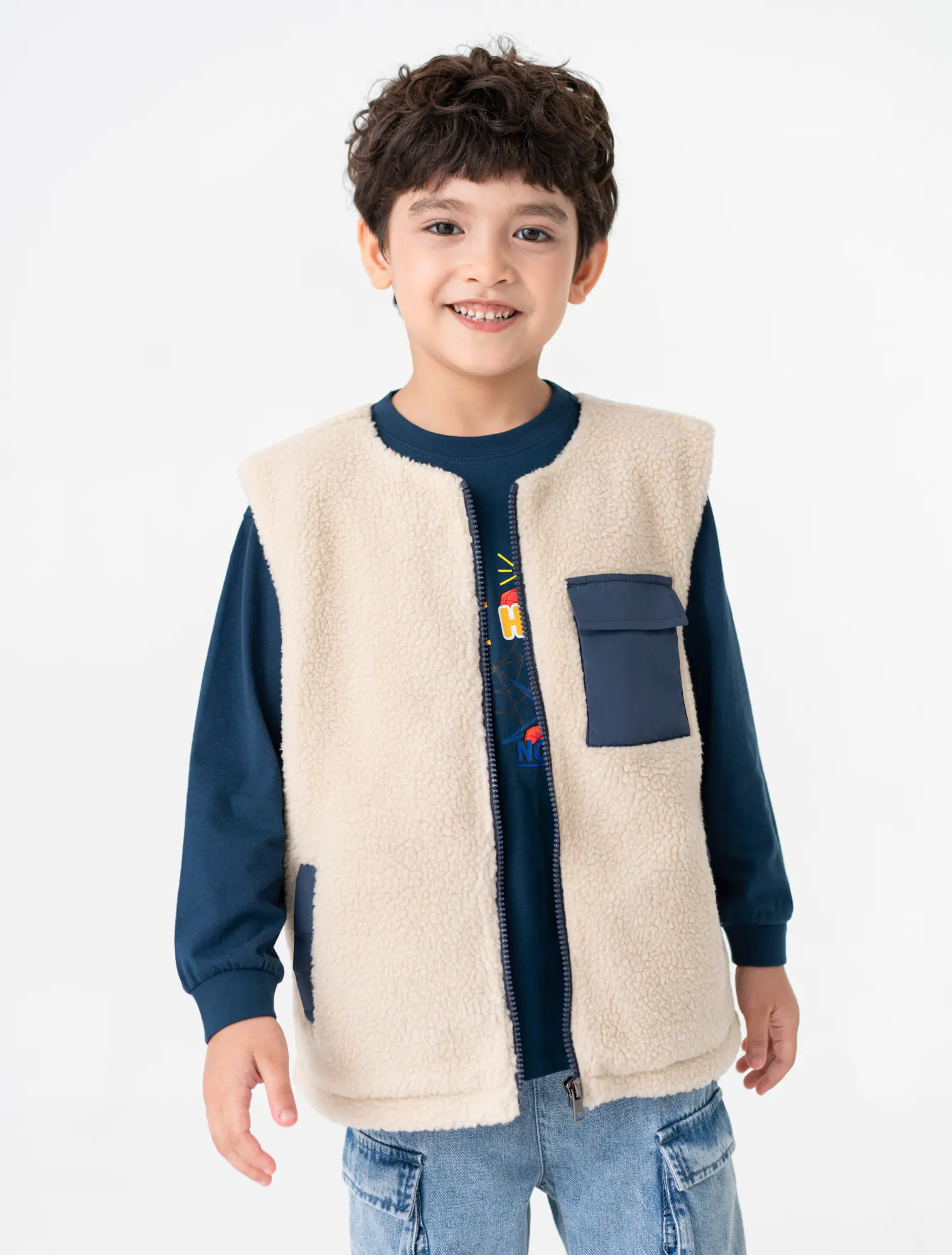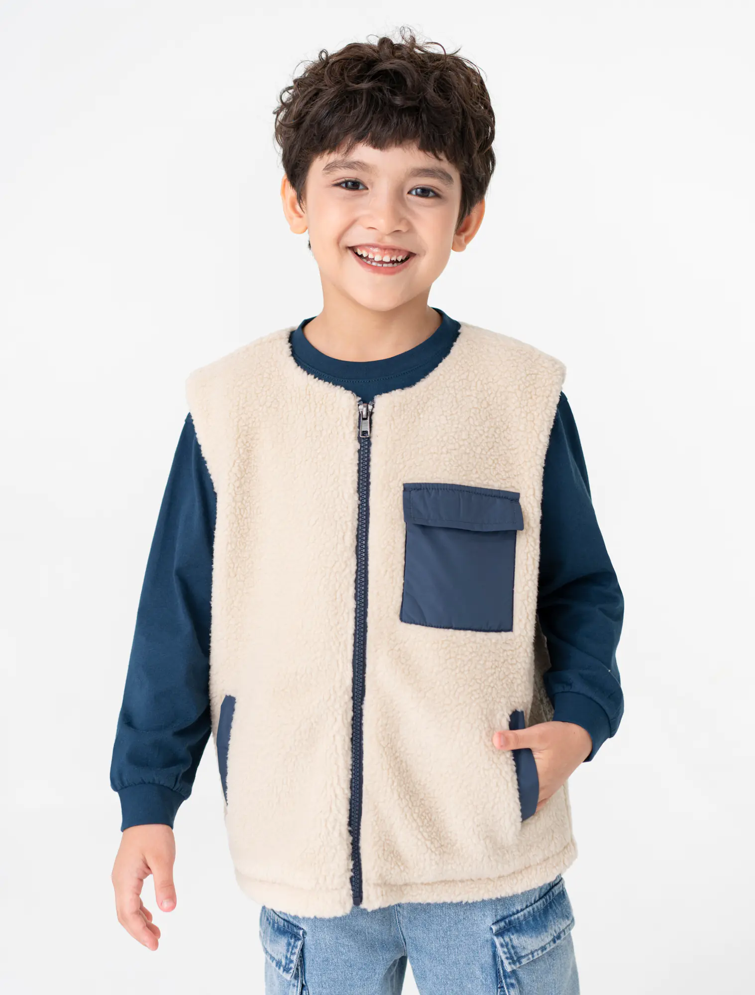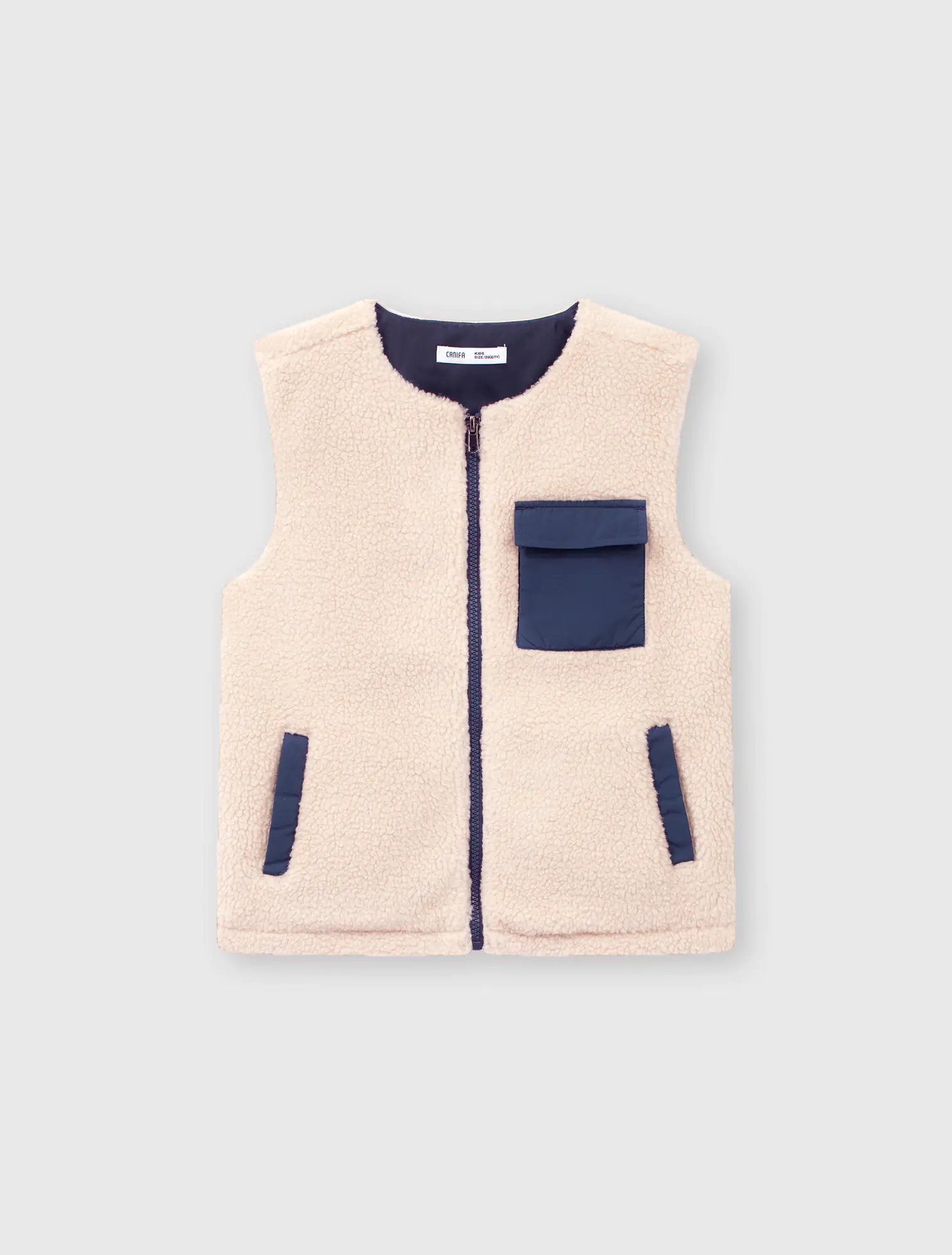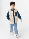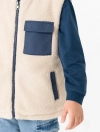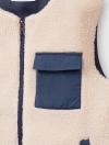 Áo khoác gilet 2 lớp cổ chữ tròn, tay sát nách. Cài khóa kéo phía trước, ốp túi hộp phối màu. Có hai túi cơi phối màu phía trước.