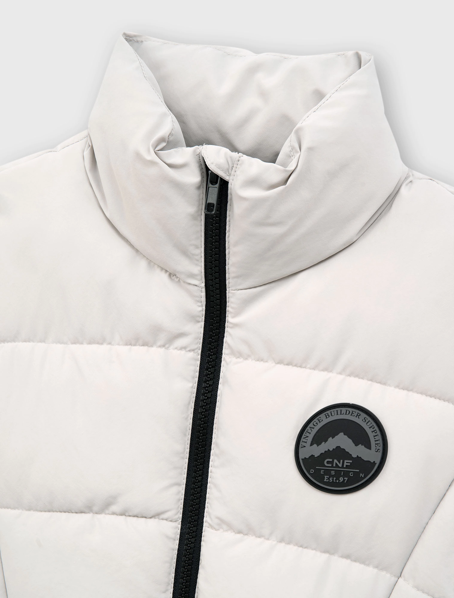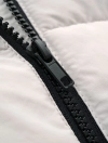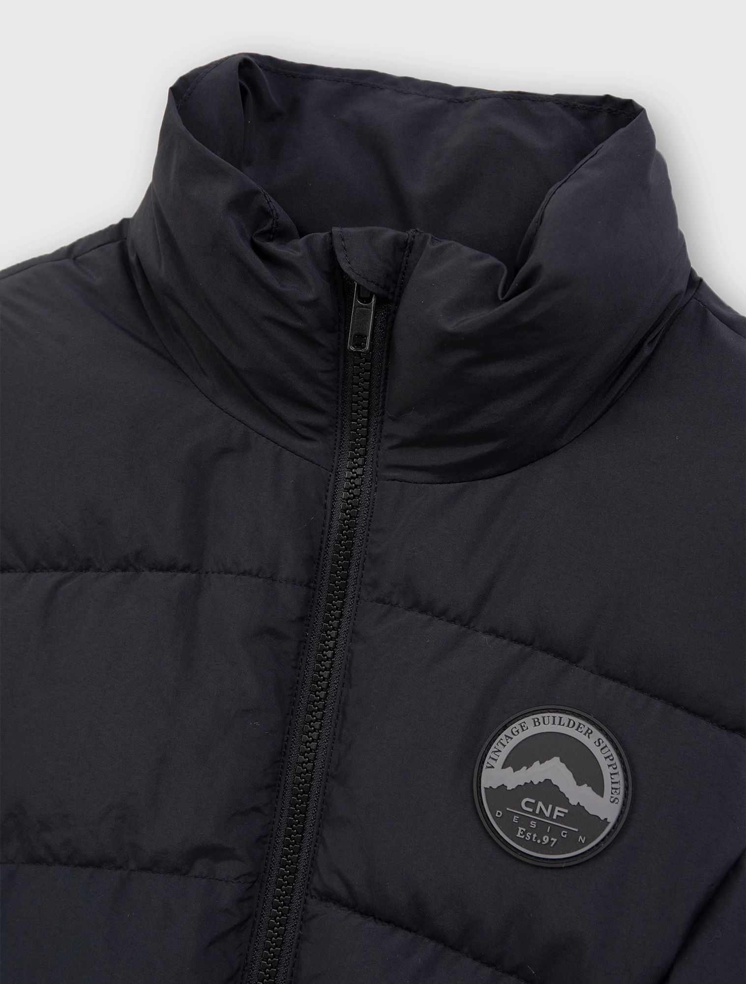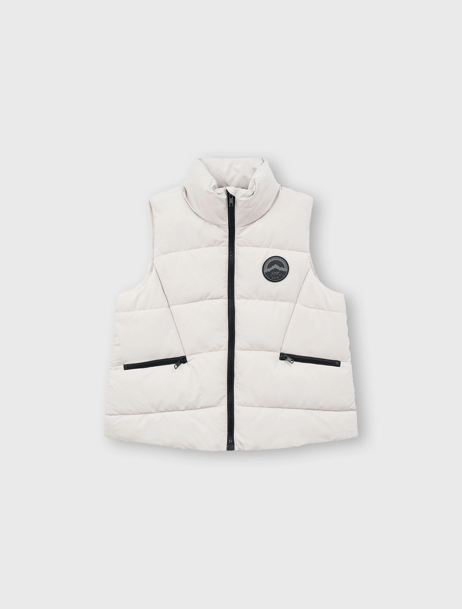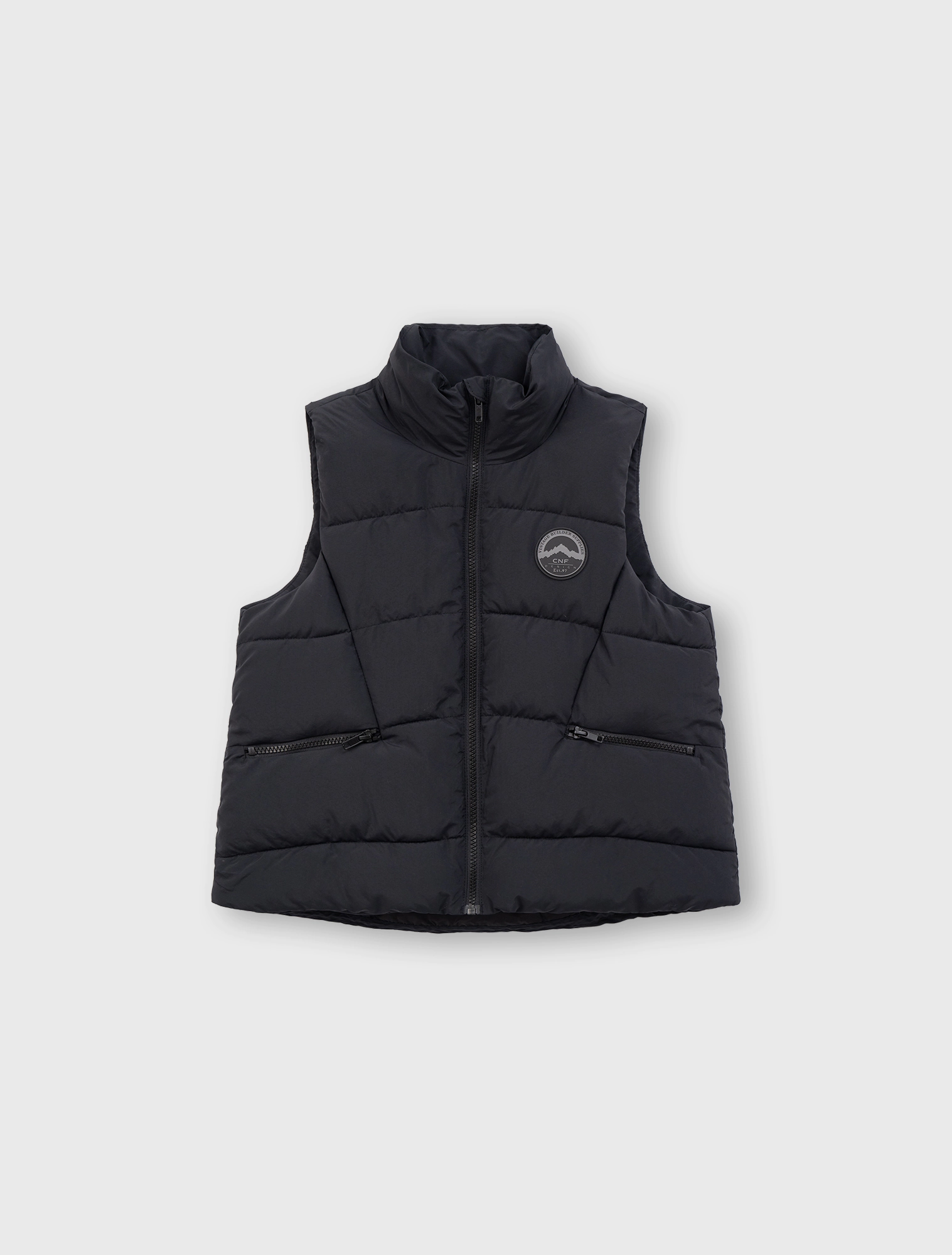 Áo gilet chất liệu vải đặc biệt chống thấm nước, có cổ cao, tay sát nách. Cài khóa kéo phía trước. Có hai túi kéo khóa phía trước, đính nhãn cao su trang trí ở bên.