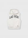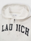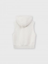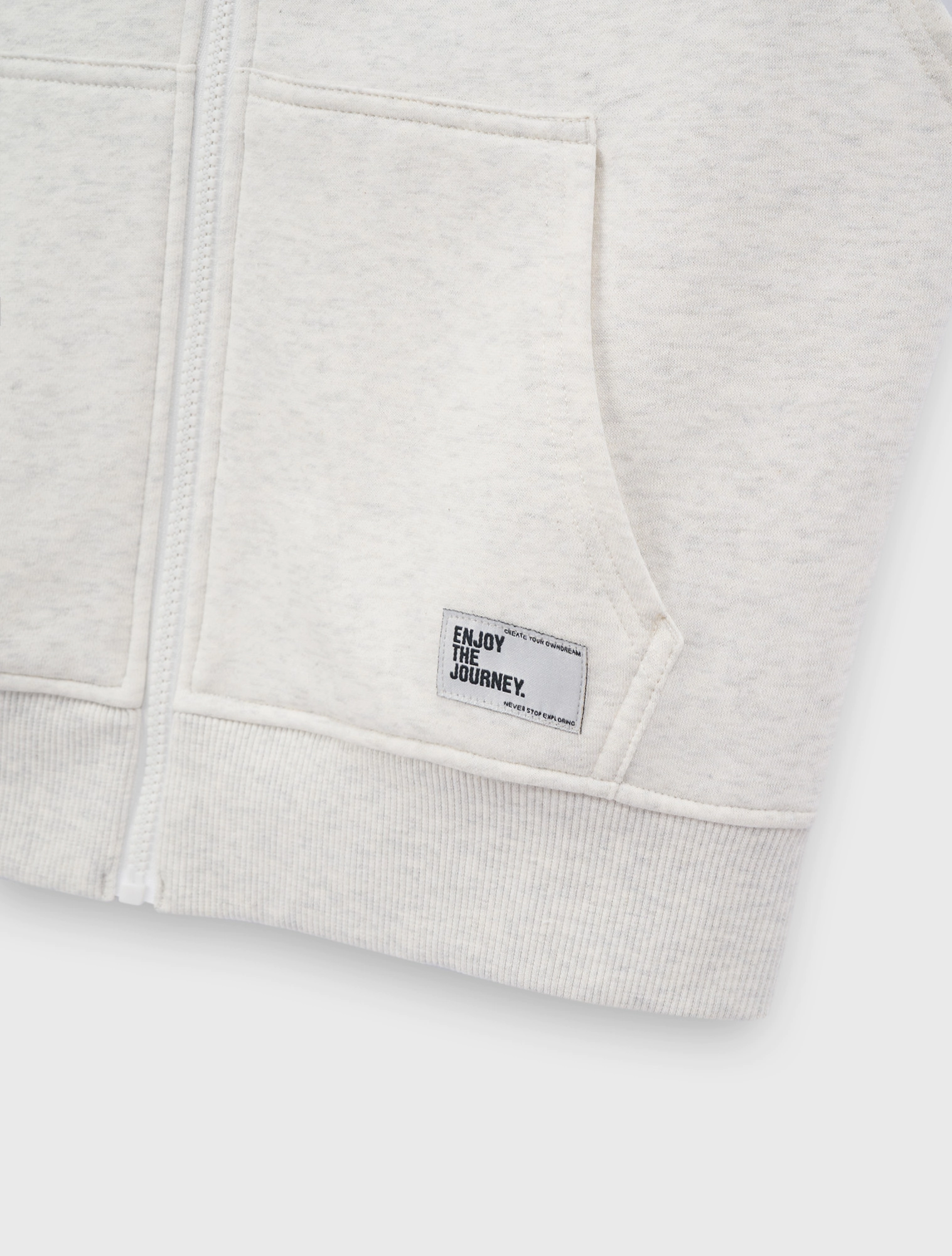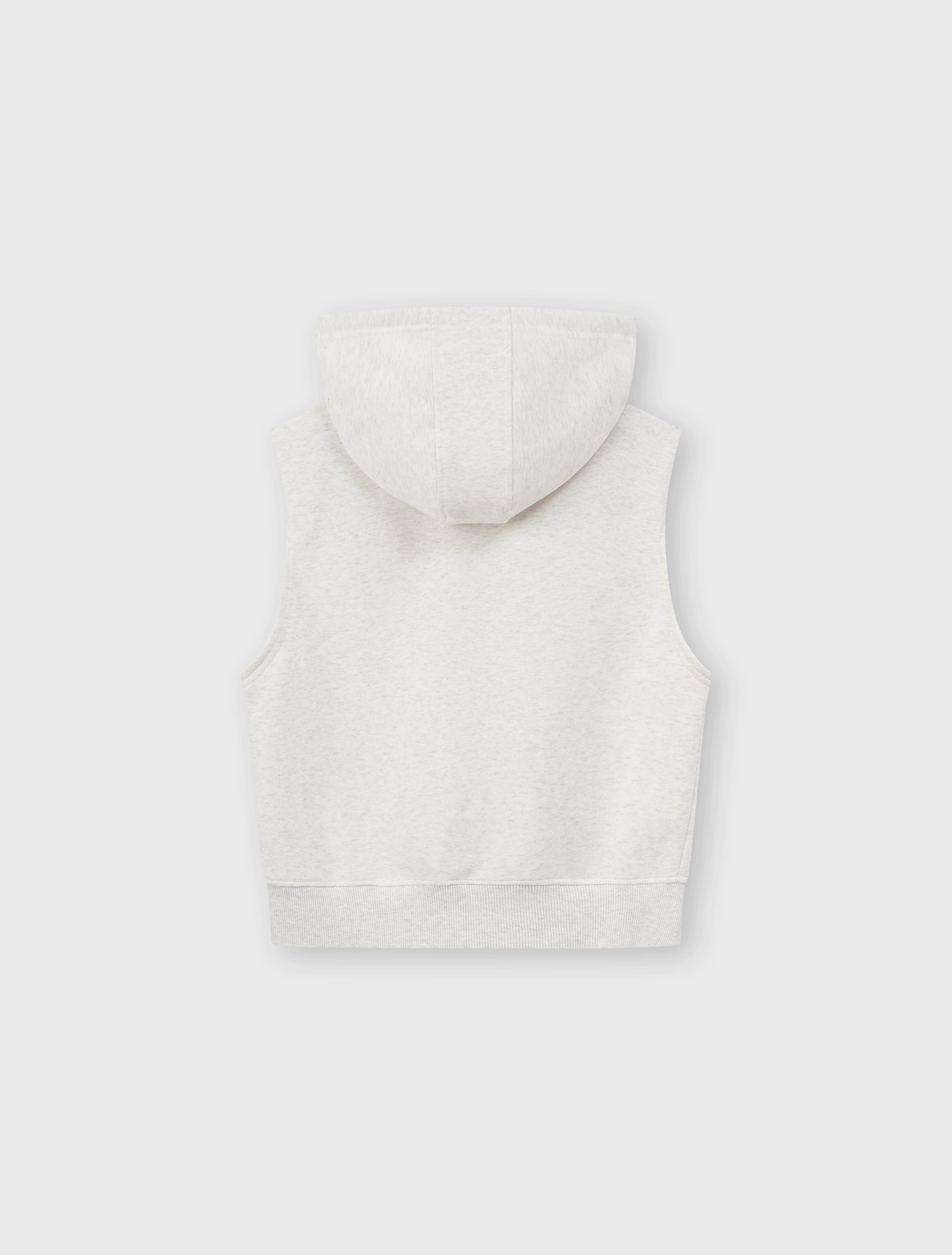 Áo gi lê có mũ, tay sát nách. Túi đắp phía trước. Chi tiết in chữ thân trước. Cài khóa kéo phía trước.