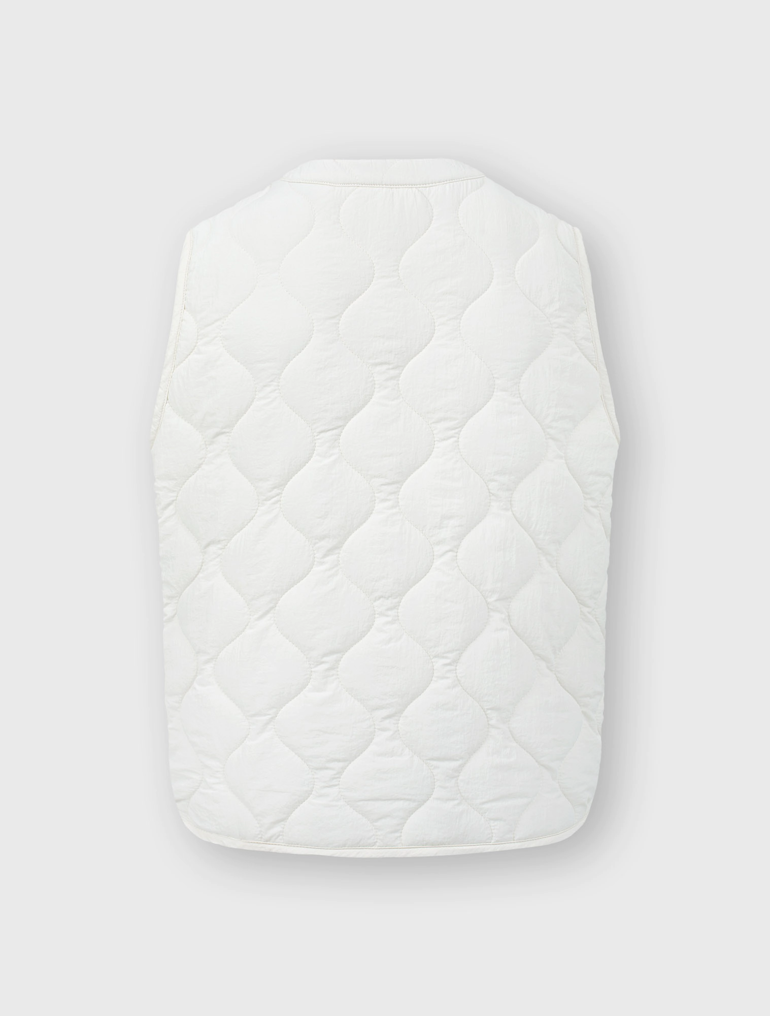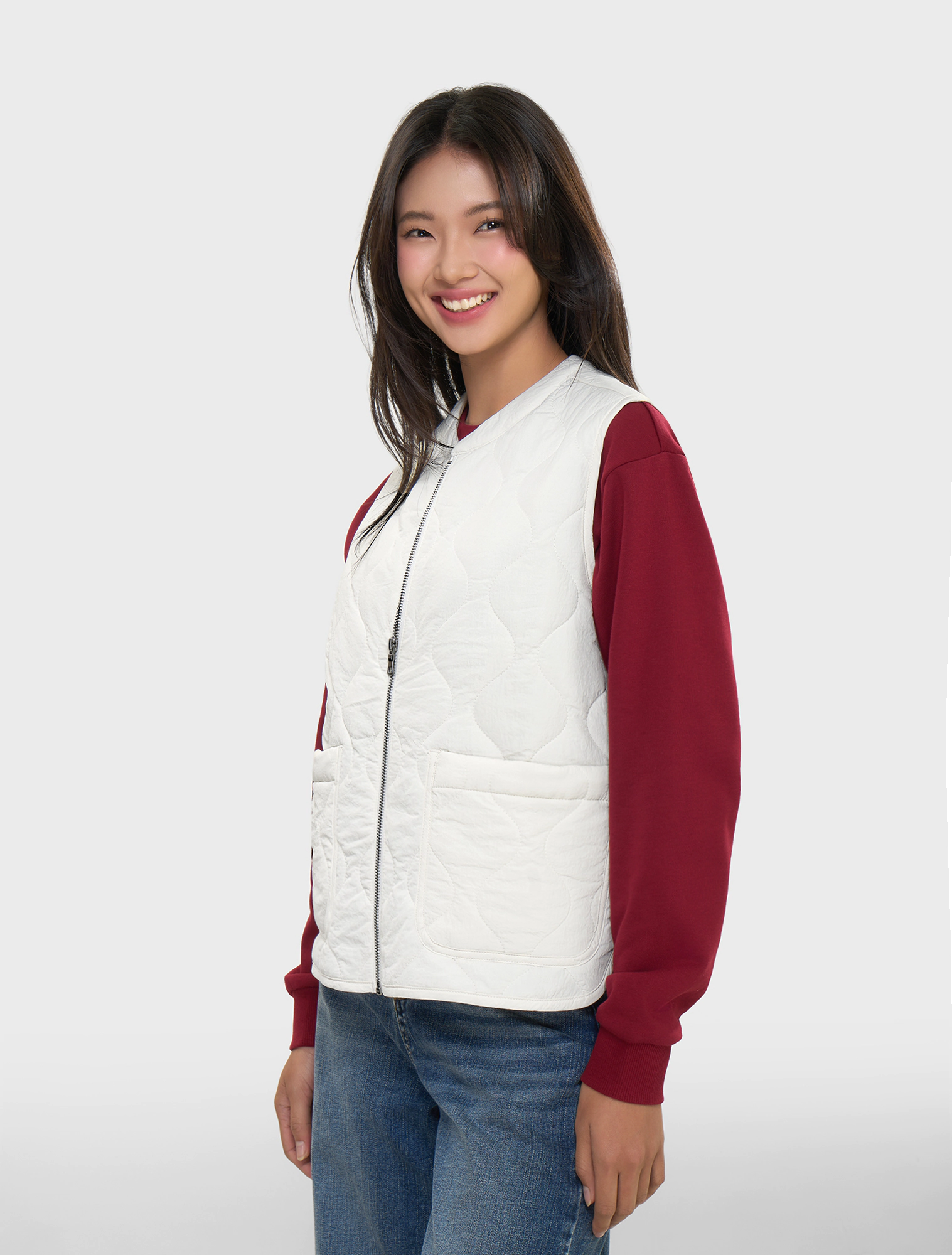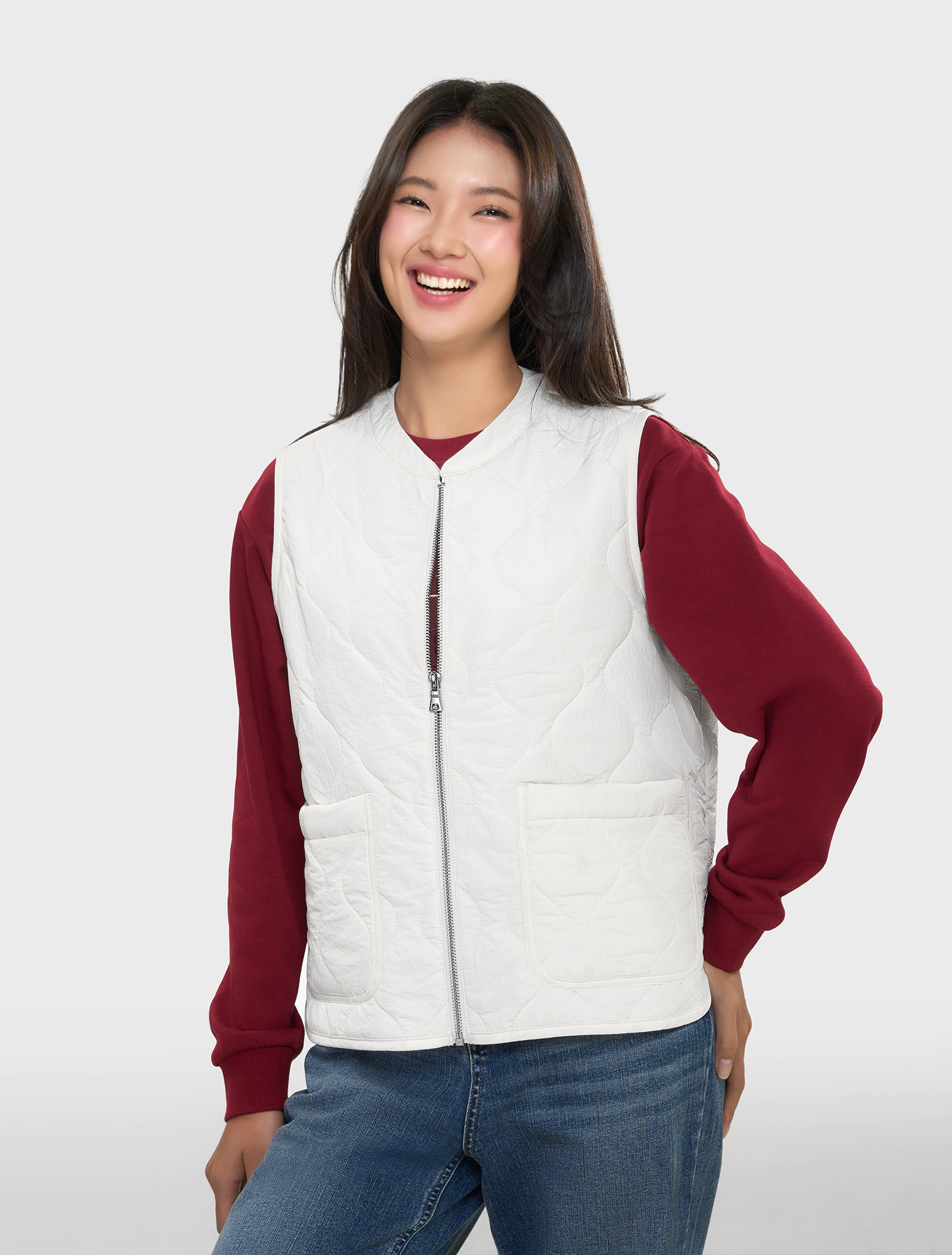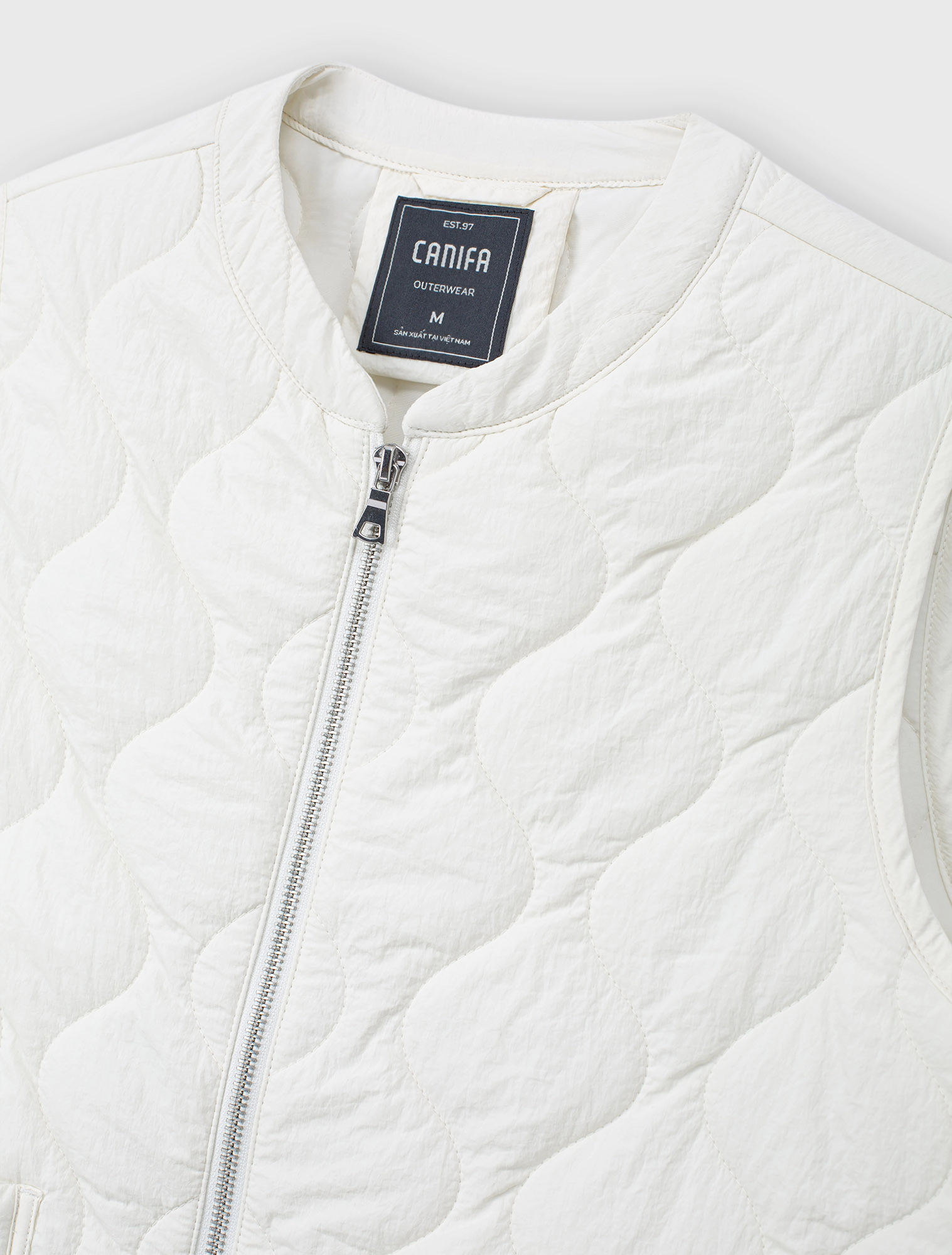 Áo khoác gilet chần bông nữ có cổ, kéo khóa. Phom dáng rộng vừa, thoải mái, phù hợp với thời tiết lạnh, mưa nhẹ.