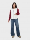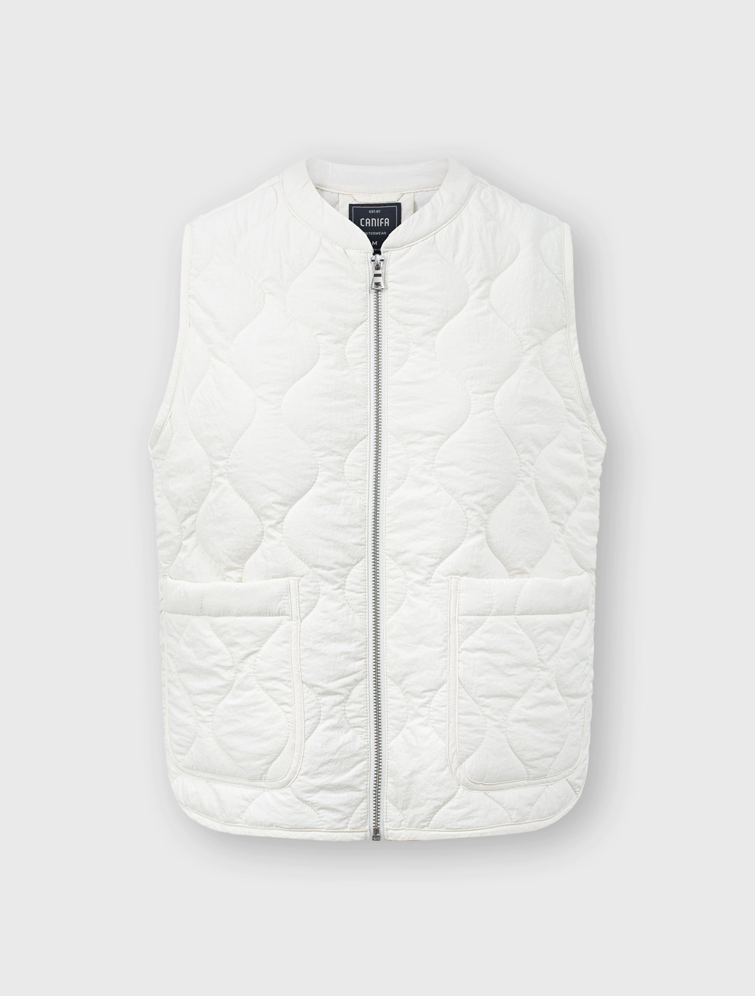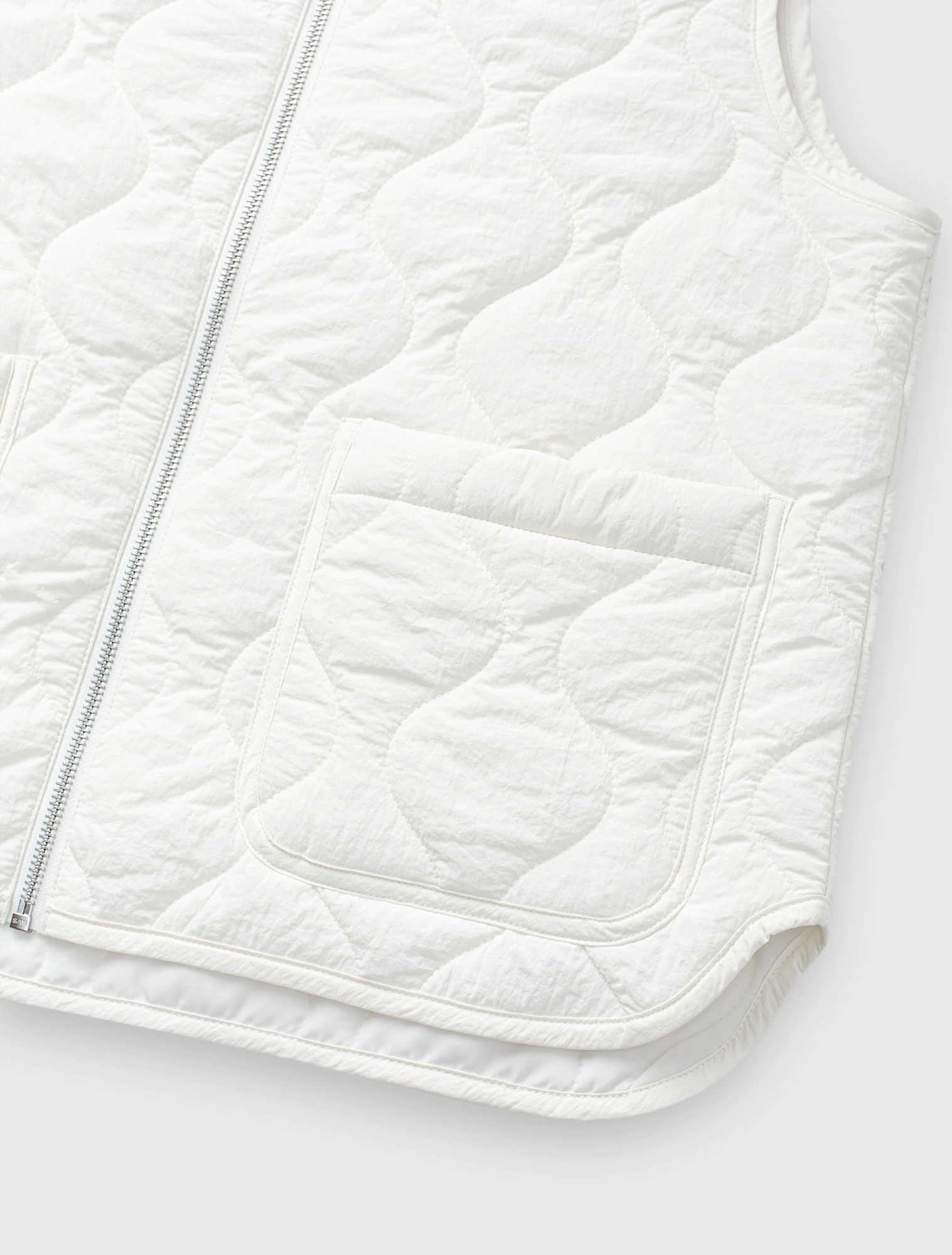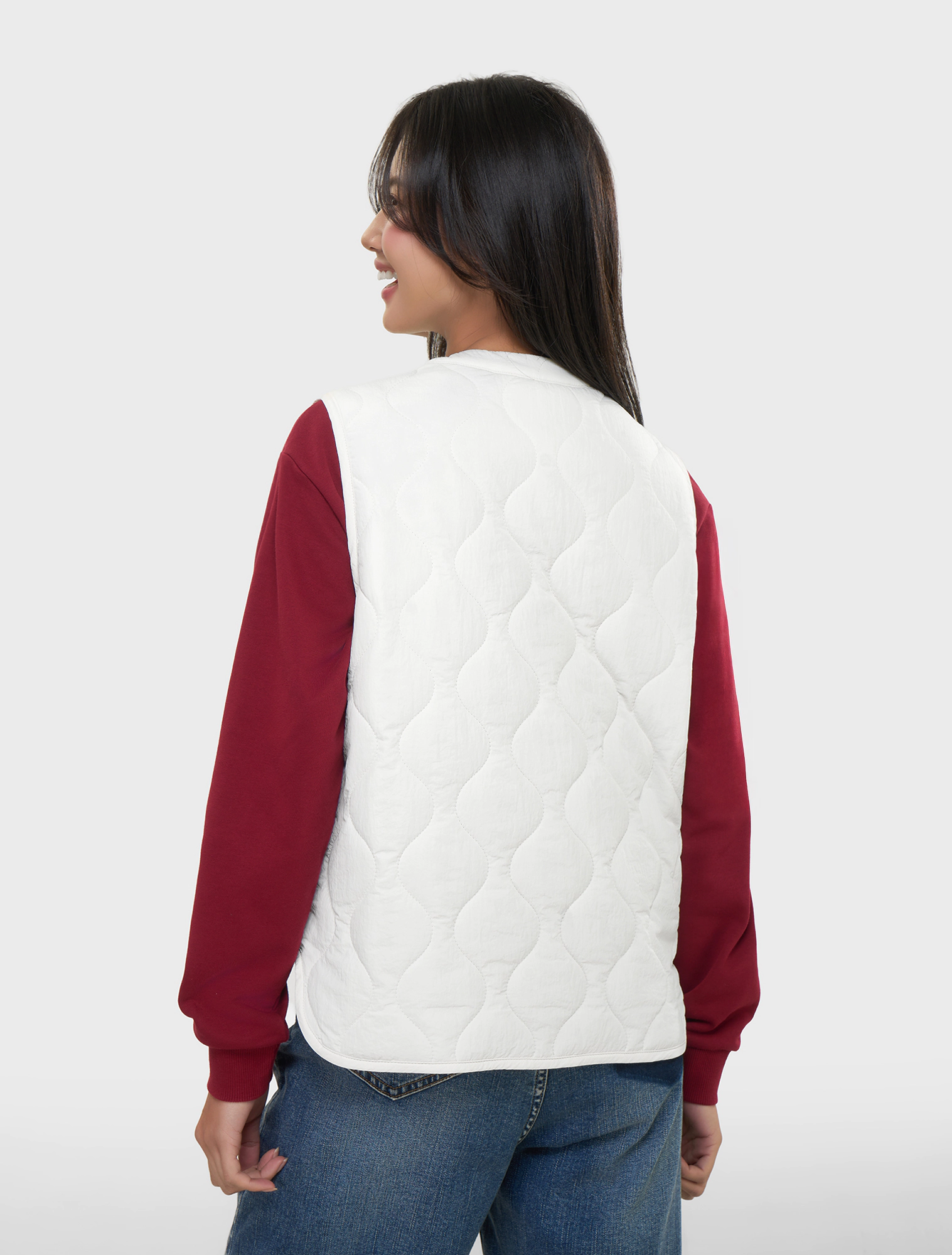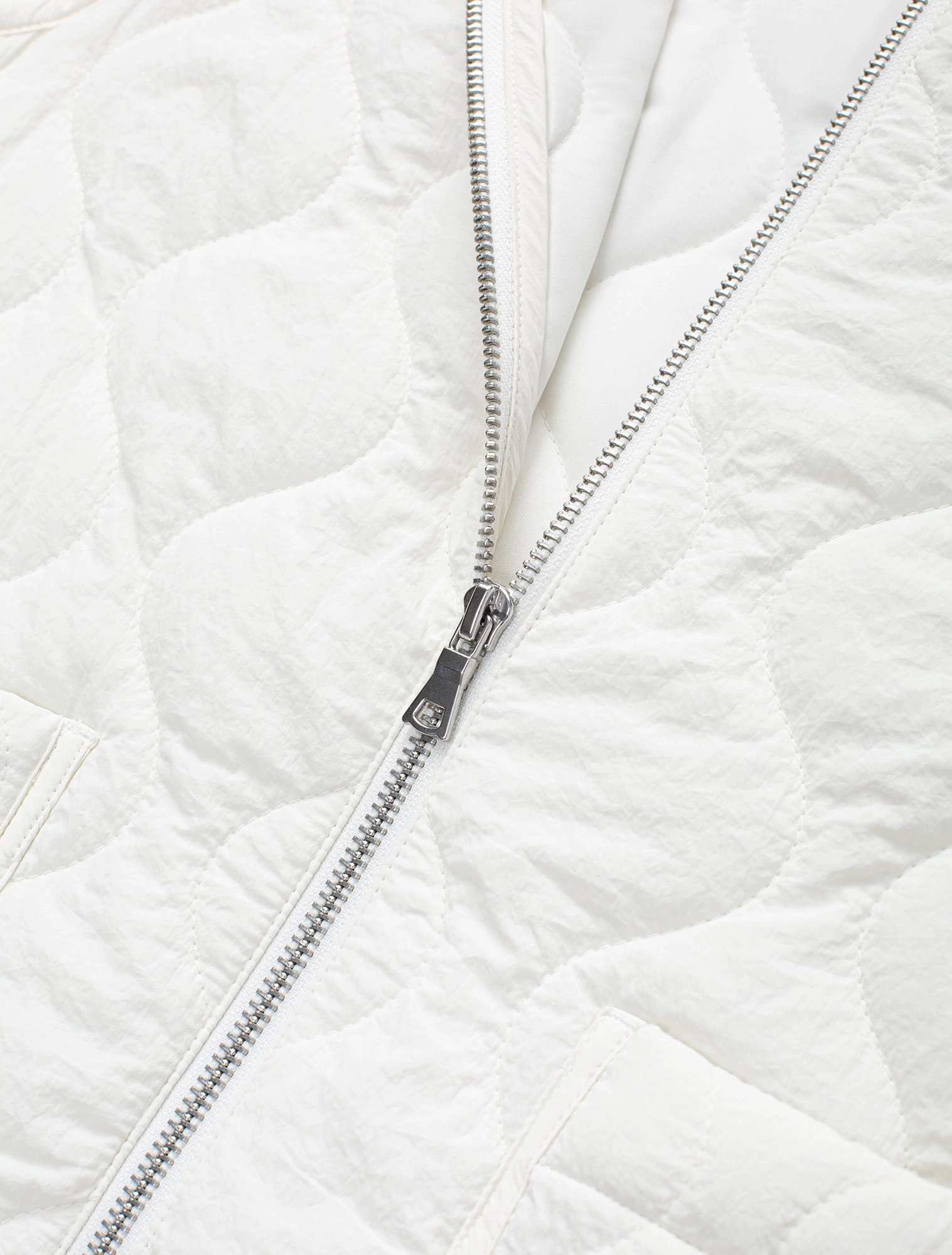 Áo khoác gilet chần bông nữ có cổ, kéo khóa. Phom dáng rộng vừa, thoải mái, phù hợp với thời tiết lạnh, mưa nhẹ.