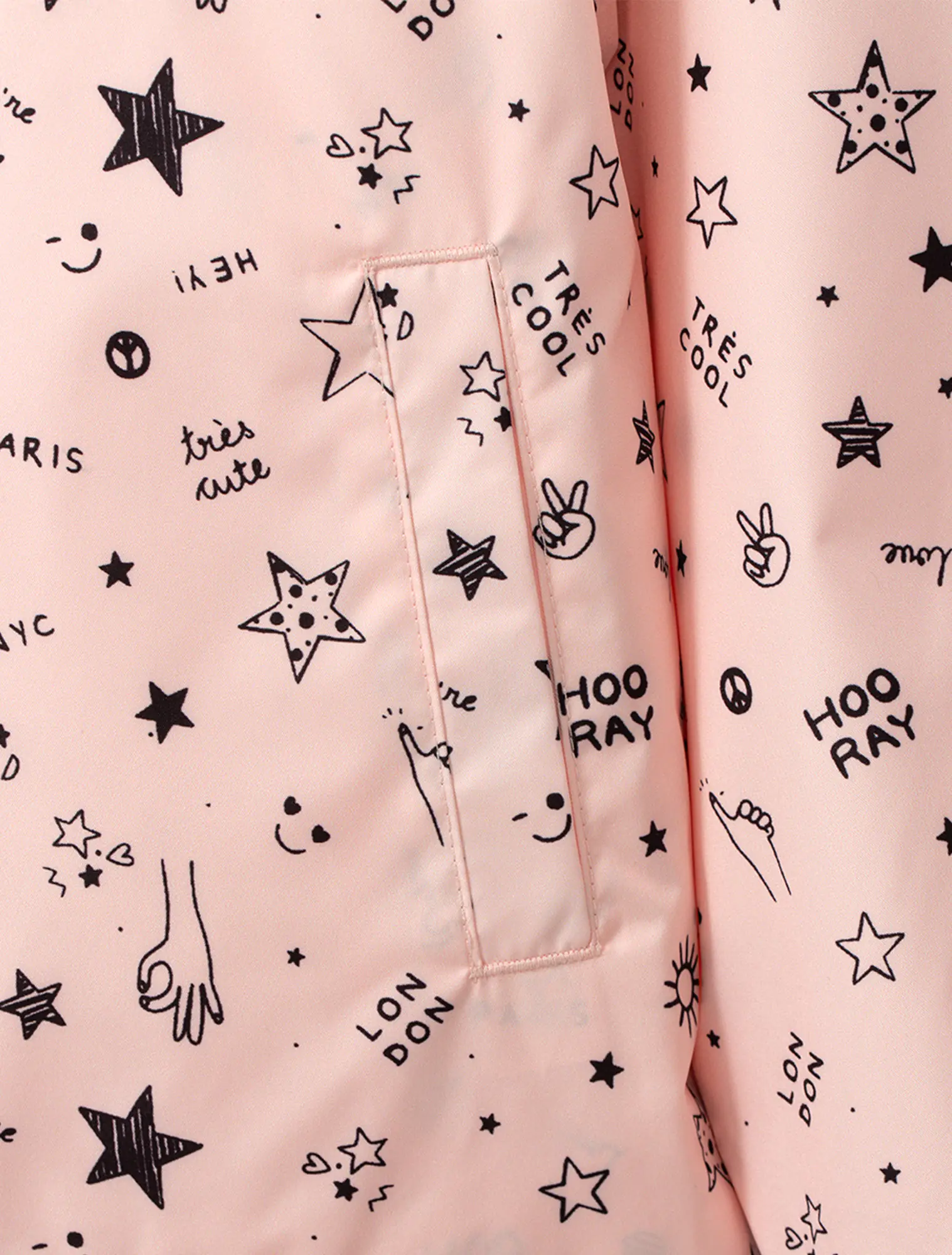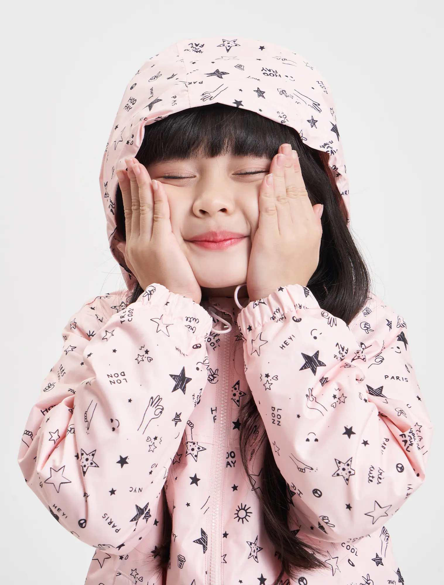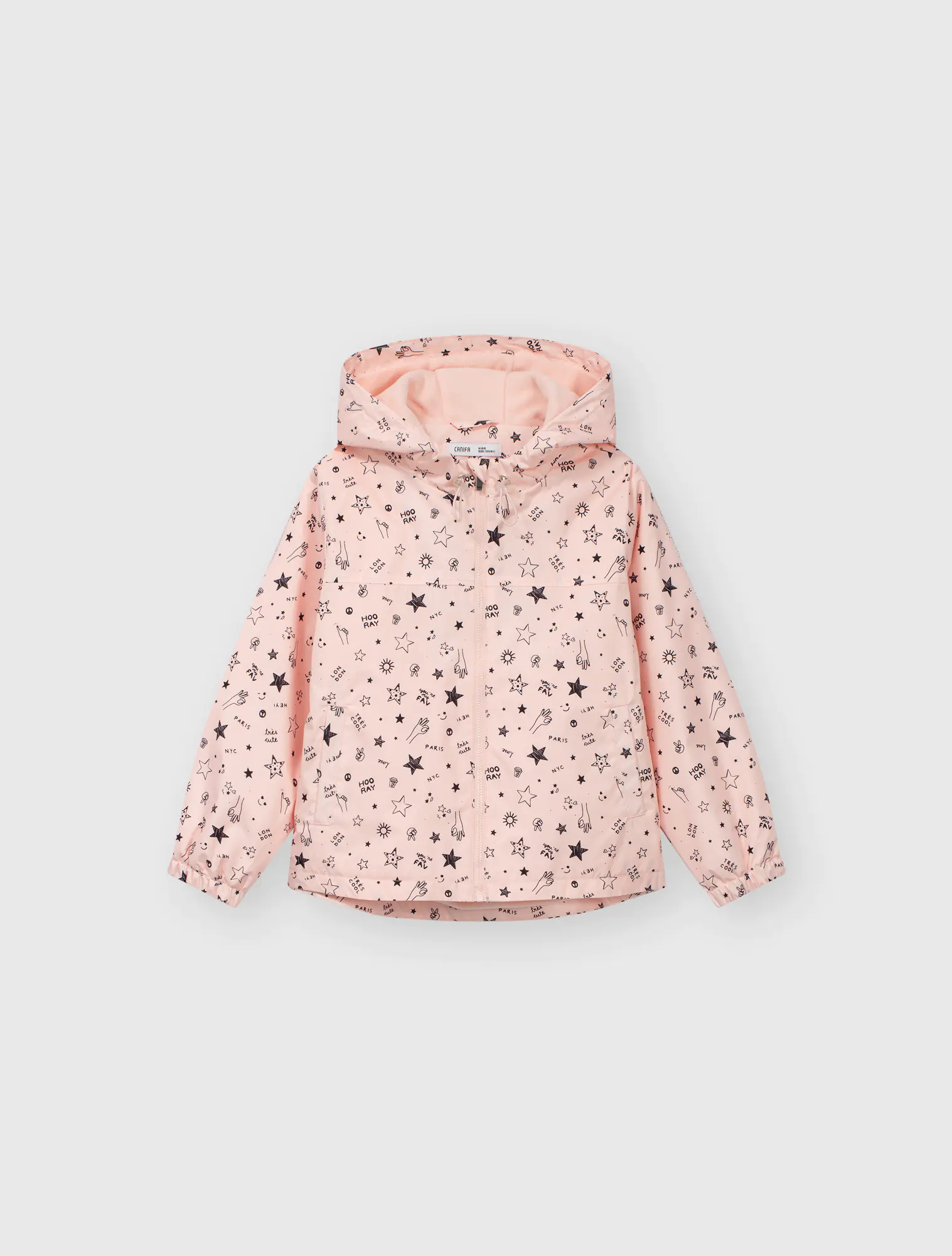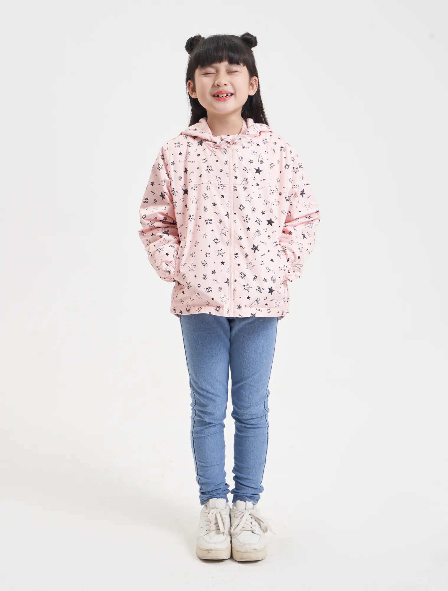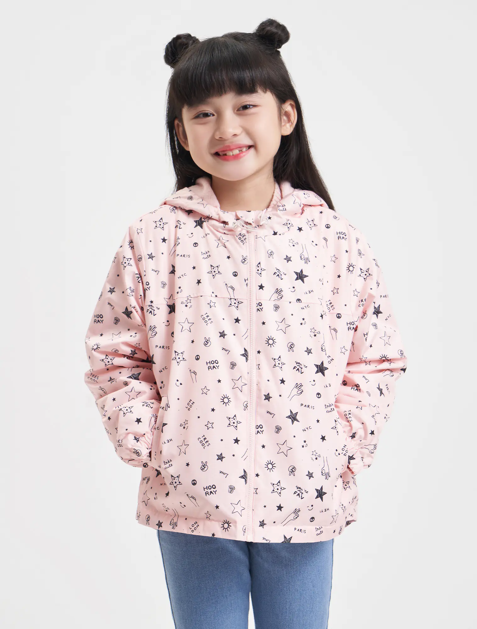 Áo khoác gió bé gái hoạ tiết hai lớp có mũ, lót nỉ.