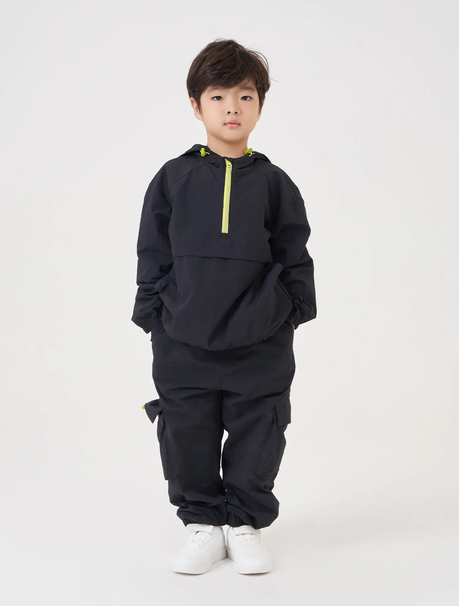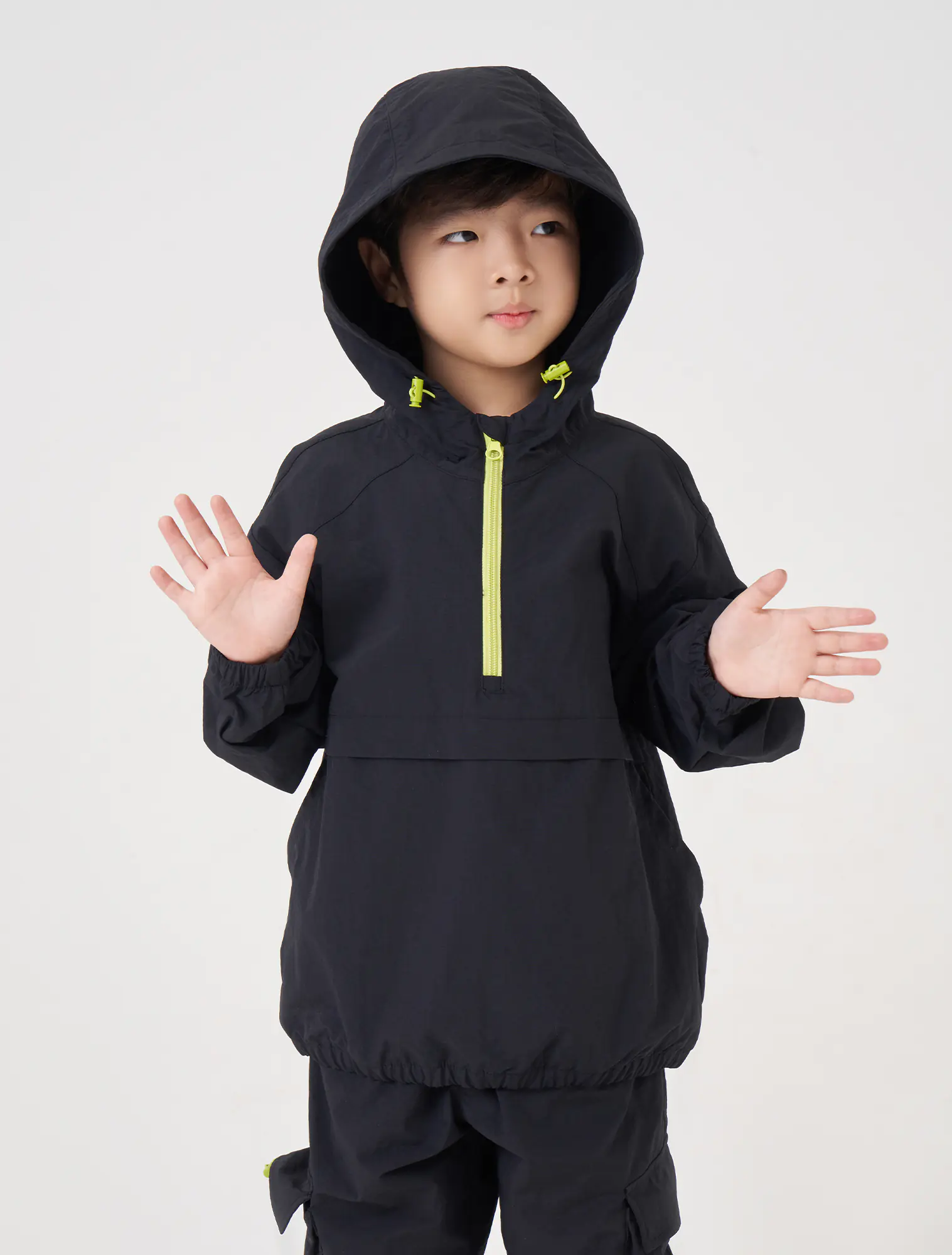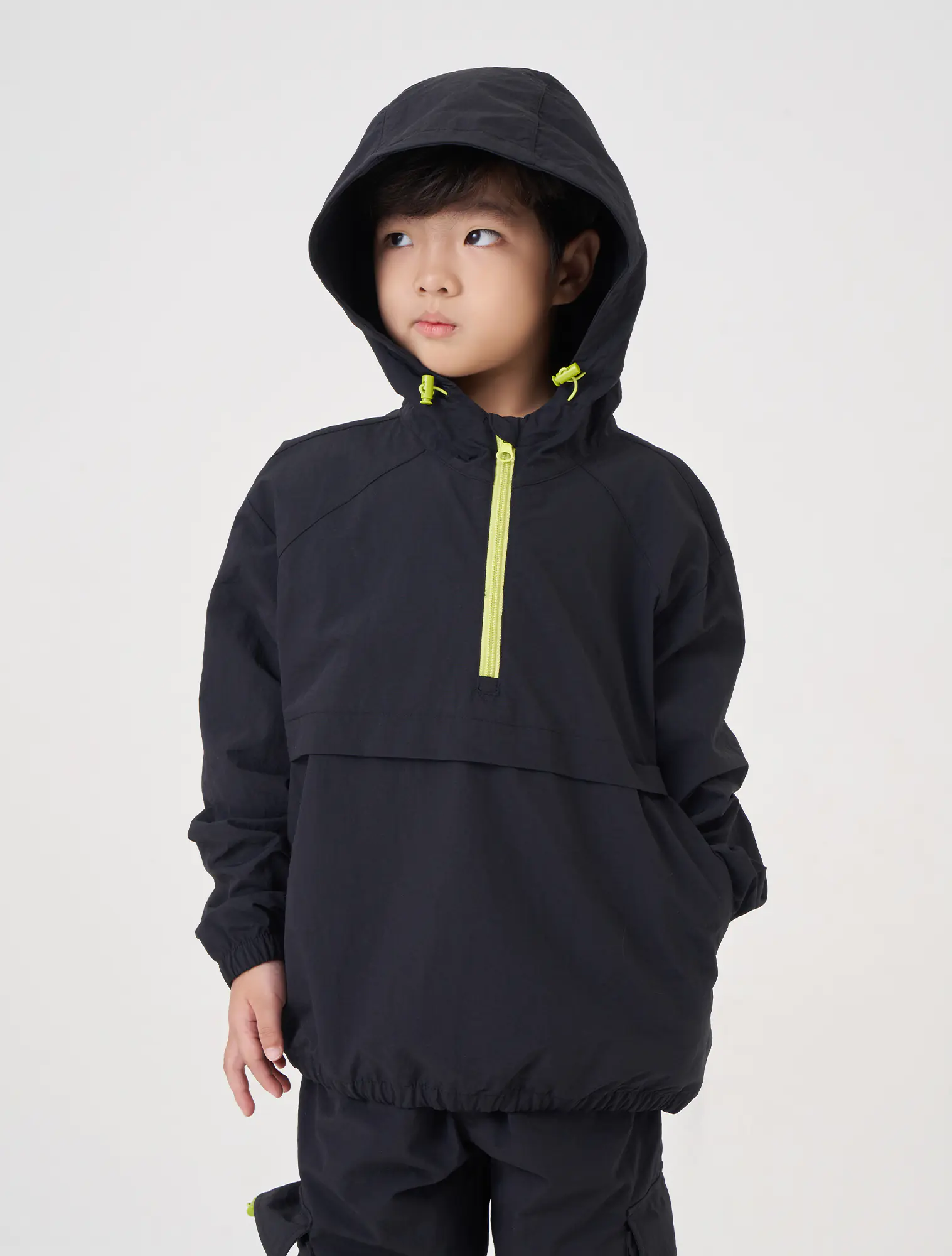 Áo khoác gió có mũ, dài tay, chui đầu mở khóa lửng phối màu. Có 2 túi thân trước, gấu luồn chun co giãn. Có thể kết hợp cùng quần jogger hoặc quần sooc cùng chất liệu.
