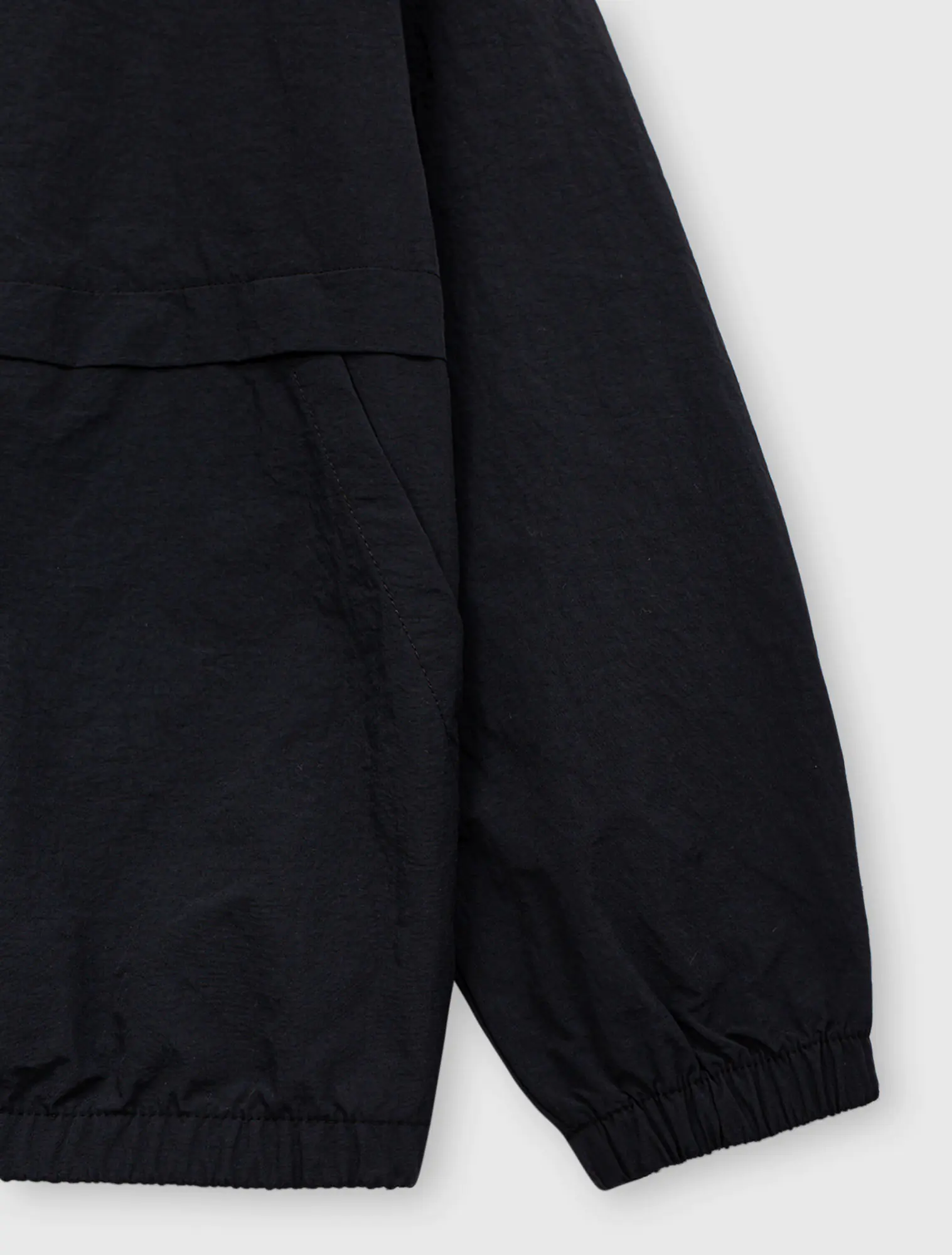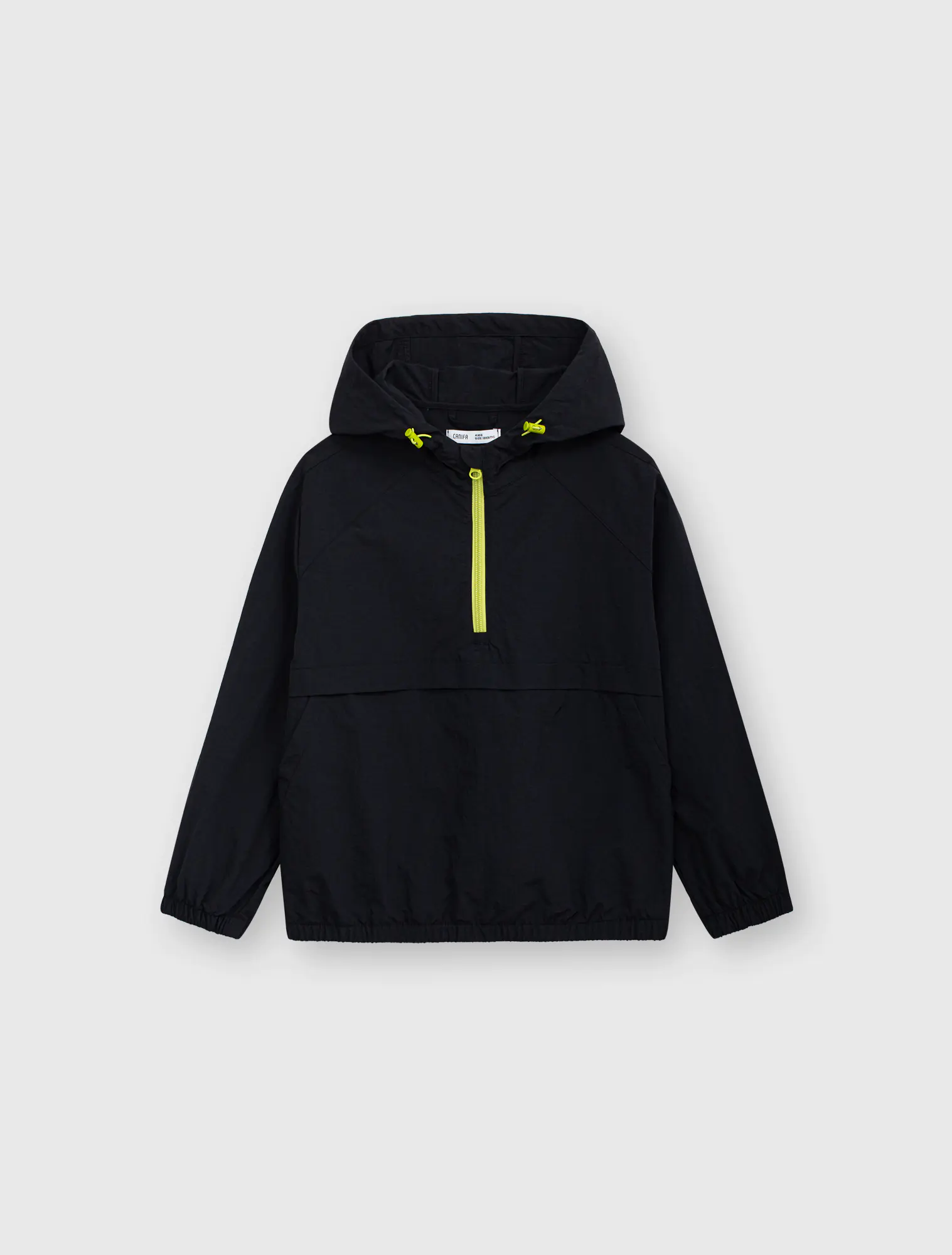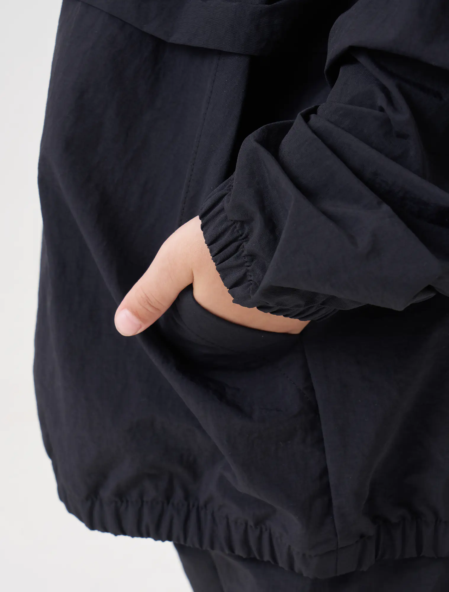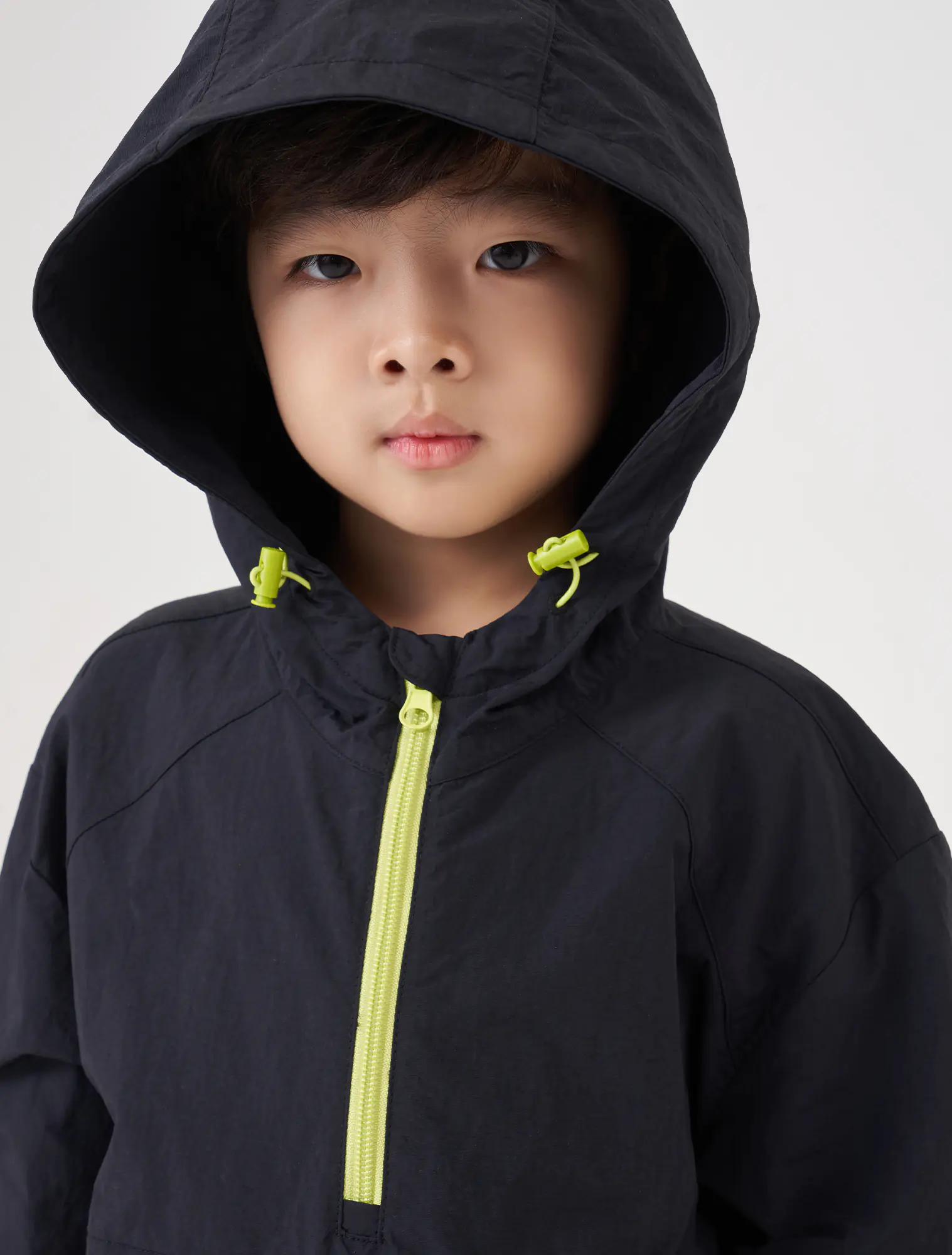 Áo khoác gió có mũ, dài tay, chui đầu mở khóa lửng phối màu. Có 2 túi thân trước, gấu luồn chun co giãn. Có thể kết hợp cùng quần jogger hoặc quần sooc cùng chất liệu.