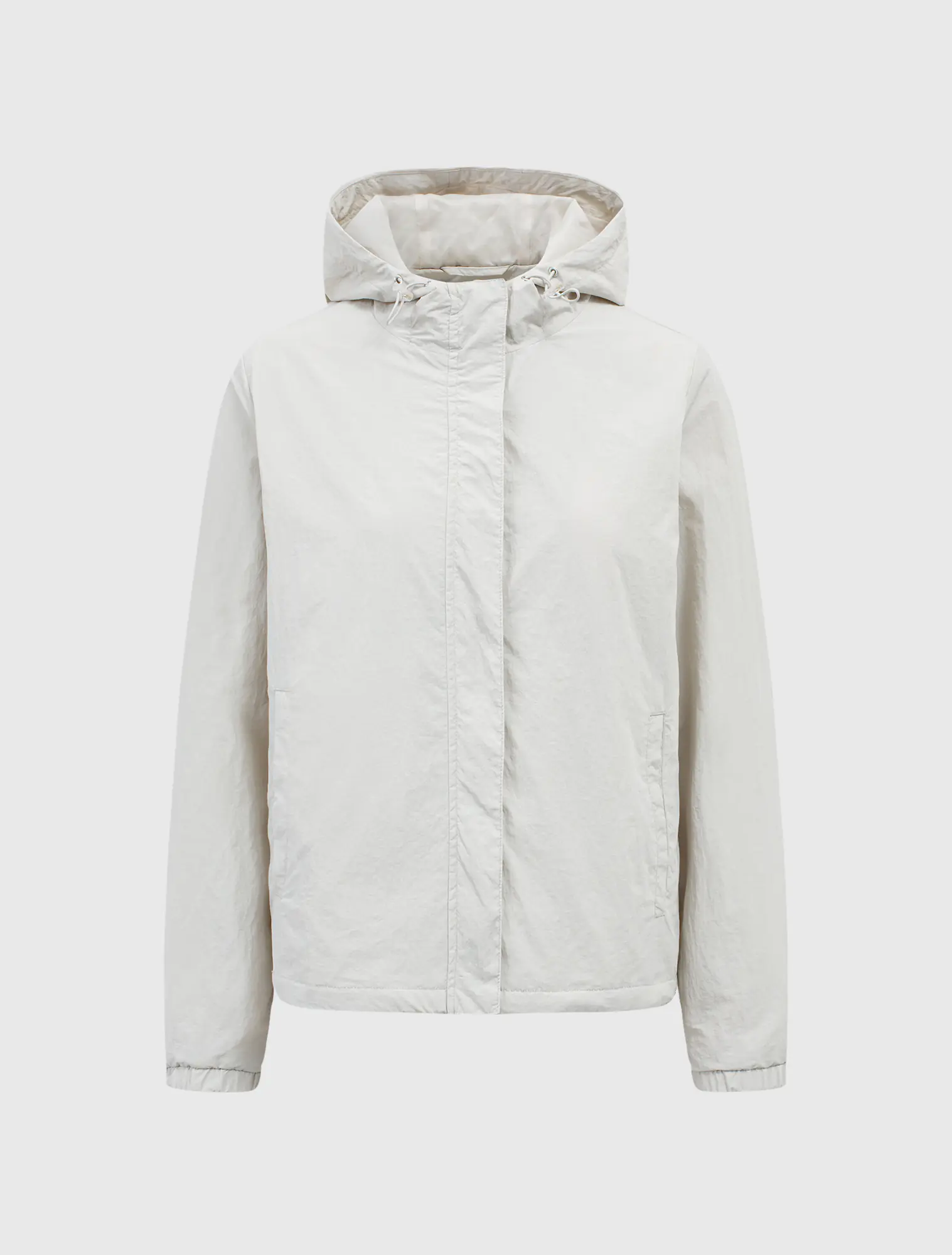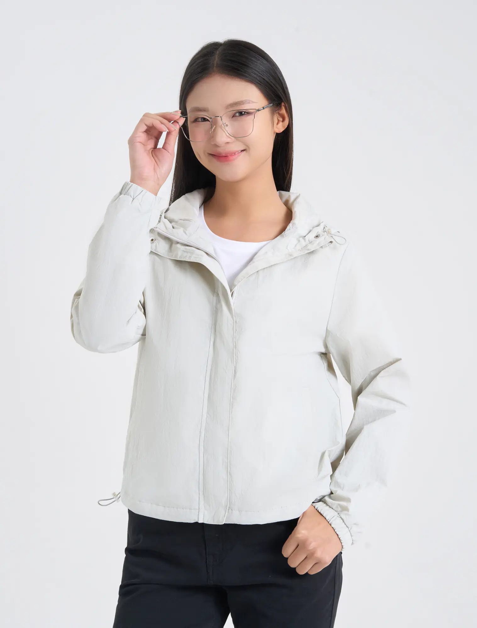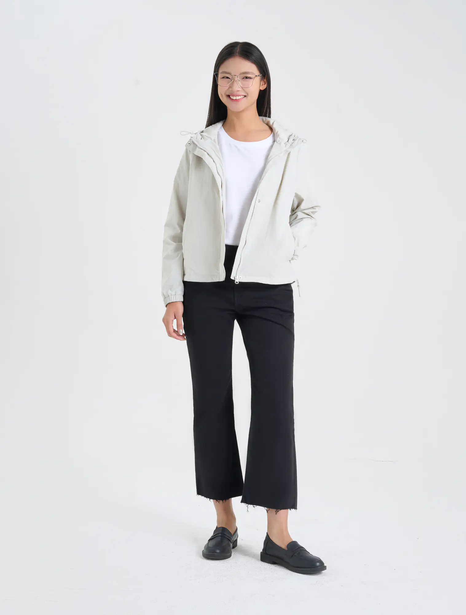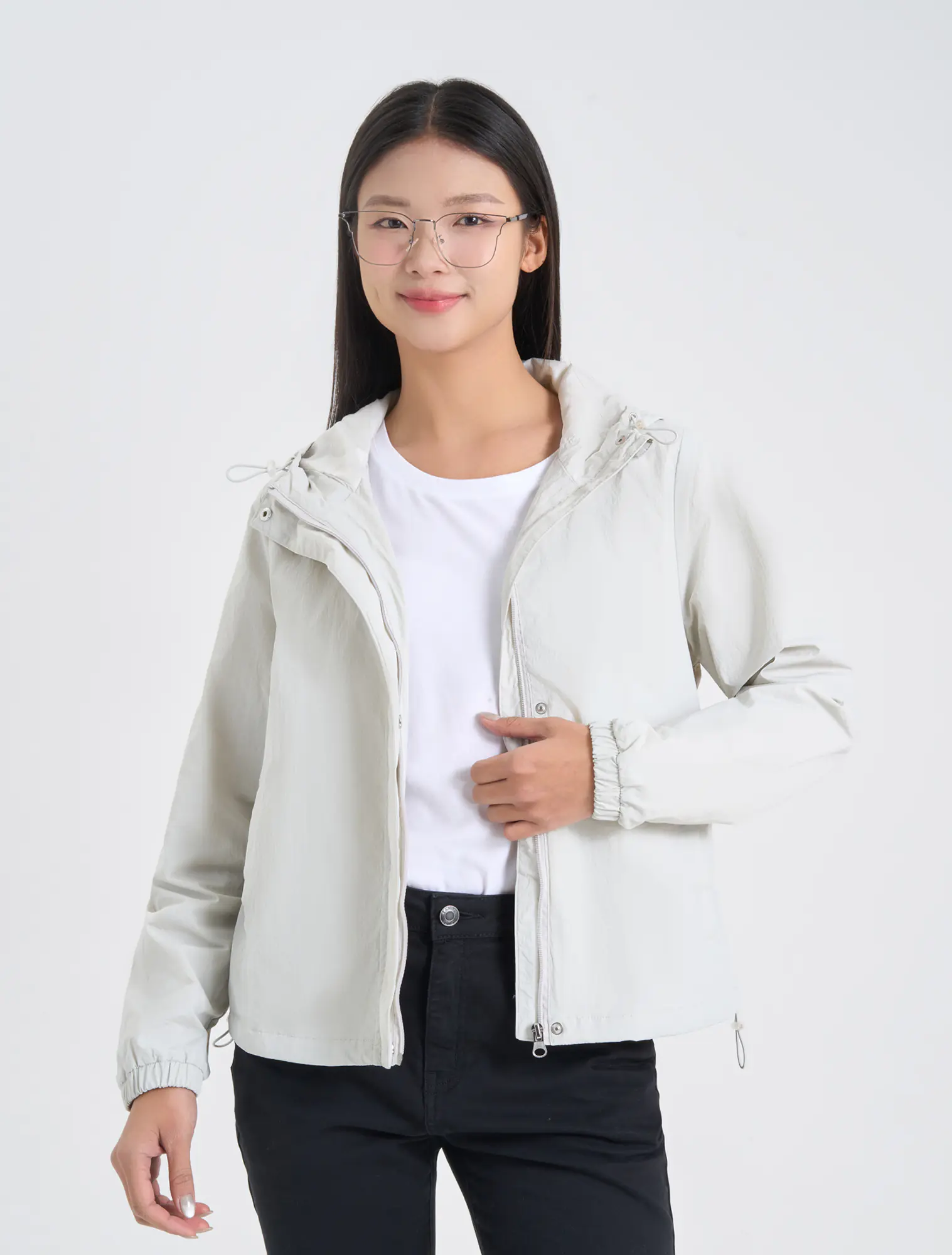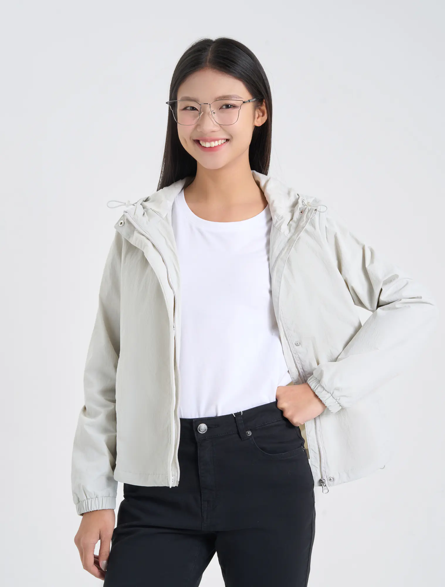 Áo khoác gió nữ hai lớp có mũ. Phom dáng rộng vừa, phù hợp với thời tiết gió, mưa nhẹ.