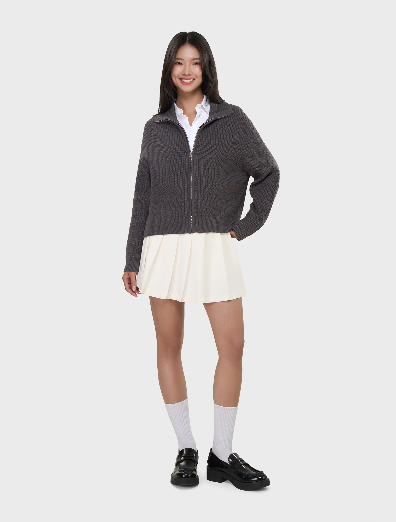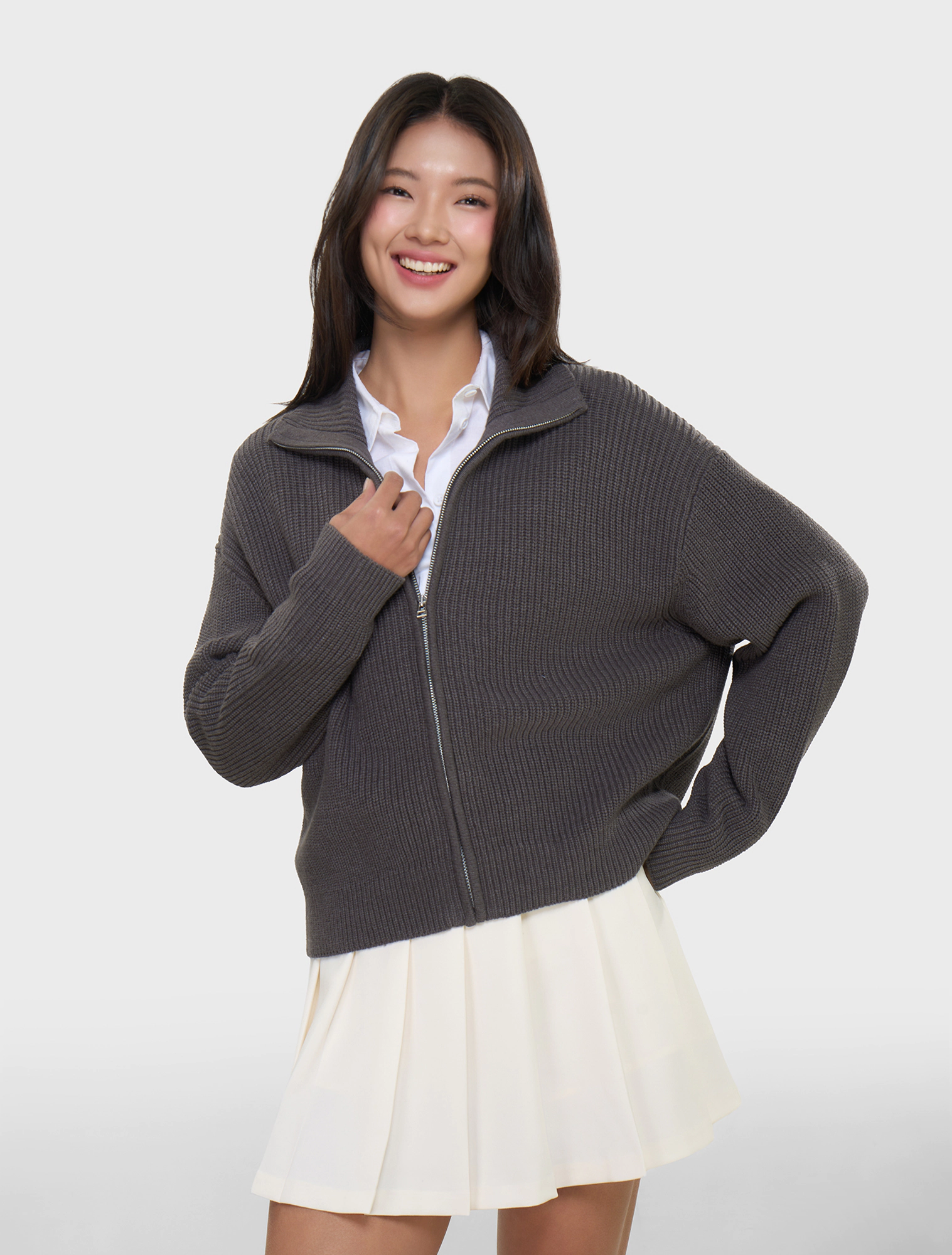 Áo khoác len nữ dài tay có khóa kéo. Dáng áo rộng vừa, chất liệu dệt len mềm mại, ấm áp. Hoàn cảnh sử dụng linh hoạt.