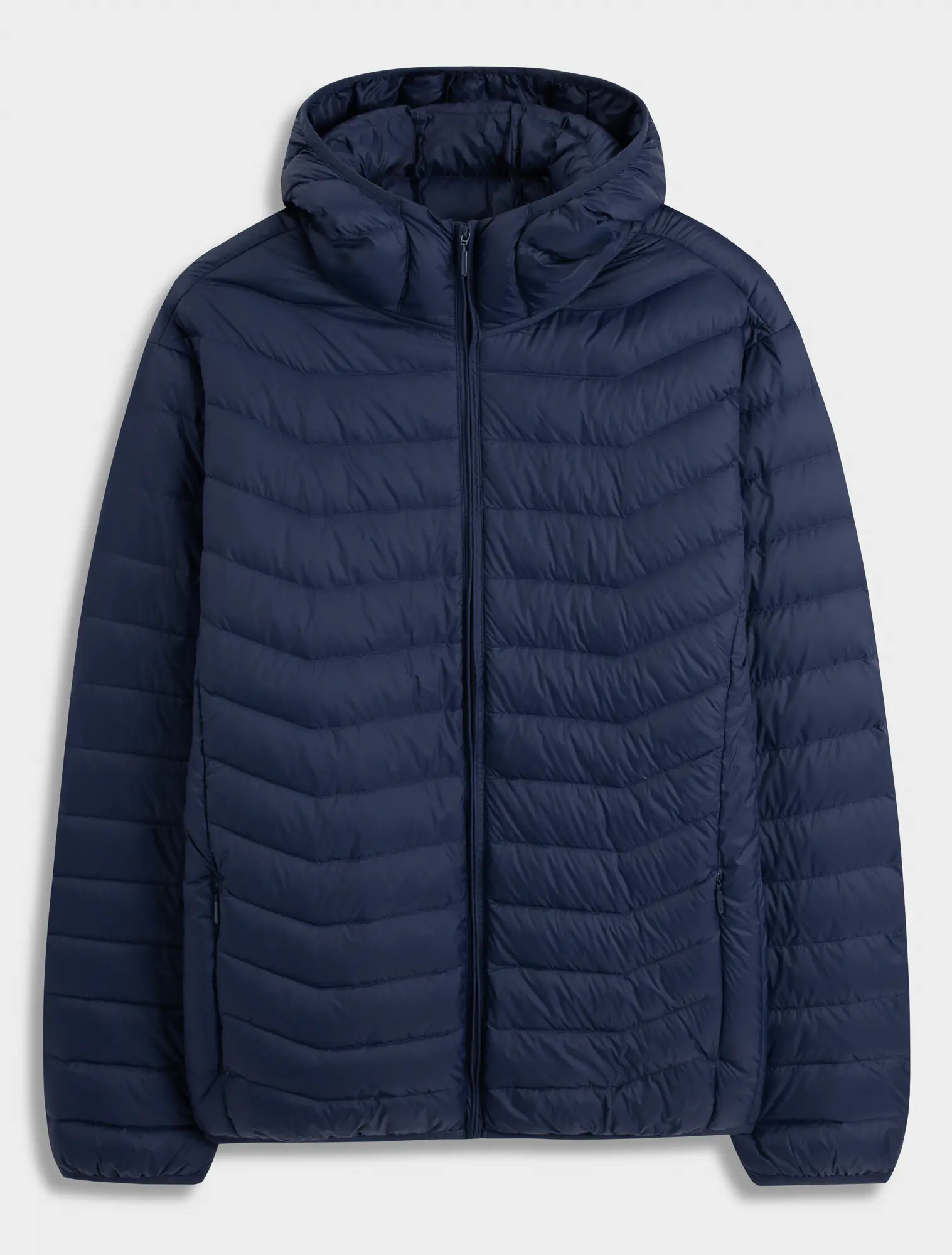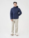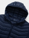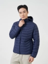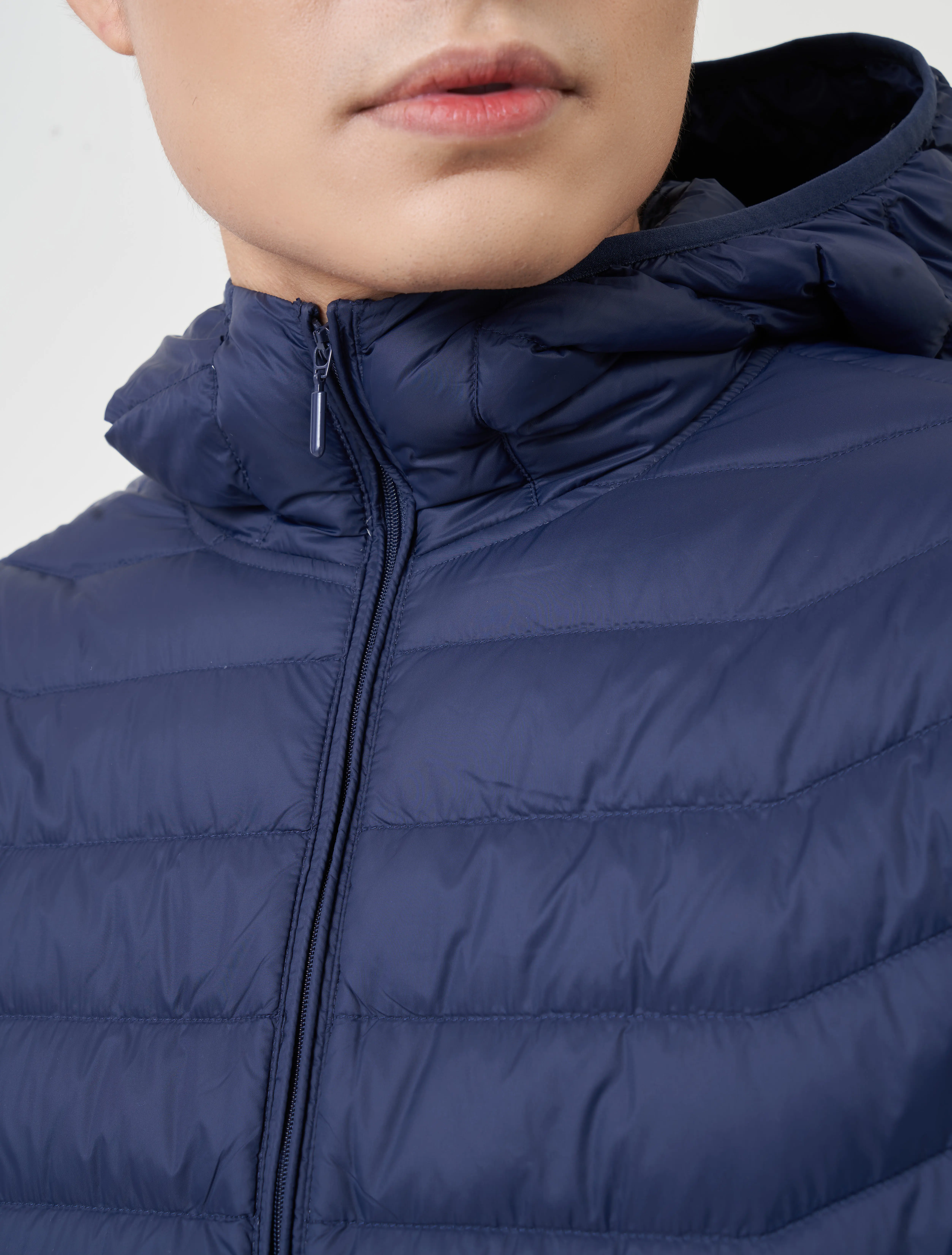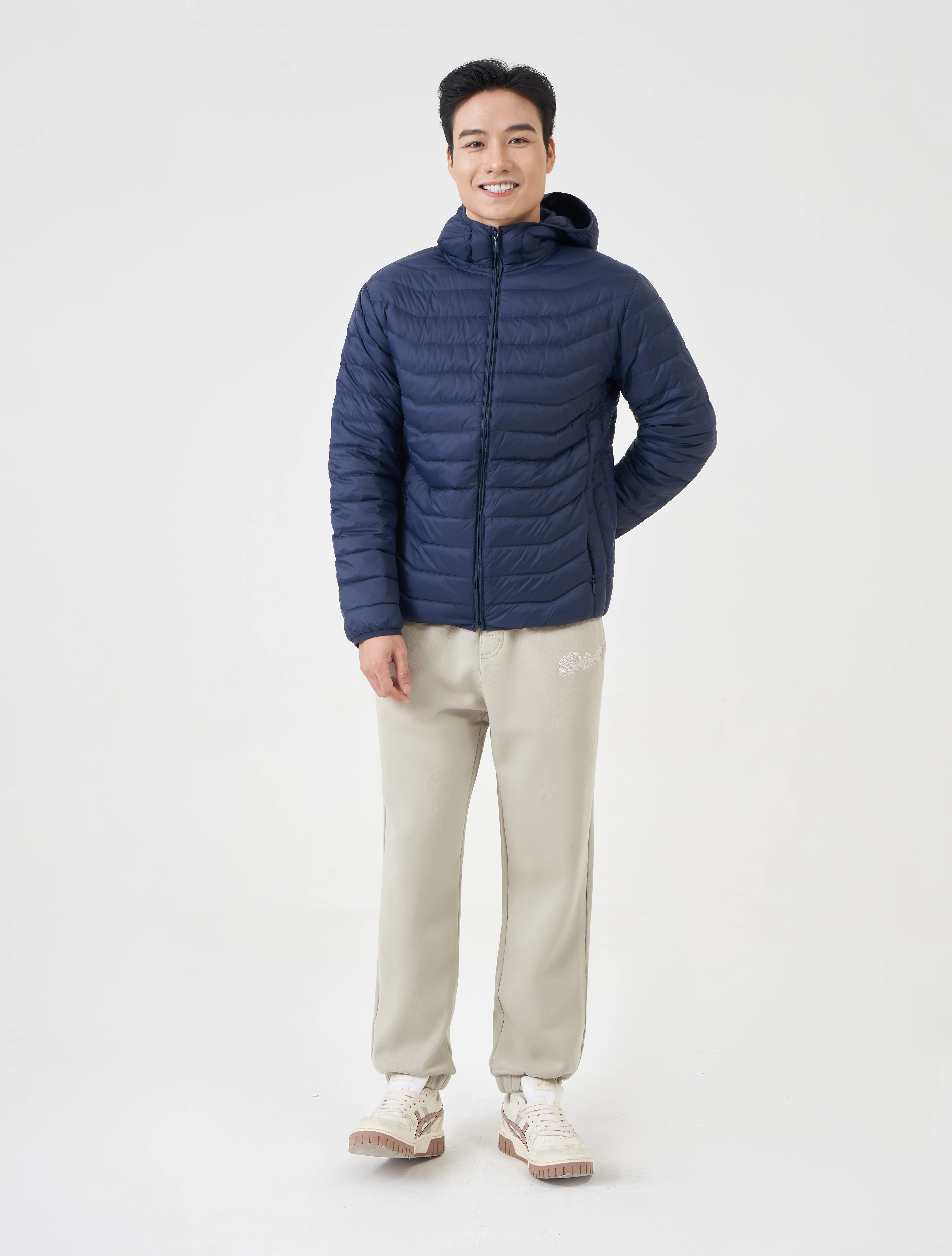 Áo khoác lông vũ nam, cổ mũ, chống thấm nước. Phần cửa tay, gấu thân có thiết kế bo chun kín tránh mất nhiệt khi mặc.