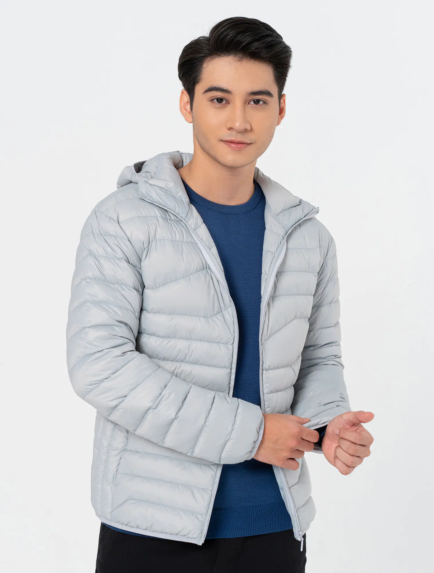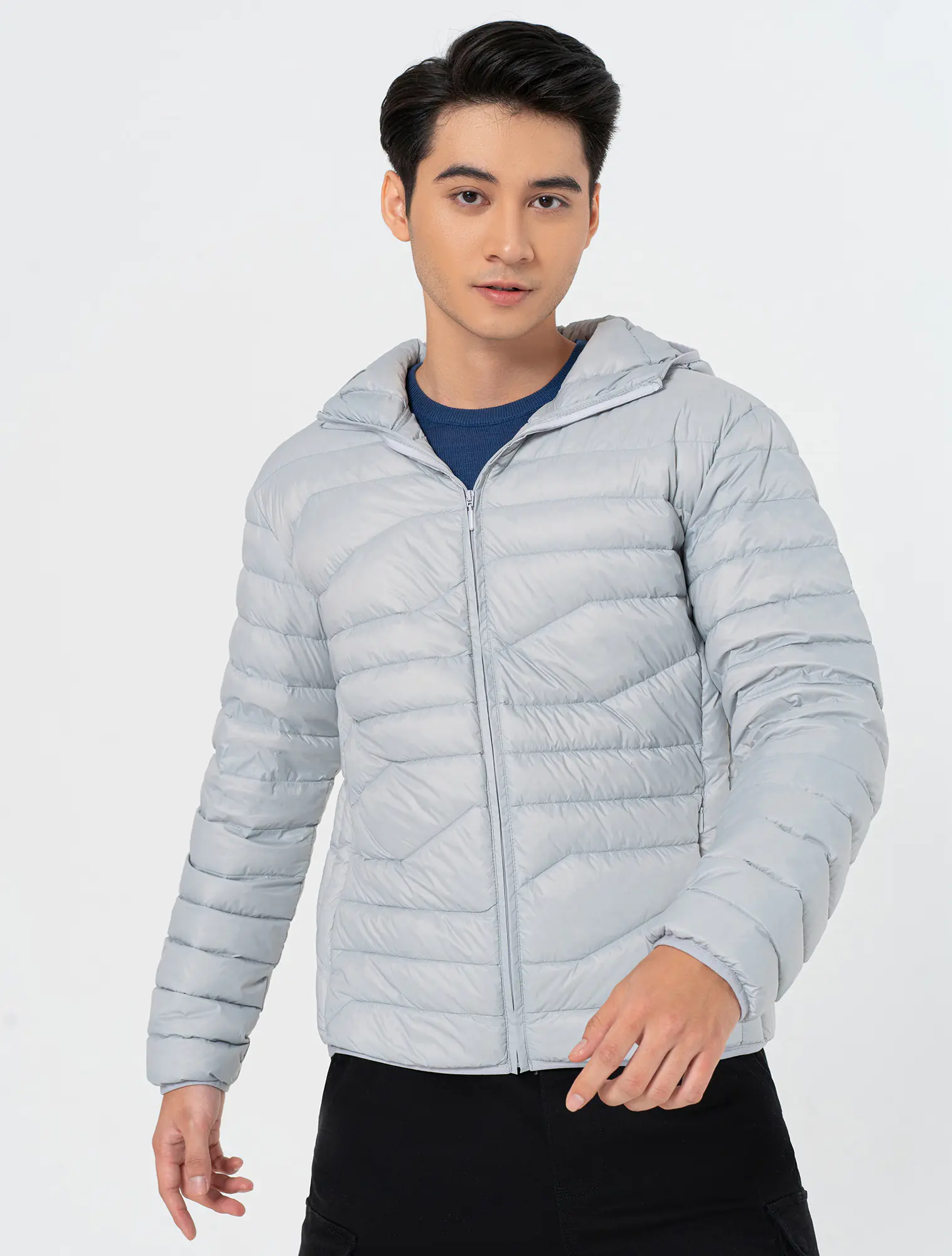 Áo khoác lông vũ chất liệu 100% nylon chống thấm nước, có mũ kéo khóa, phom regular.