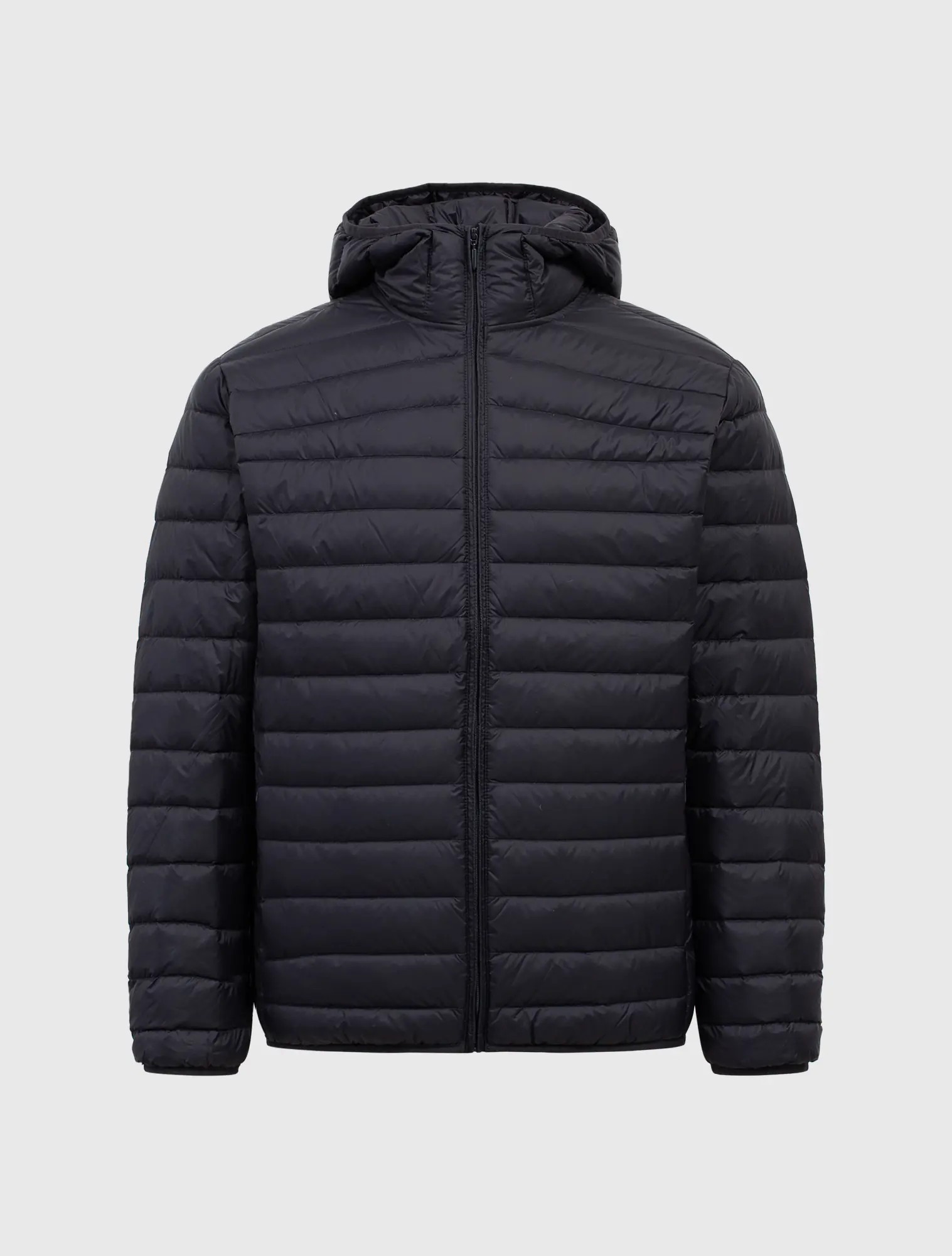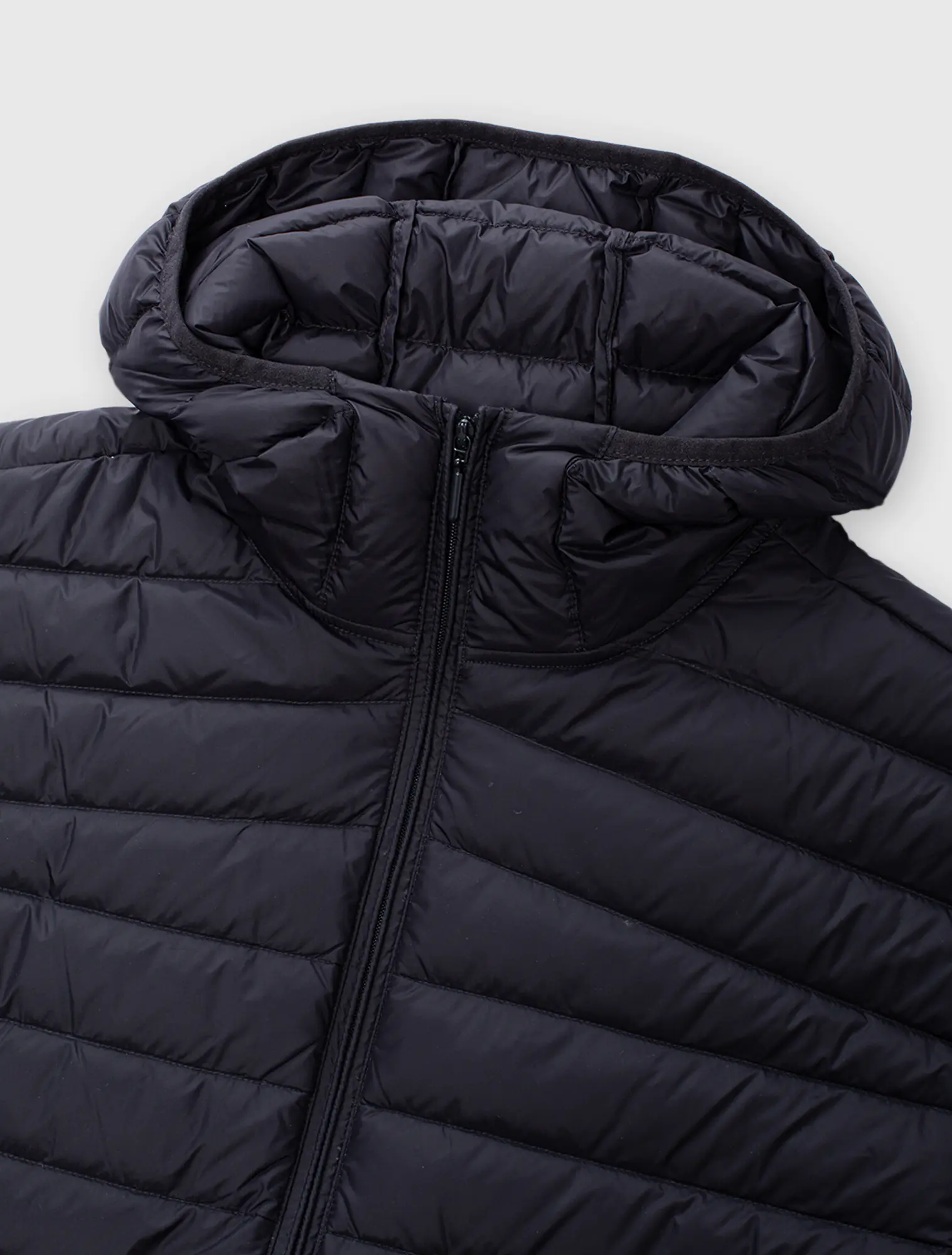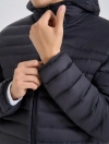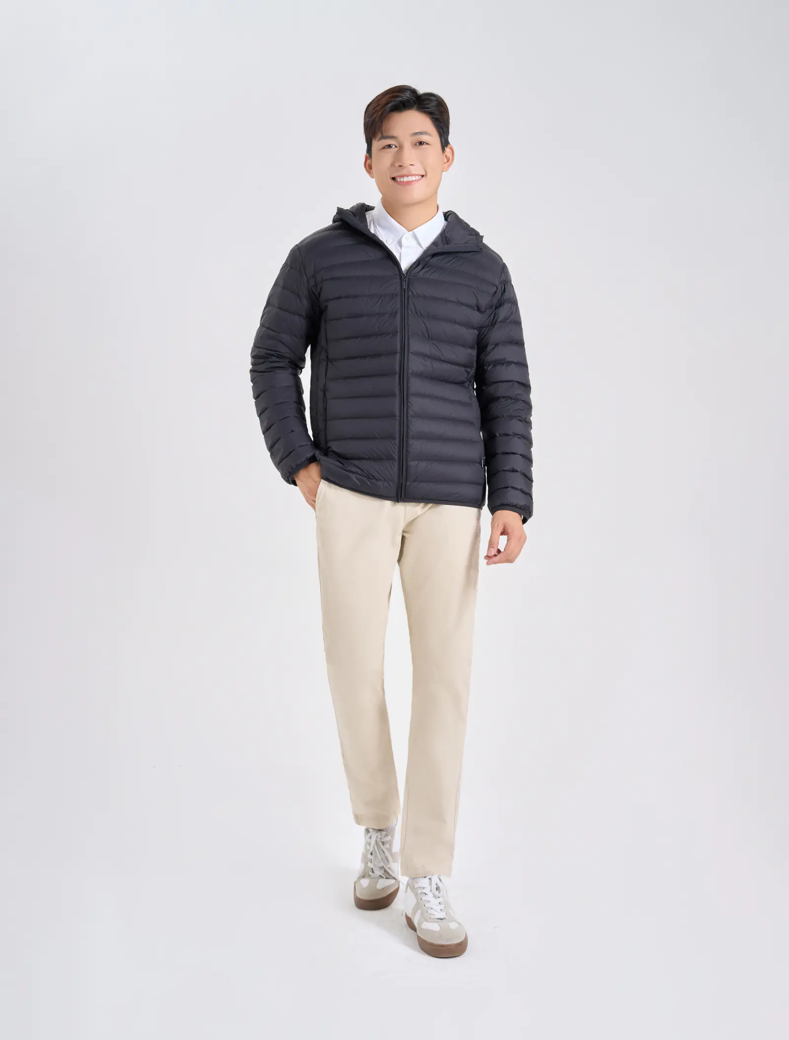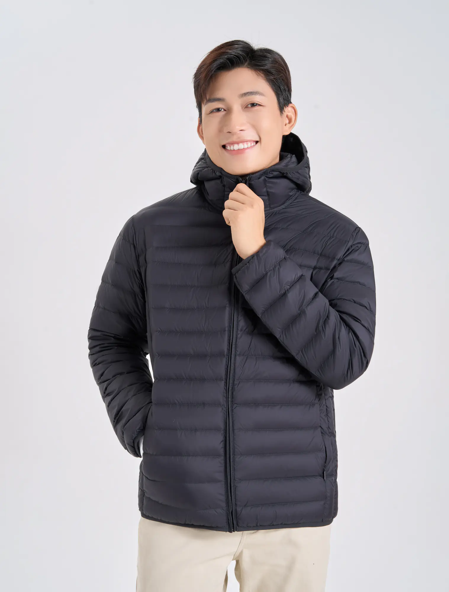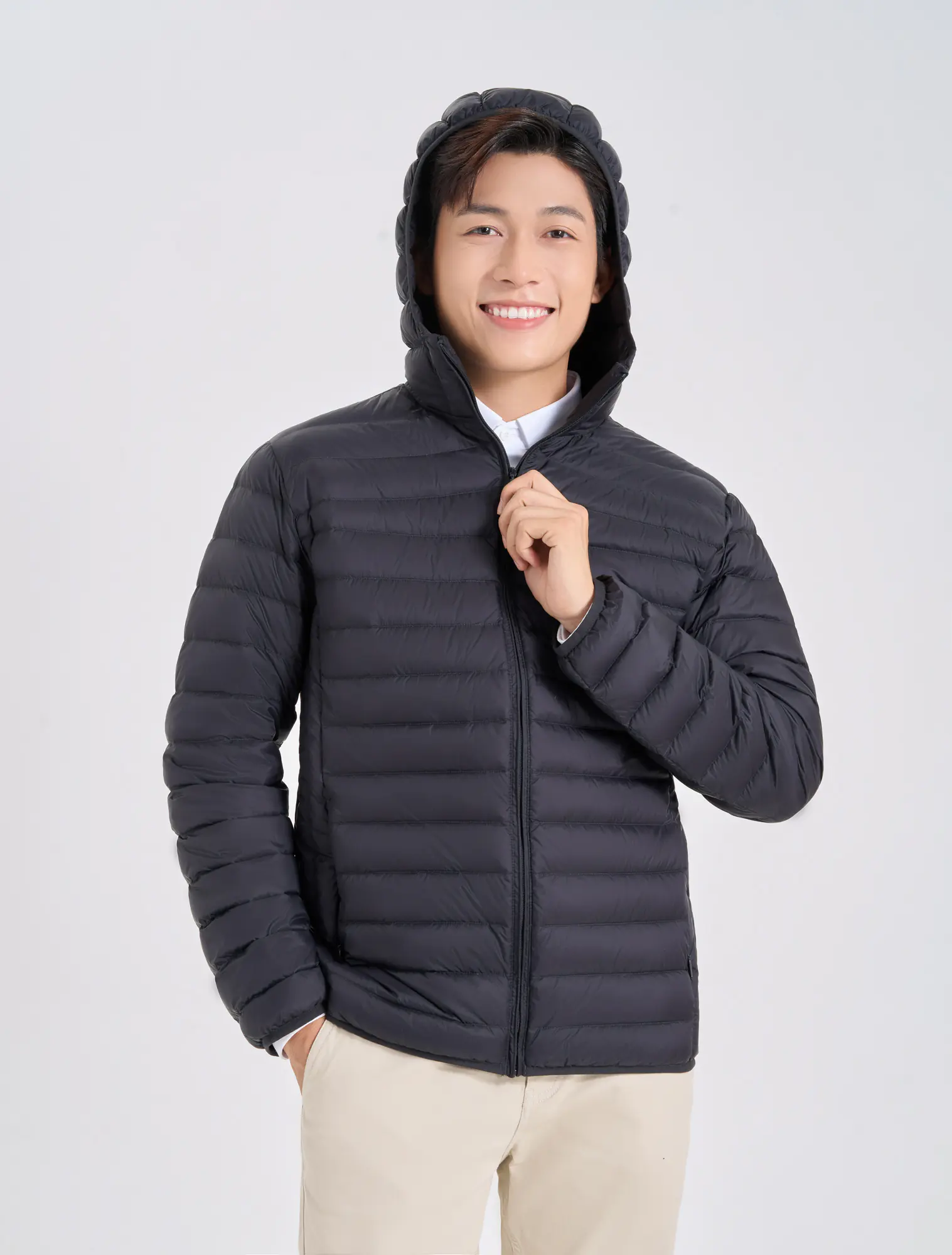 Áo khoác lông vũ nam, cổ mũ, chống thấm nước. Phần cửa tay, gấu thân có thiết kế bo chun kín tránh mất nhiệt khi mặc. Mật độ đường may của áo được kiểm soát chặt chẽ góp phần tránh tình trạng lông vũ bên trong chui qua các chân kim ra ngoài.