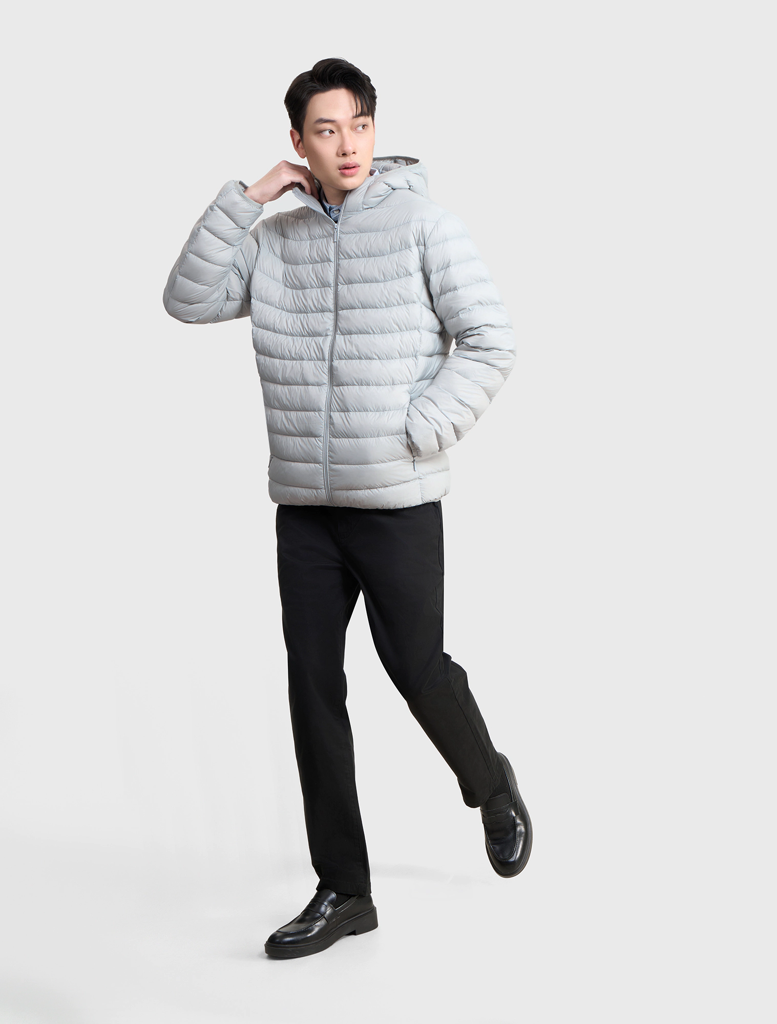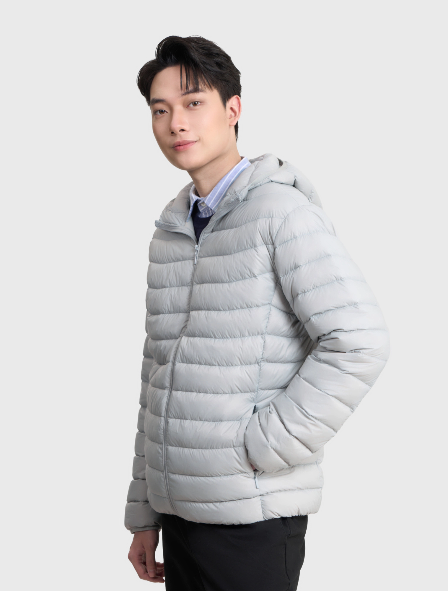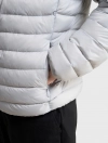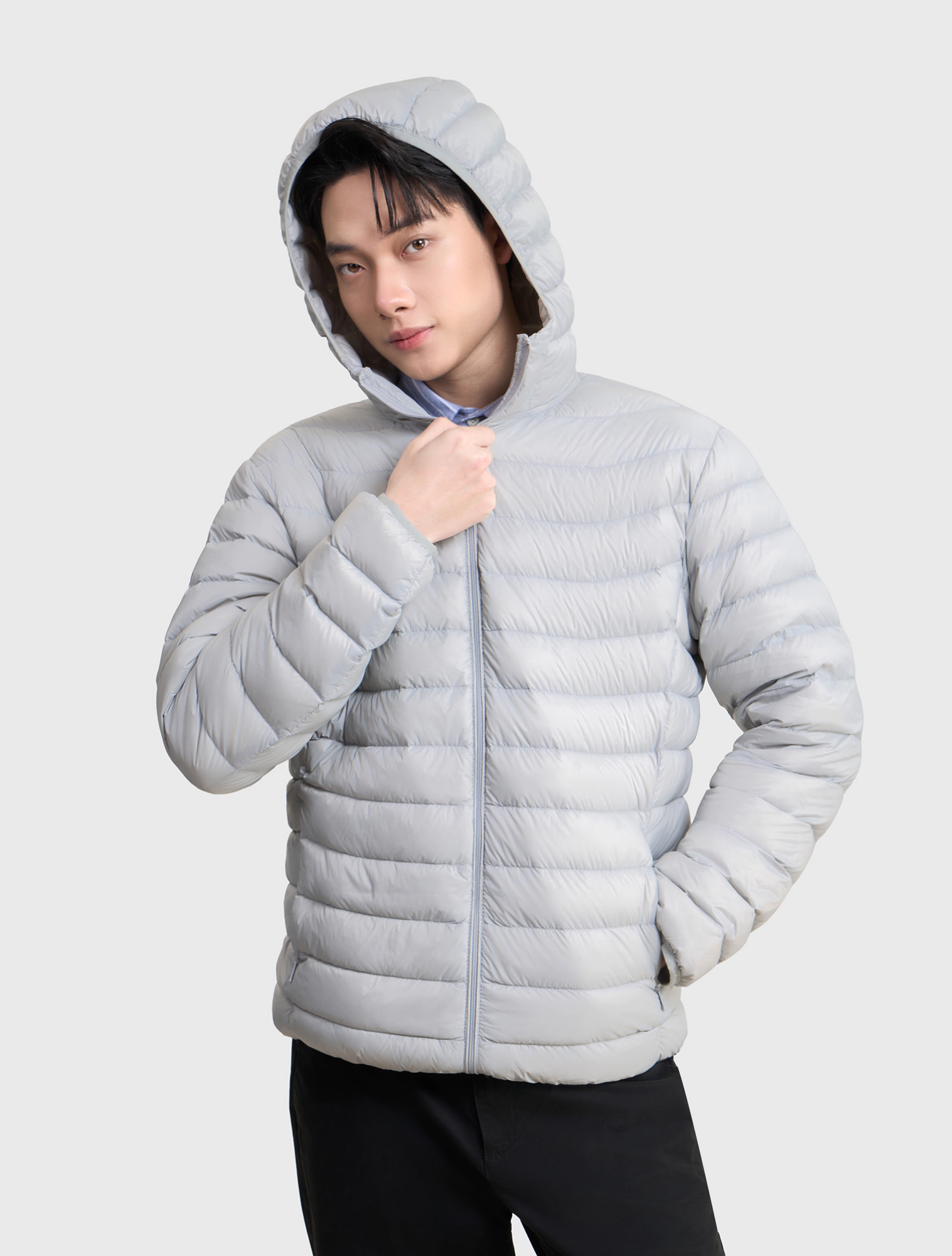 Áo khoác lông vũ nam có mũ, chống thấm nước. Phần cửa tay và gấu thân bo chun kín tránh thoát nhiệt khi mặc.