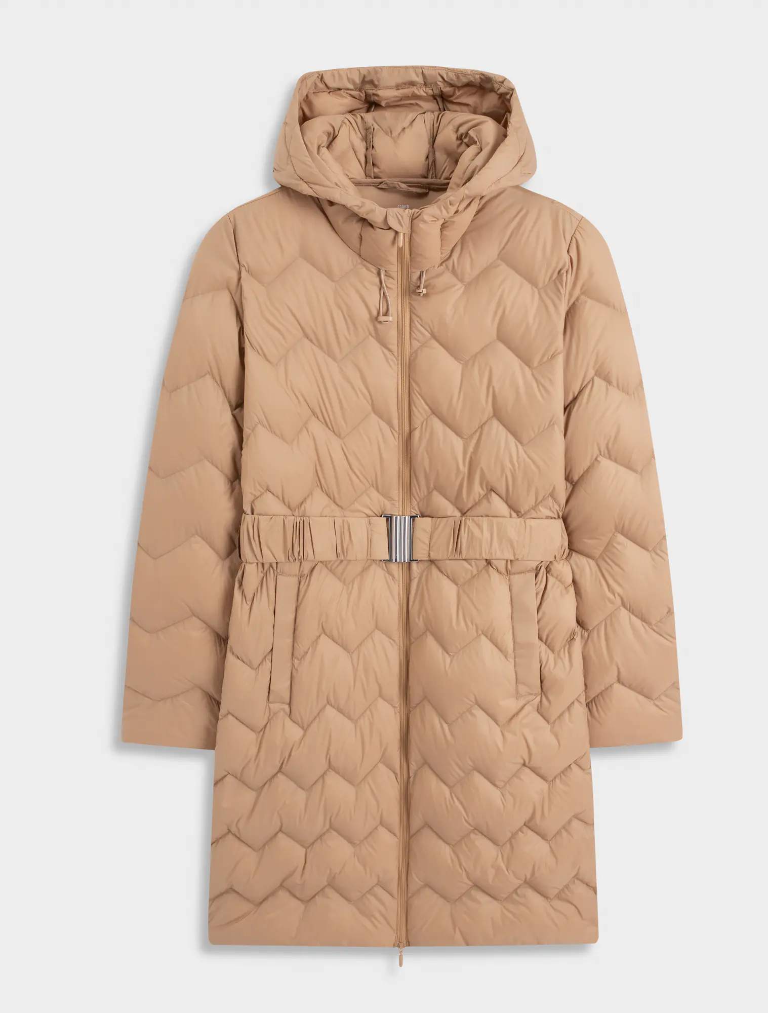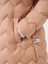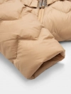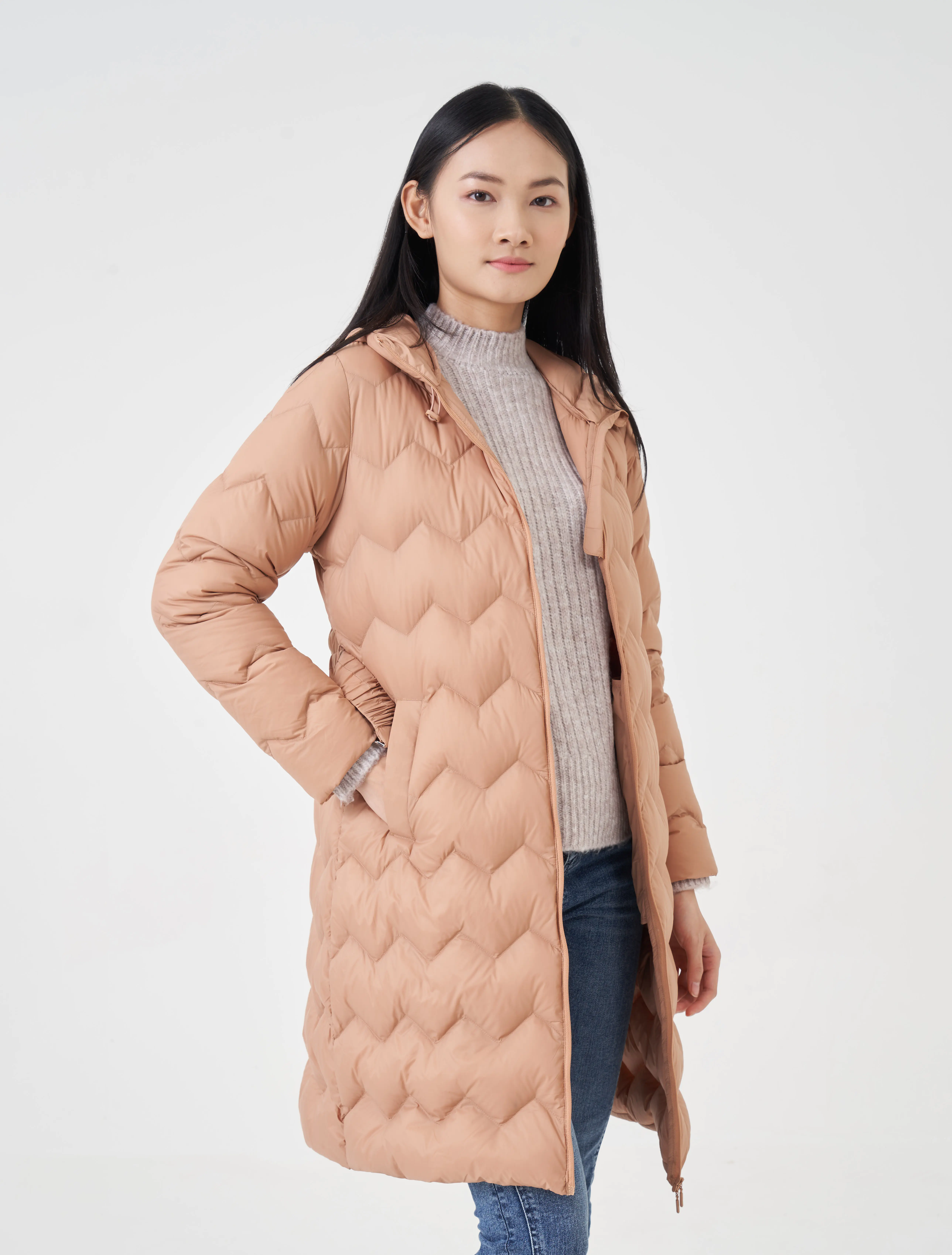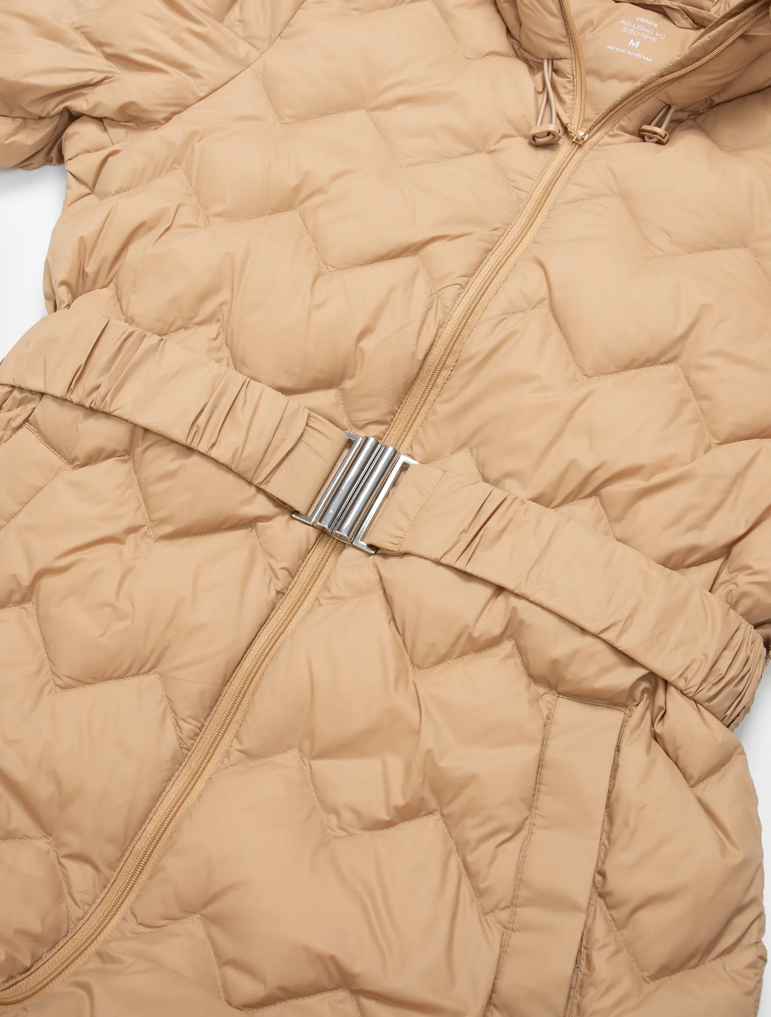 Áo khoác lông vũ dáng dài, phom dáng vừa vặn, gọn gàng, hiện đại. Đường trần bông ziczac mới lạ, đai áo trần chun có móc cài tiên lợi. Màu sắc trẻ trung sạch sẽ, phù hợp nhiều lứa tuổi. Áo giữ ấm tốt và có bề mặt chống nước.