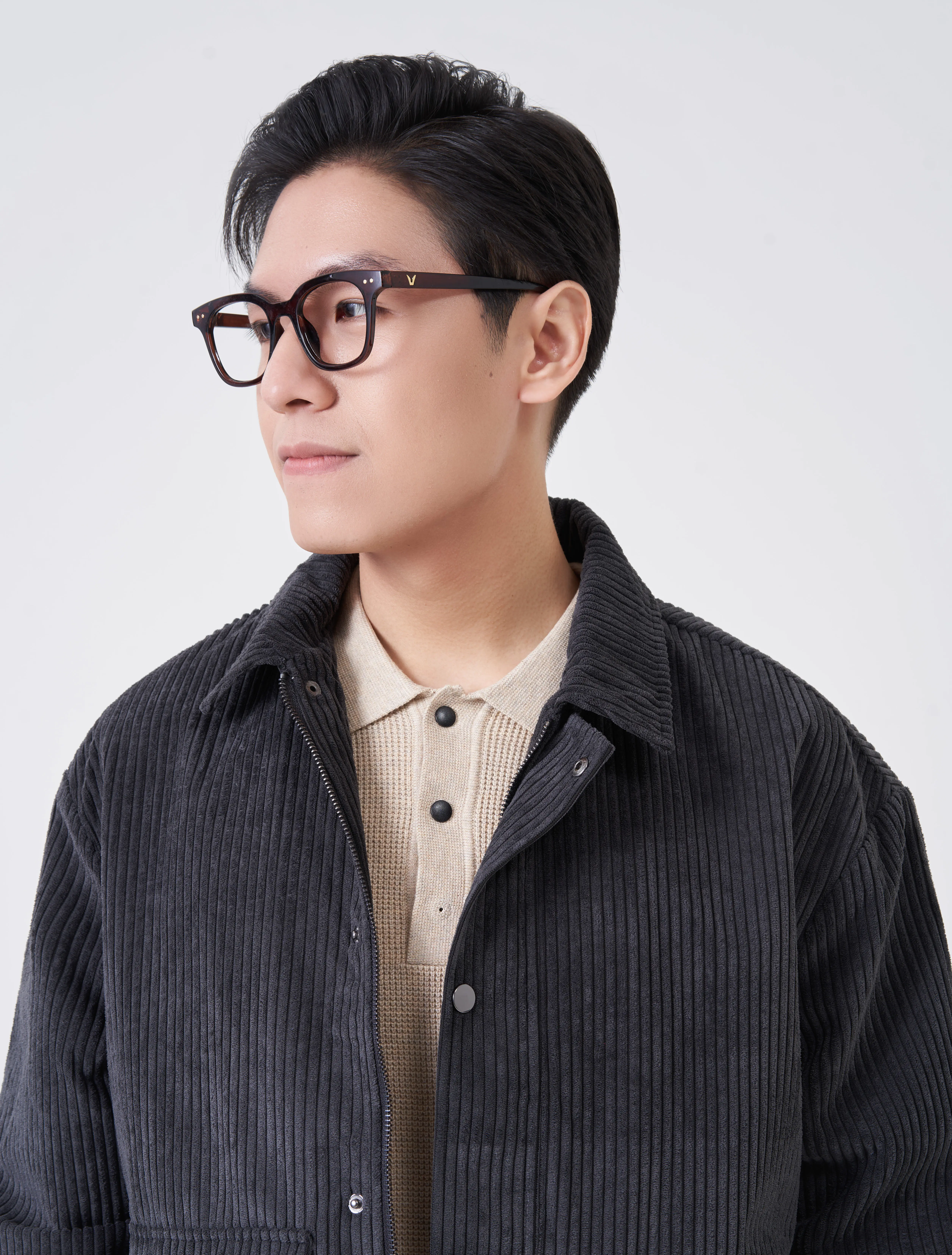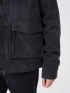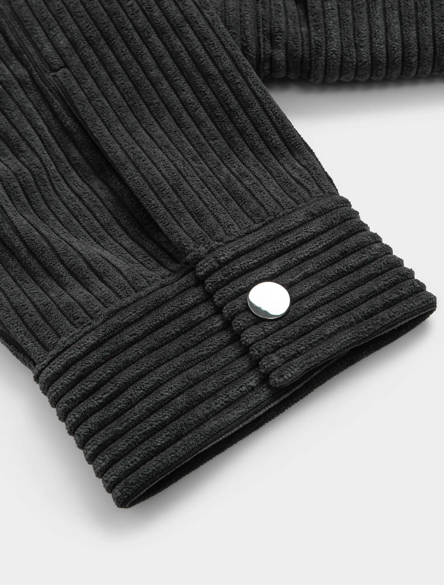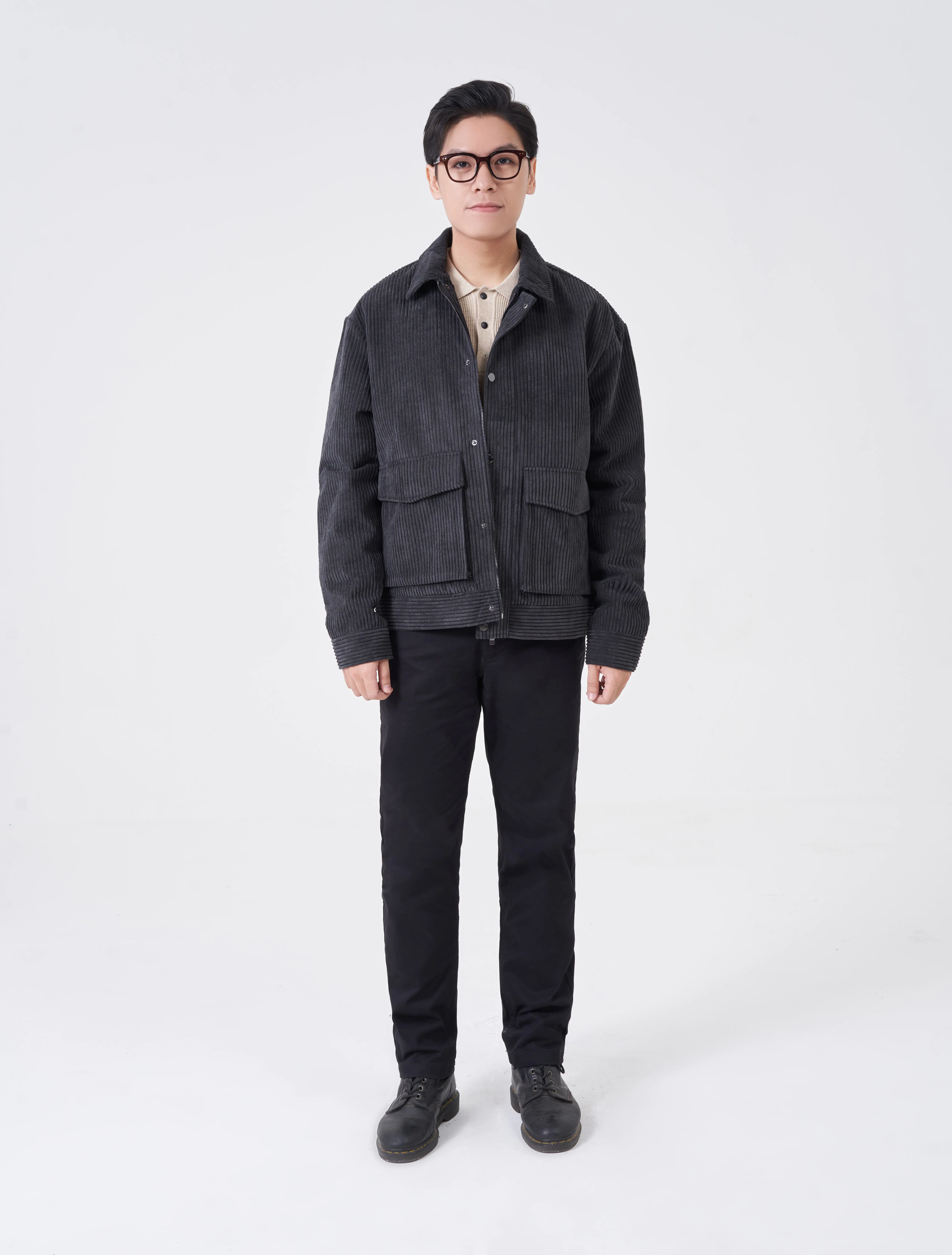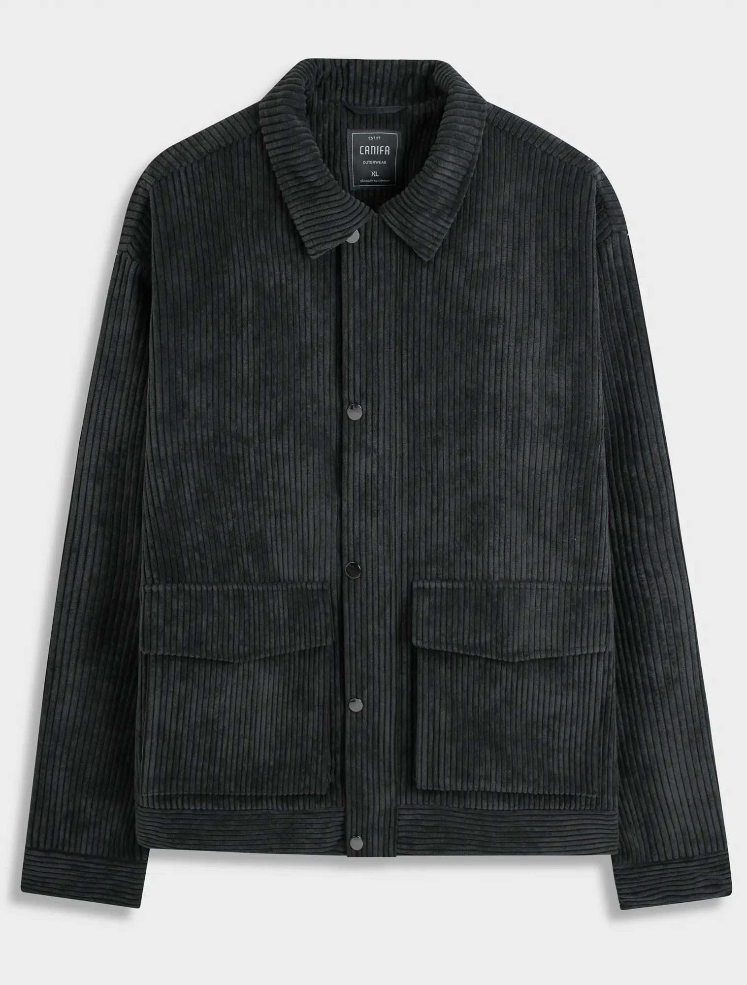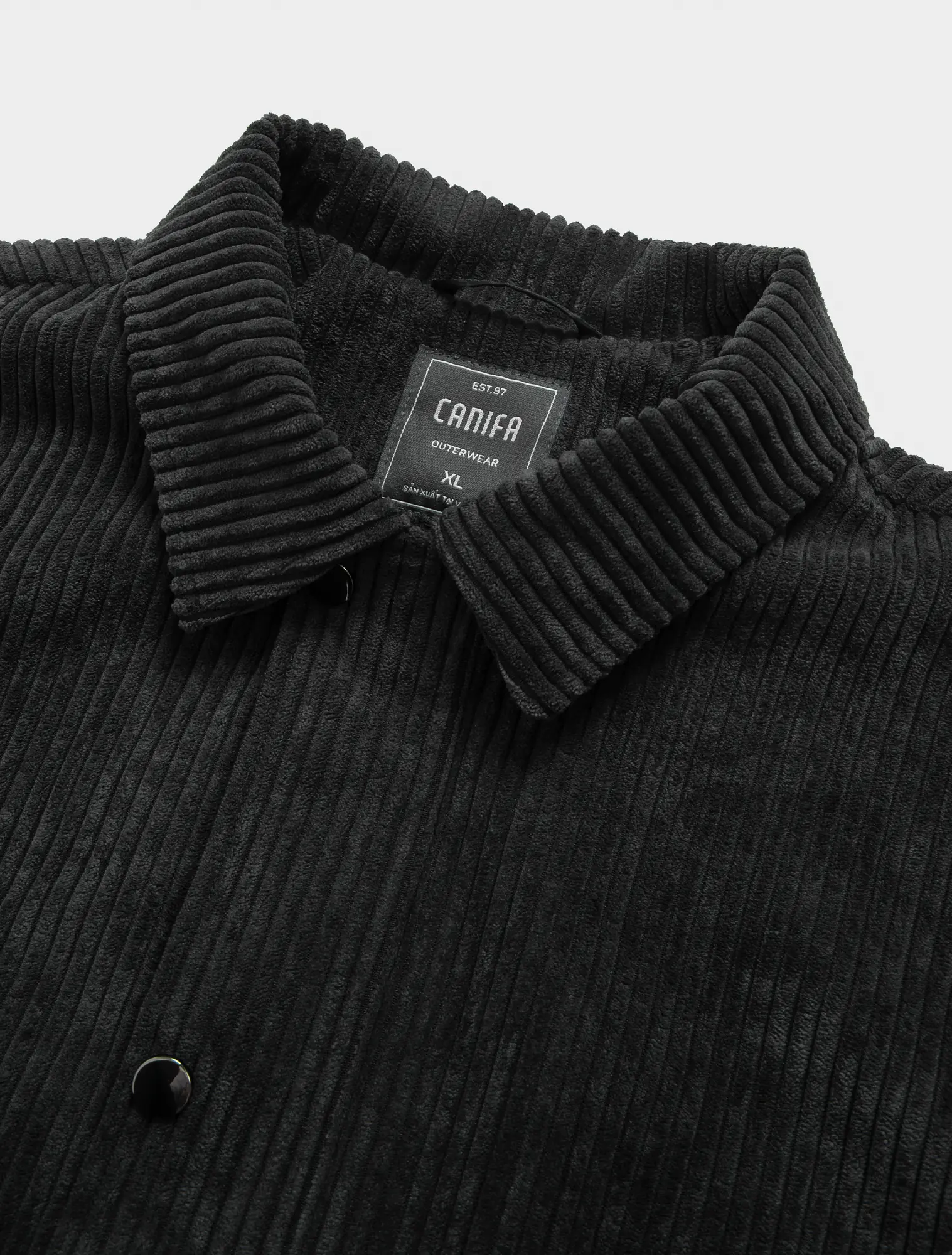 Áo khoác vải dệt kiểu hiệu ứng nhung tăm to. Cổ cao, bên trong phối vải lót cùng màu. Dài tay, cổ tay có khuy cài để điều chỉnh. Có hai túi đáp có nắp hai bên hông. Có một túi ở lớp vải lót bên trong. Cài phía trước bằng khóa kéo và khuy bấm.