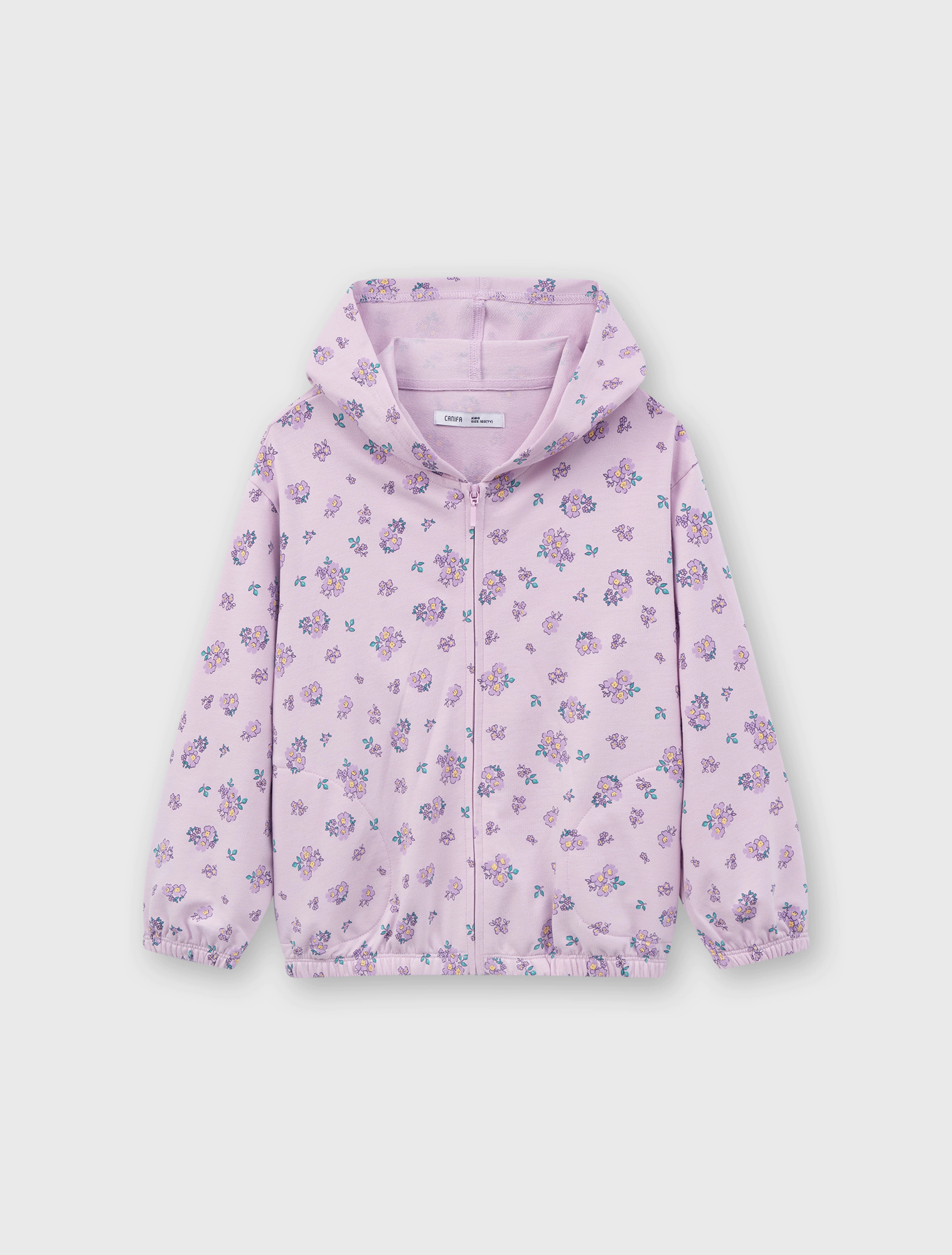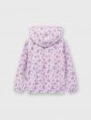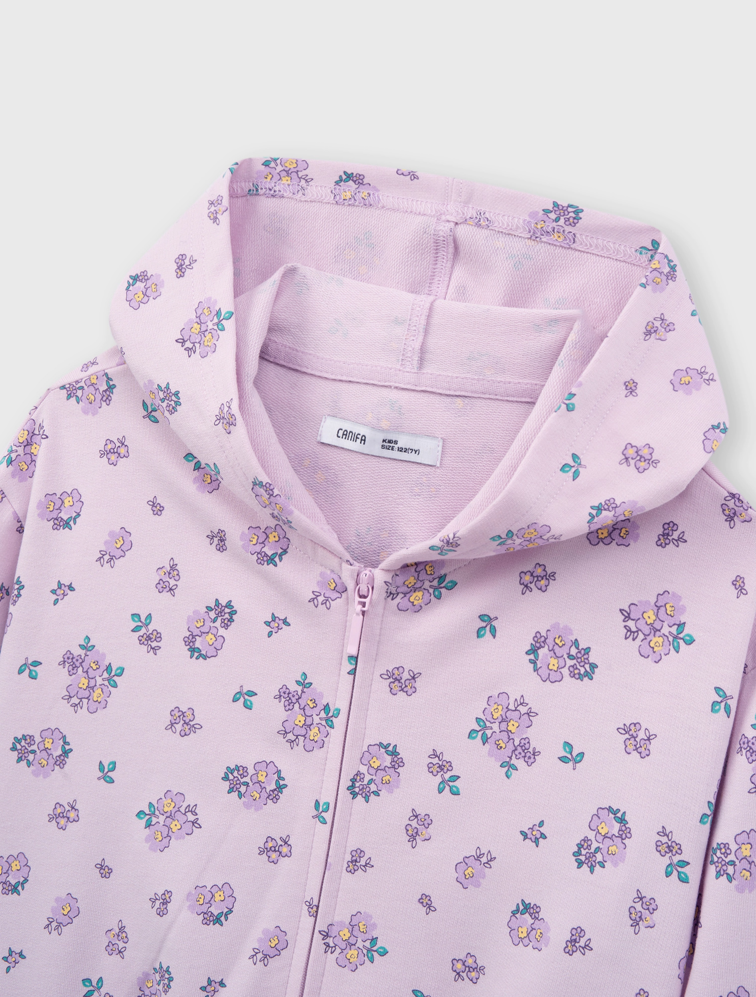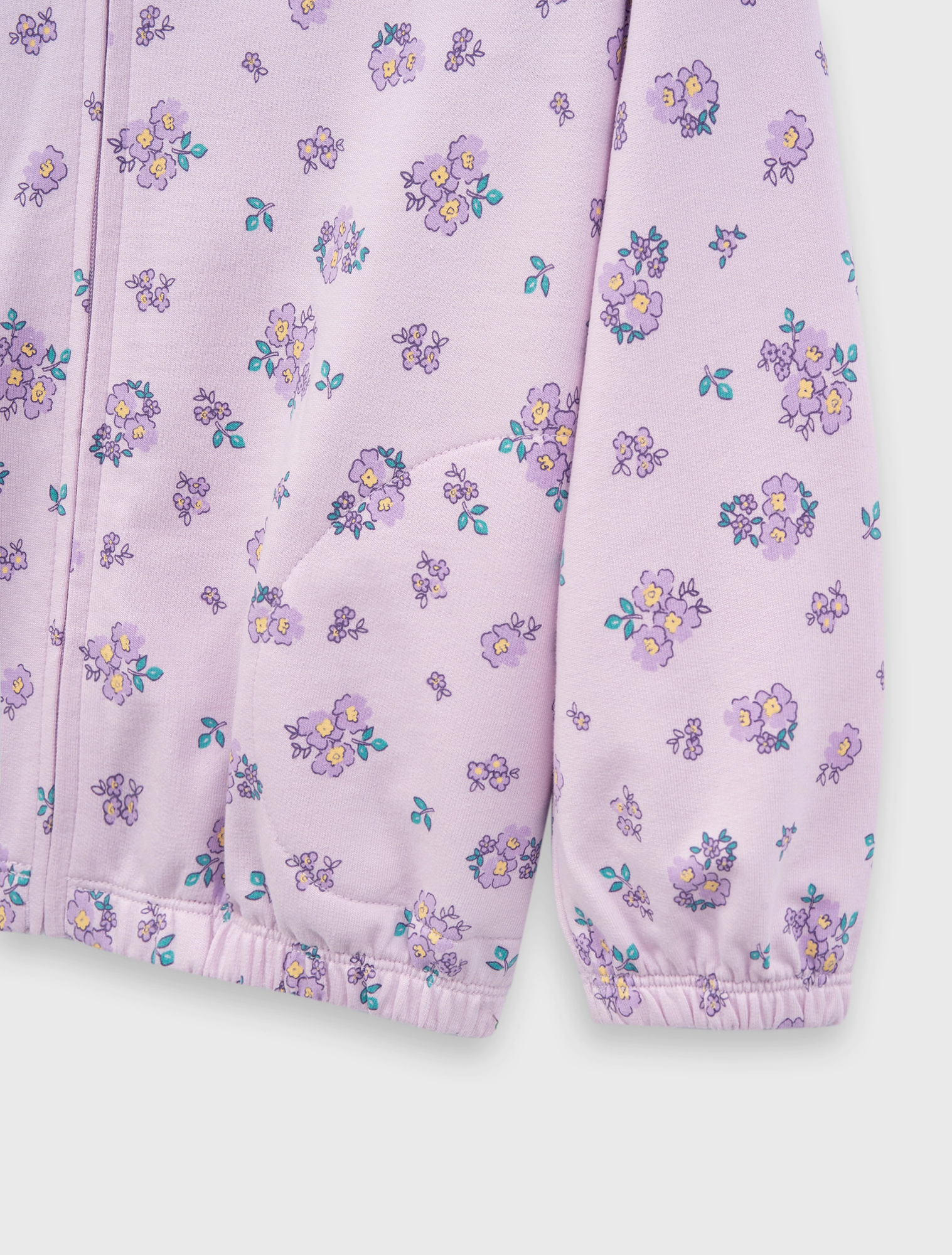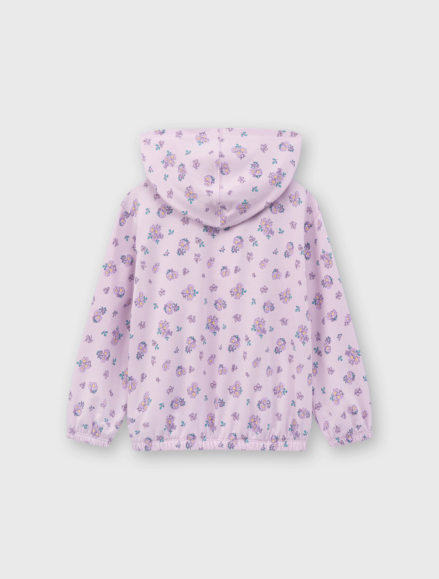 Áo khoác nỉ bé gái họa tiết với phom áo suông dễ mặc, gấu tay và gấu áo có bo chun gọn gàng.