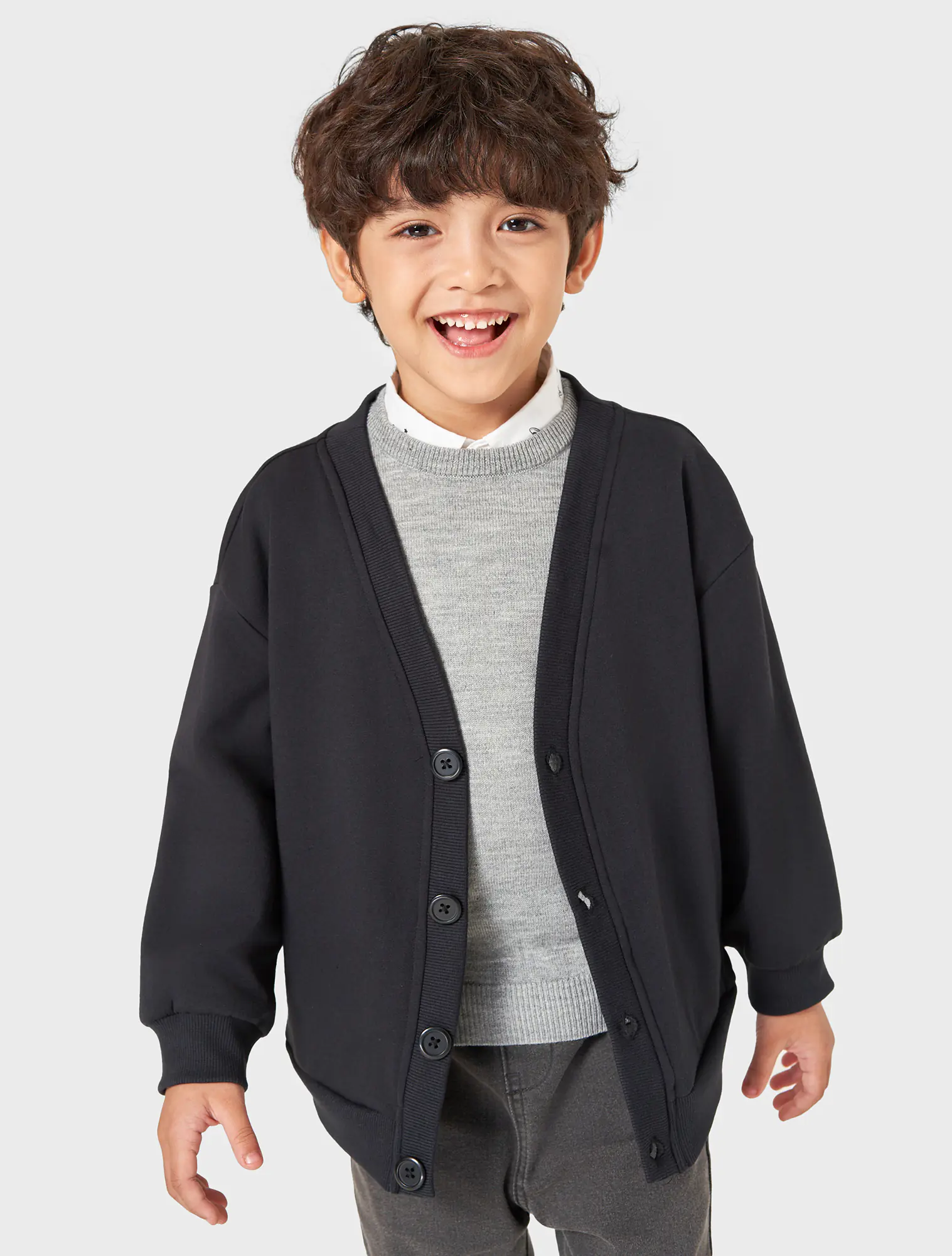Áo khoác nỉ chất liệu cotton pha, nẹp cổ, bo tay, bo gấu bằng bo rib.