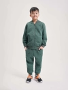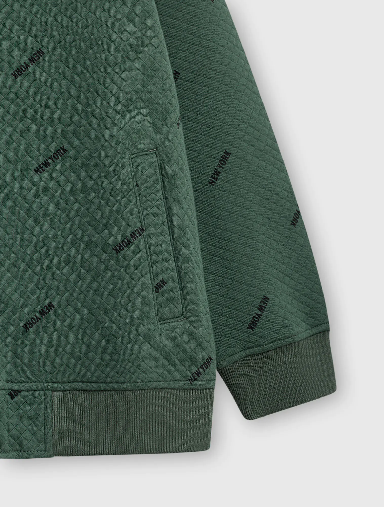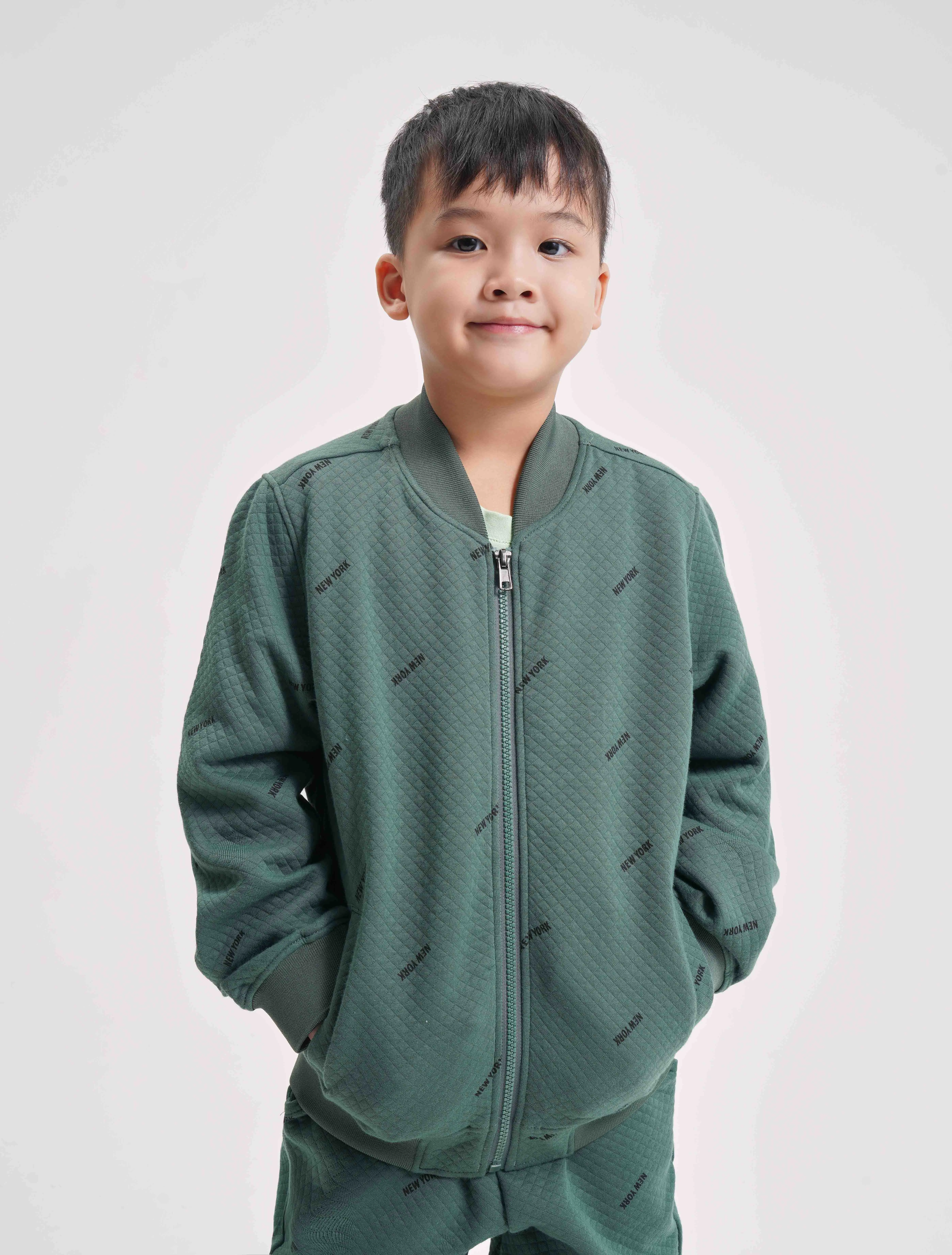 Áo khoác bomber, cổ tròn, dài tay. Kéo khóa thân. Có hai túi ở 2 bên. Nguyên liệu kiểu dập 3D in tràn.