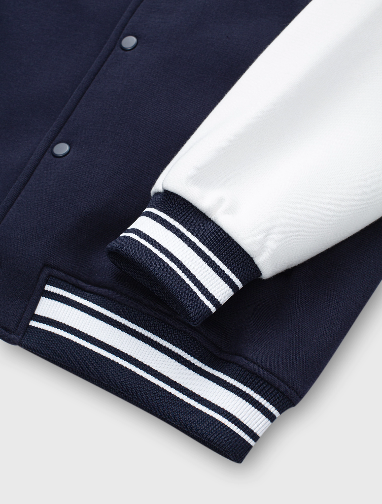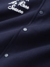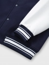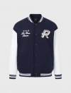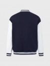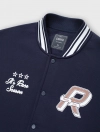 Áo khoác bomber được làm từ vải nỉ cào bông mềm có hoạ tiết thêu phía trước. Dáng rộng có cổ đứng, khuy bấm dọc thân trước. Tay áo phối màu tương phản và túi trước mổ viền. Cổ áo, gấu thân, gấu tay bằng bo rid dệt kẻ gân nổi đồng bộ.