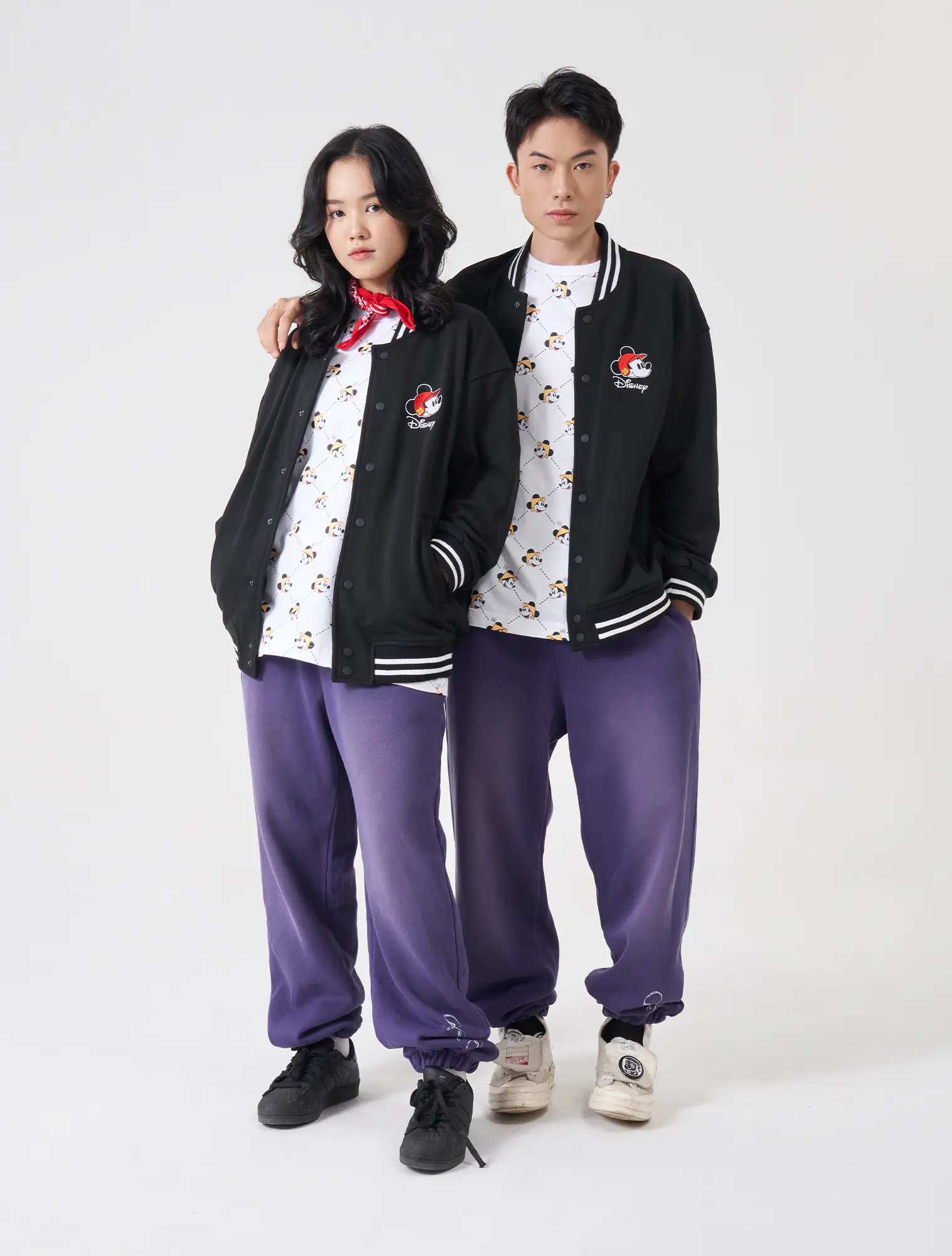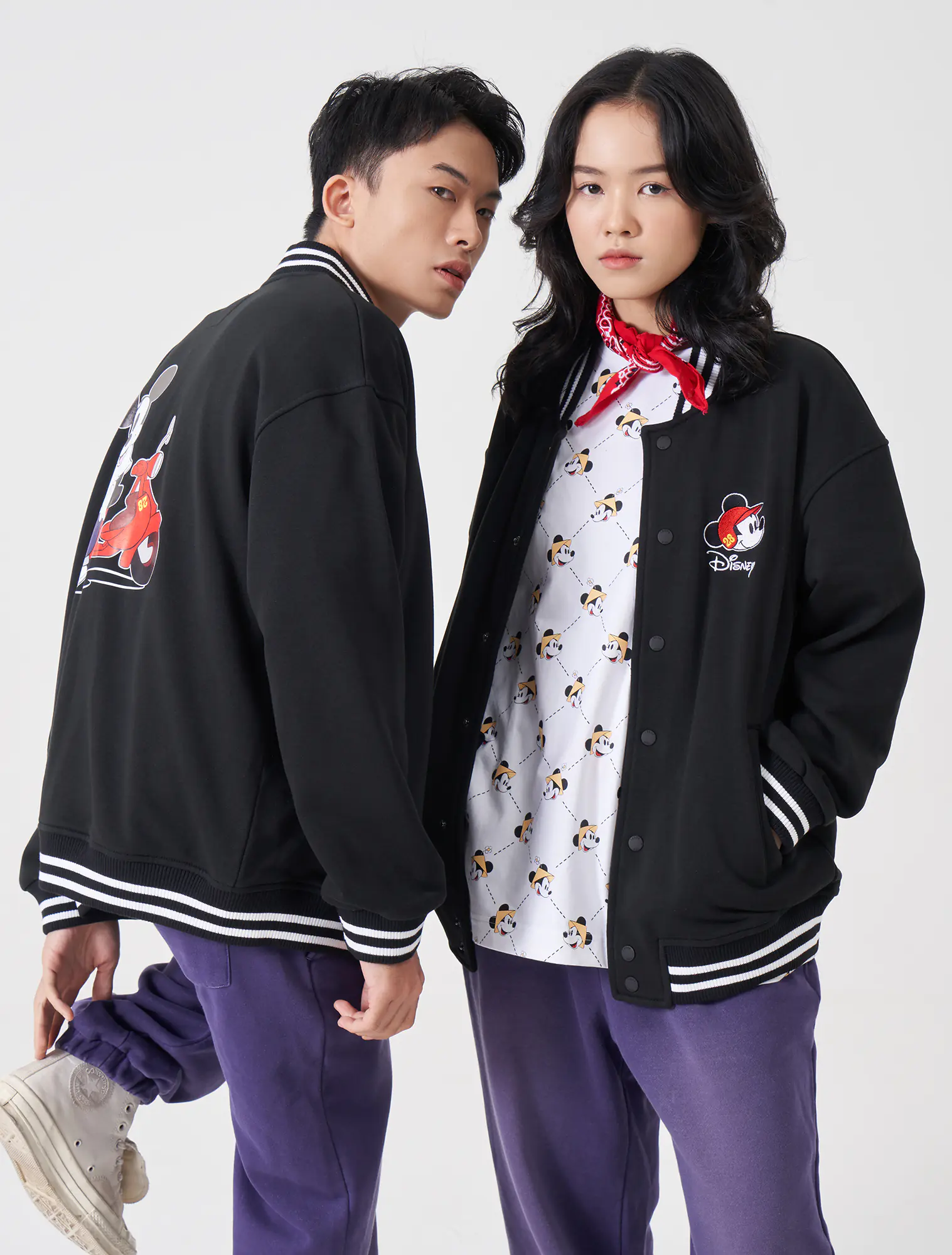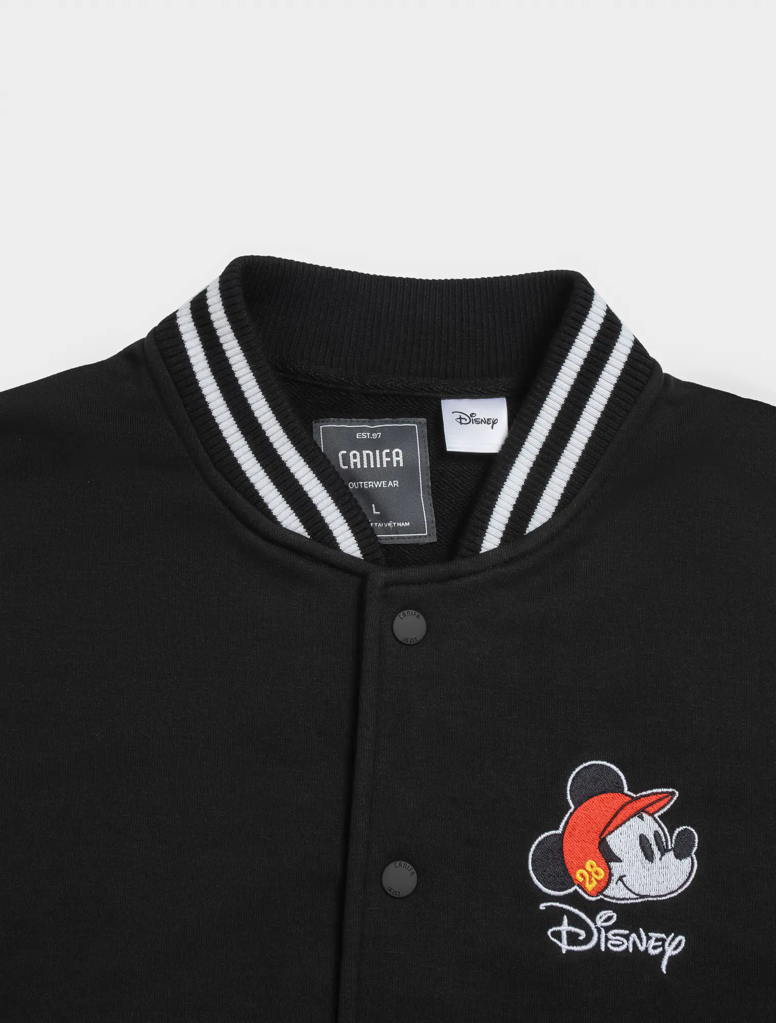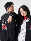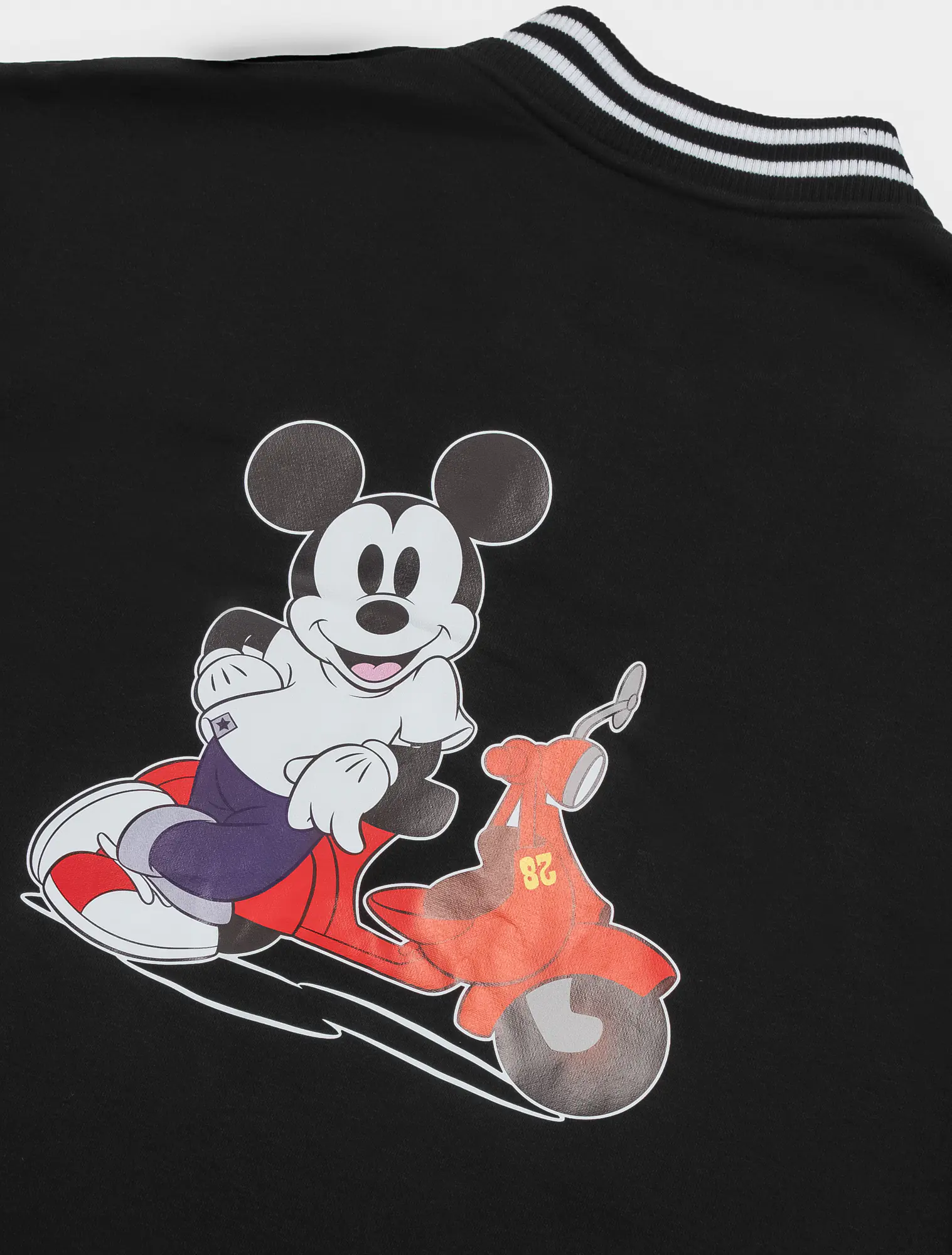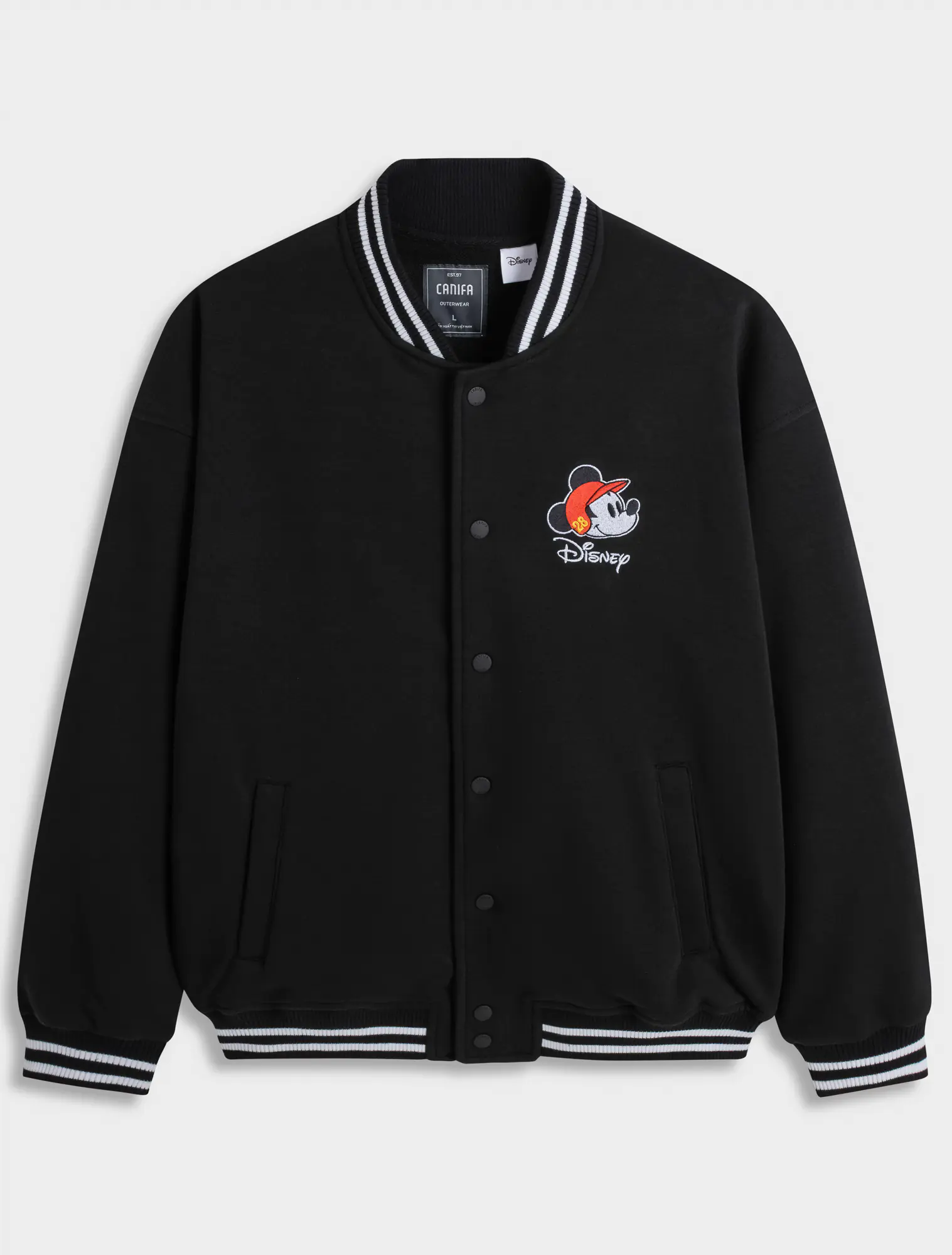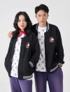 Áo khoác nỉ unisex dáng bomber, với chất liệu vải dày dặn kết hợp với phần thiết kế bo kẻ ấn tượng và đồ họa nhân vật Mickey nổi bật phía sau lưng áo, rất phụ hợp với giới trẻ.