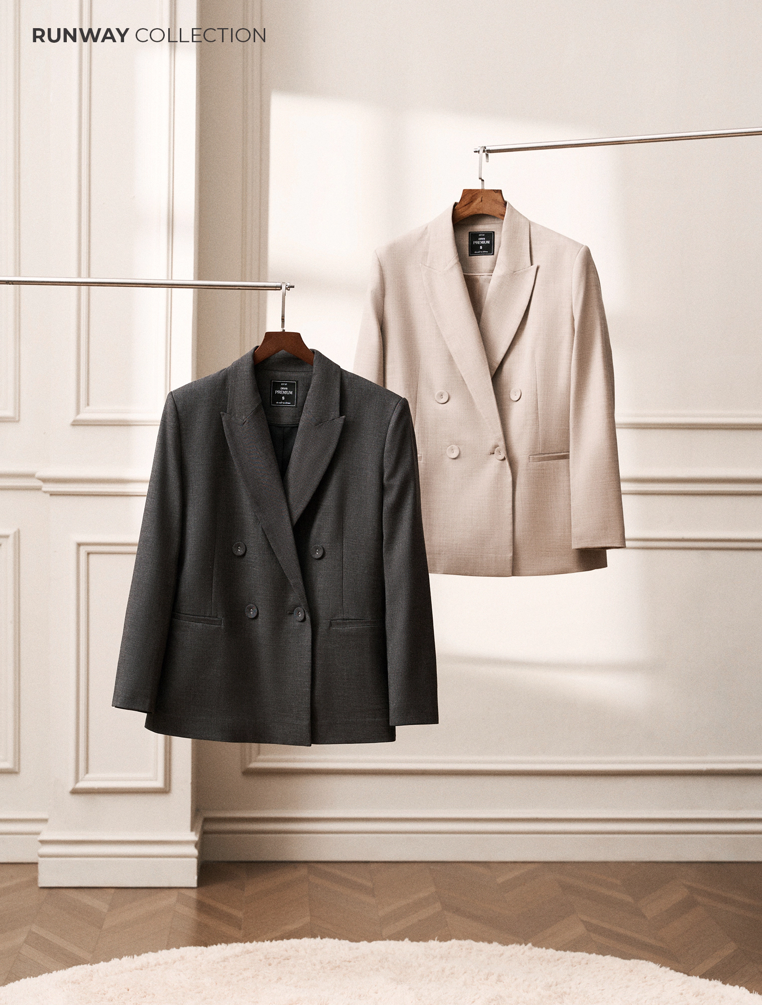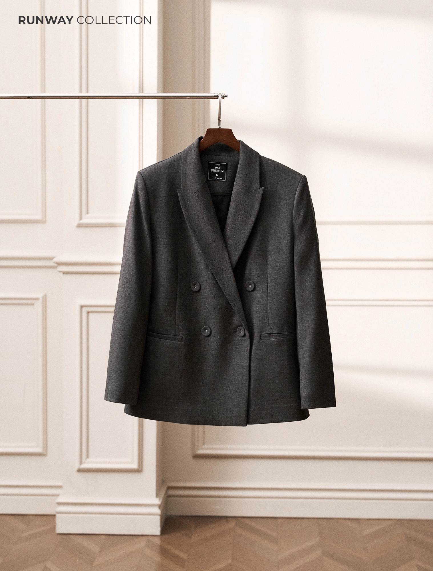 Treo bằng móc bản to, chỉnh ve/cổ và đường vai khi còn ẩm để blazer vào form đẹp.