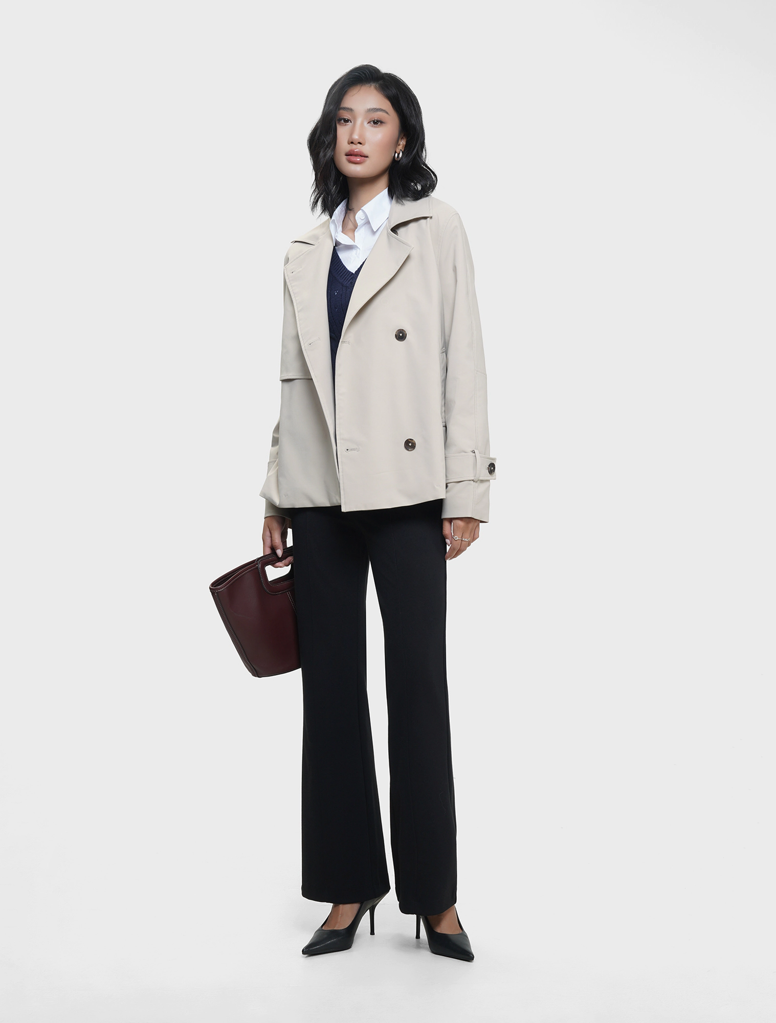 Áo khoác nữ, thiết kế dài tay hai lớp, dáng lửng, cổ bẻ ve, phù hợp với nhiều hoàn cành đi làm, dạo phố.