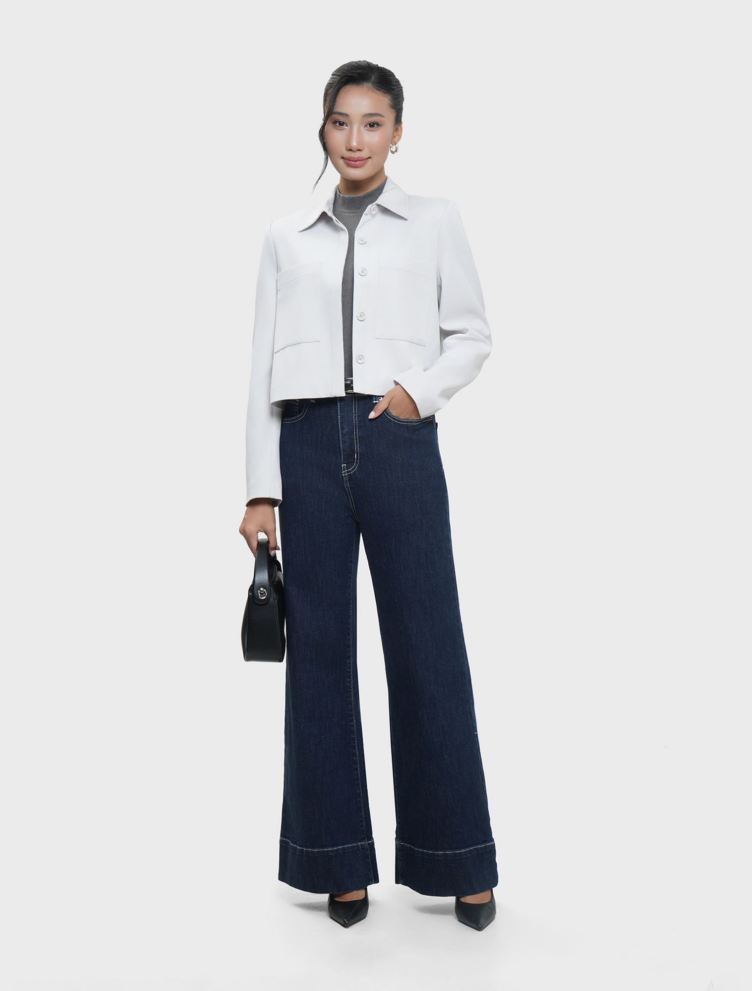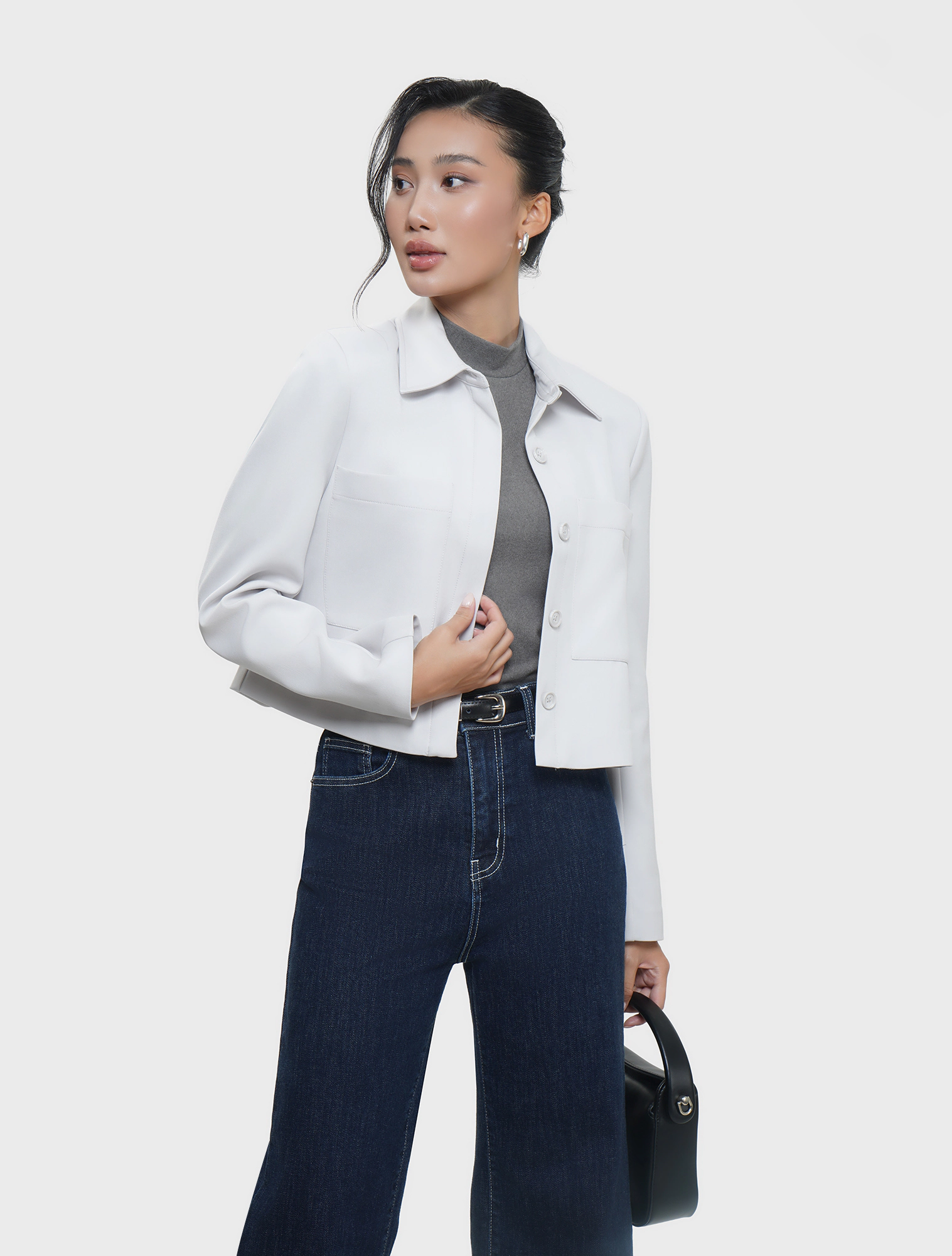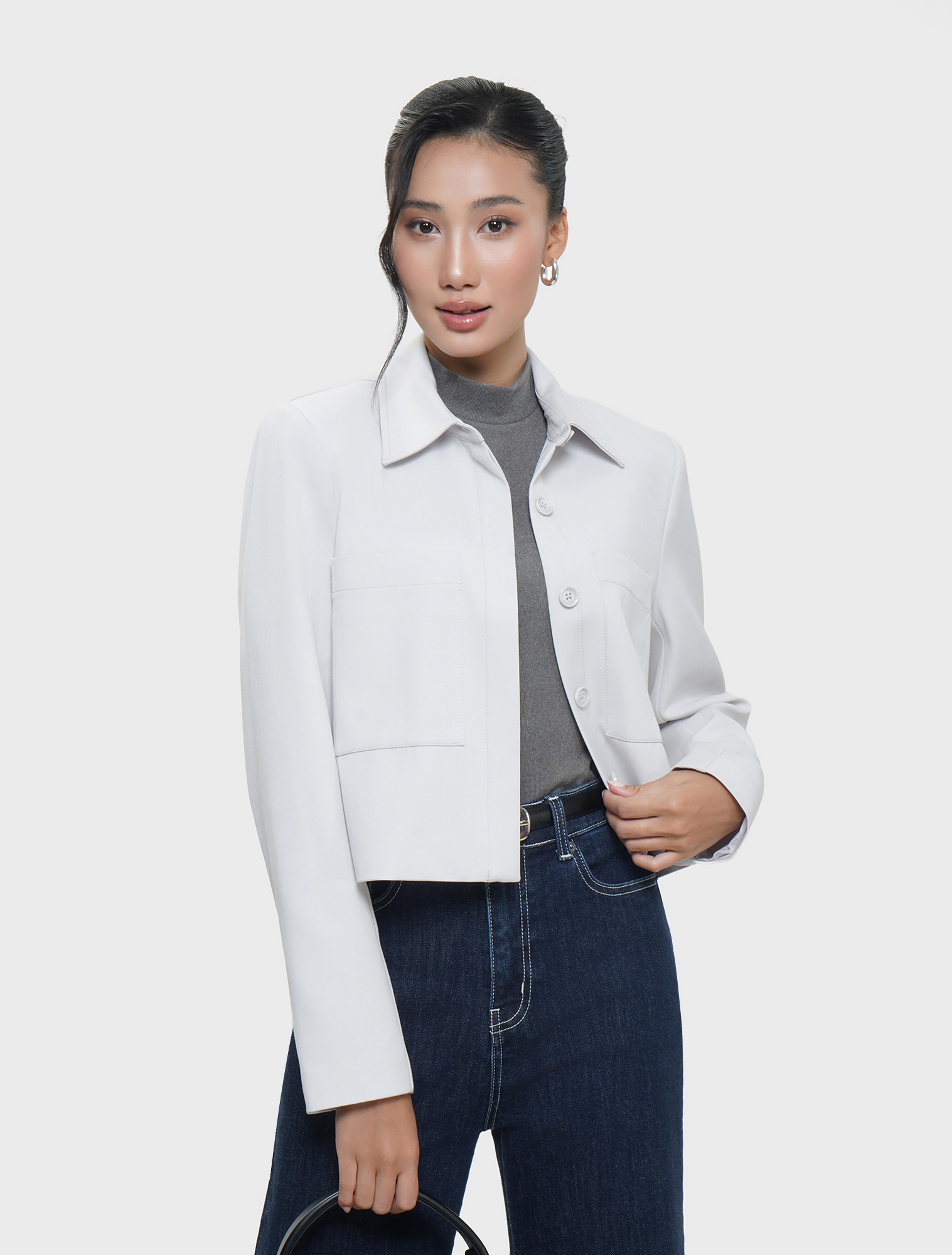 Áo khoác nữ 2 lớp cổ bẻ dáng ngắn, rộng vừa. Chất liệu mềm mại, dễ chịu, phù hợp môi trường công sở, dạo phố.