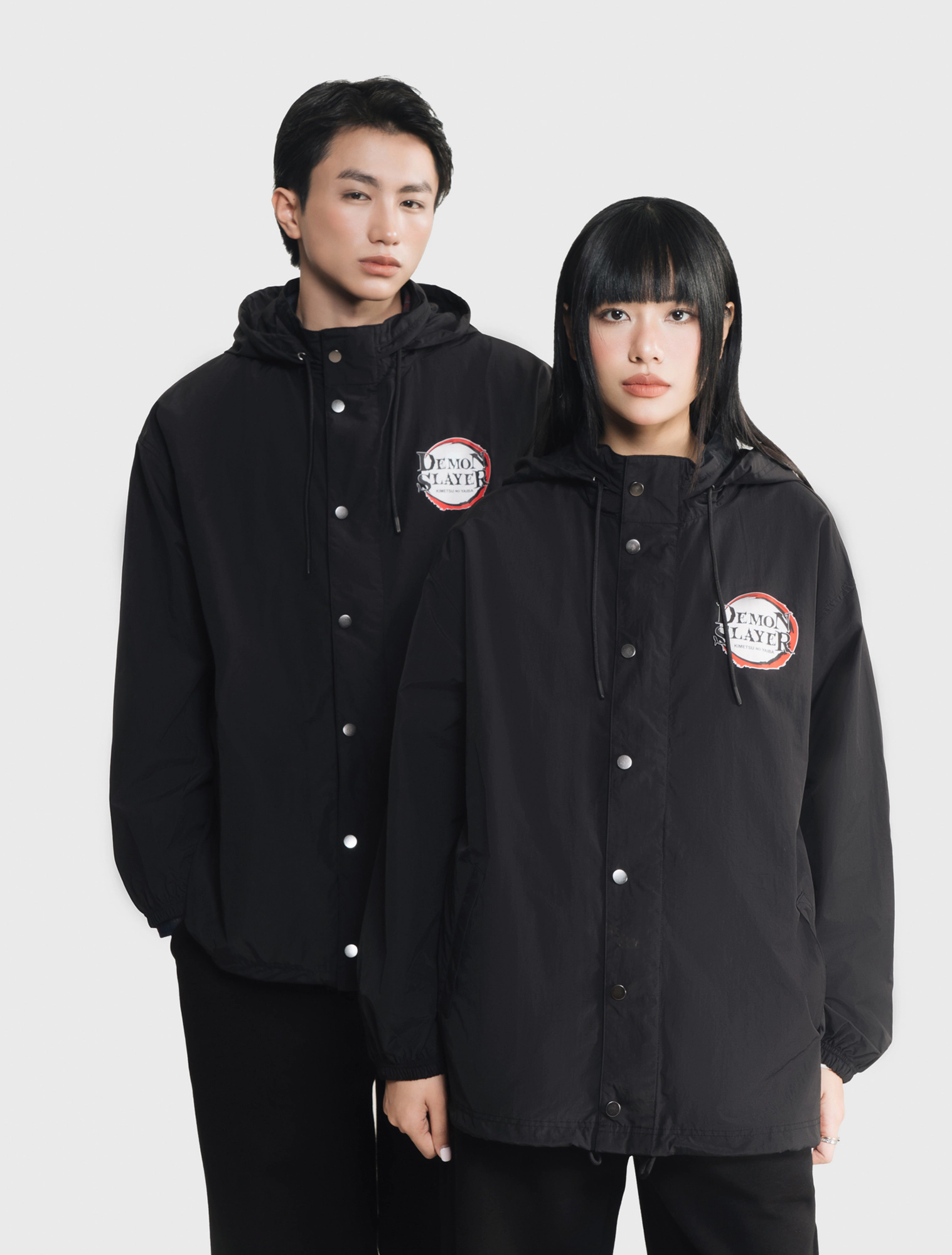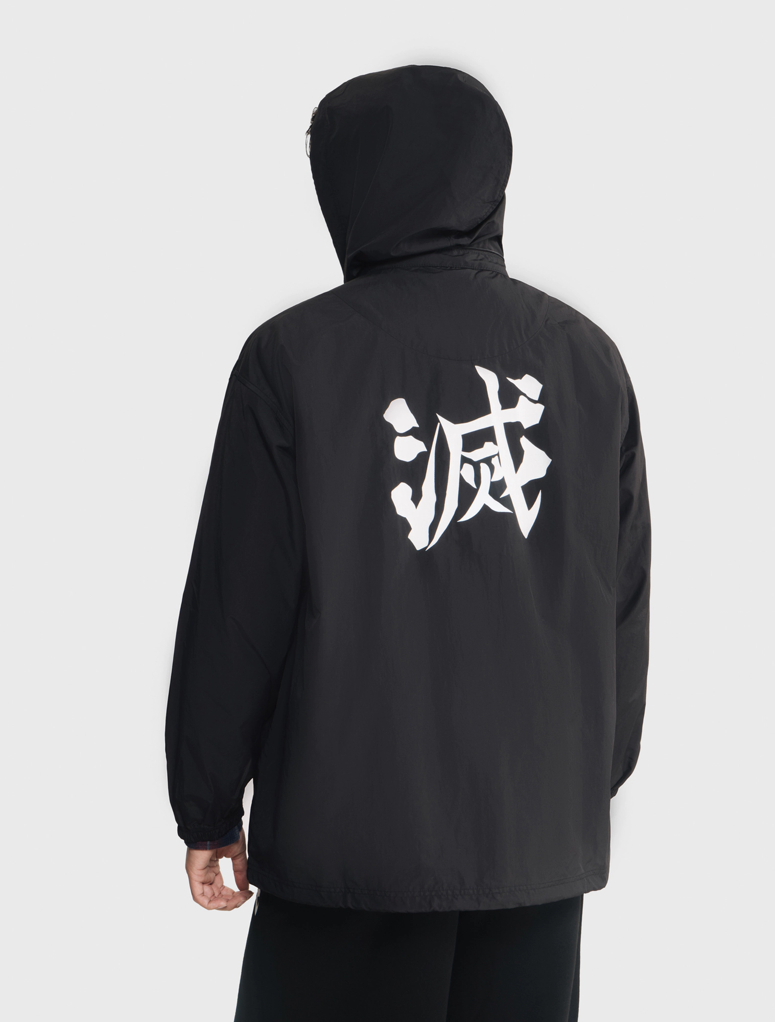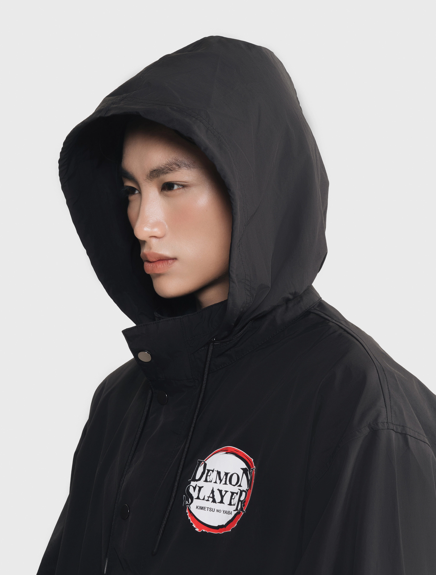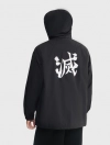 Áo khoác gió unisex người lớn. Phom áo relax thoải mái, hiện đại. Mũ áo có thể gấp gọn nhét vào cổ áo. Áo màu đen, hình in Demon Slayer thời trang, phù hợp cả nam và nữ.