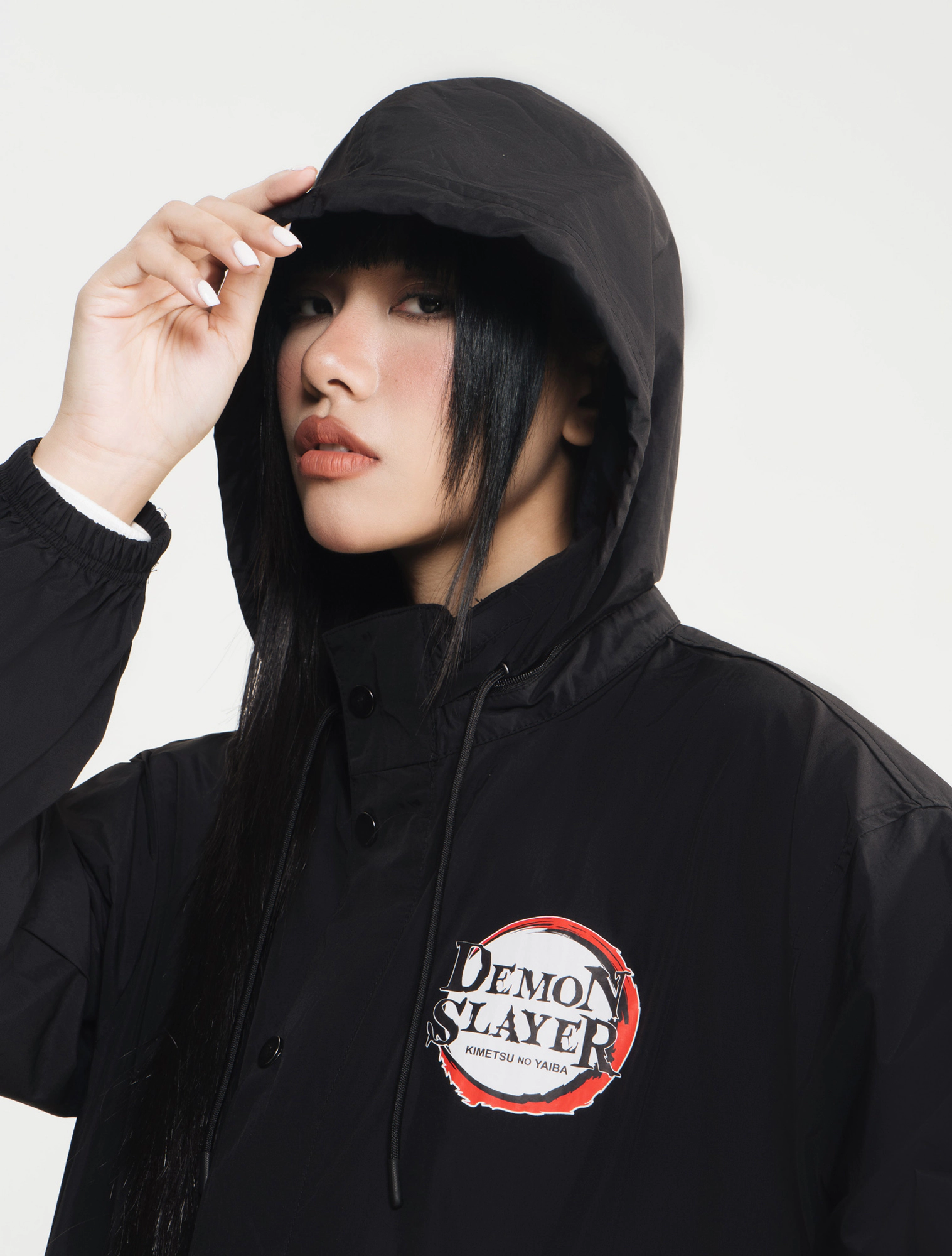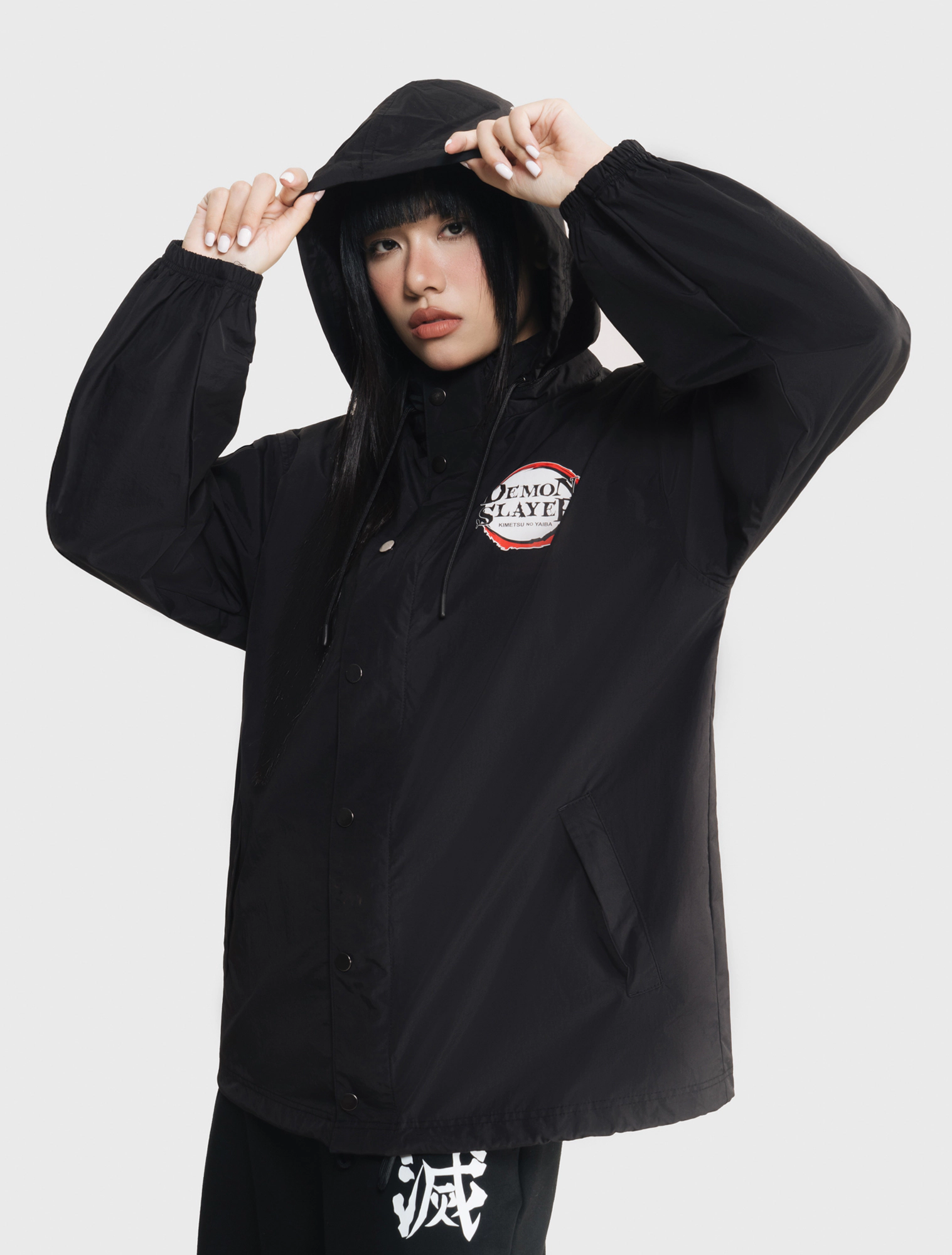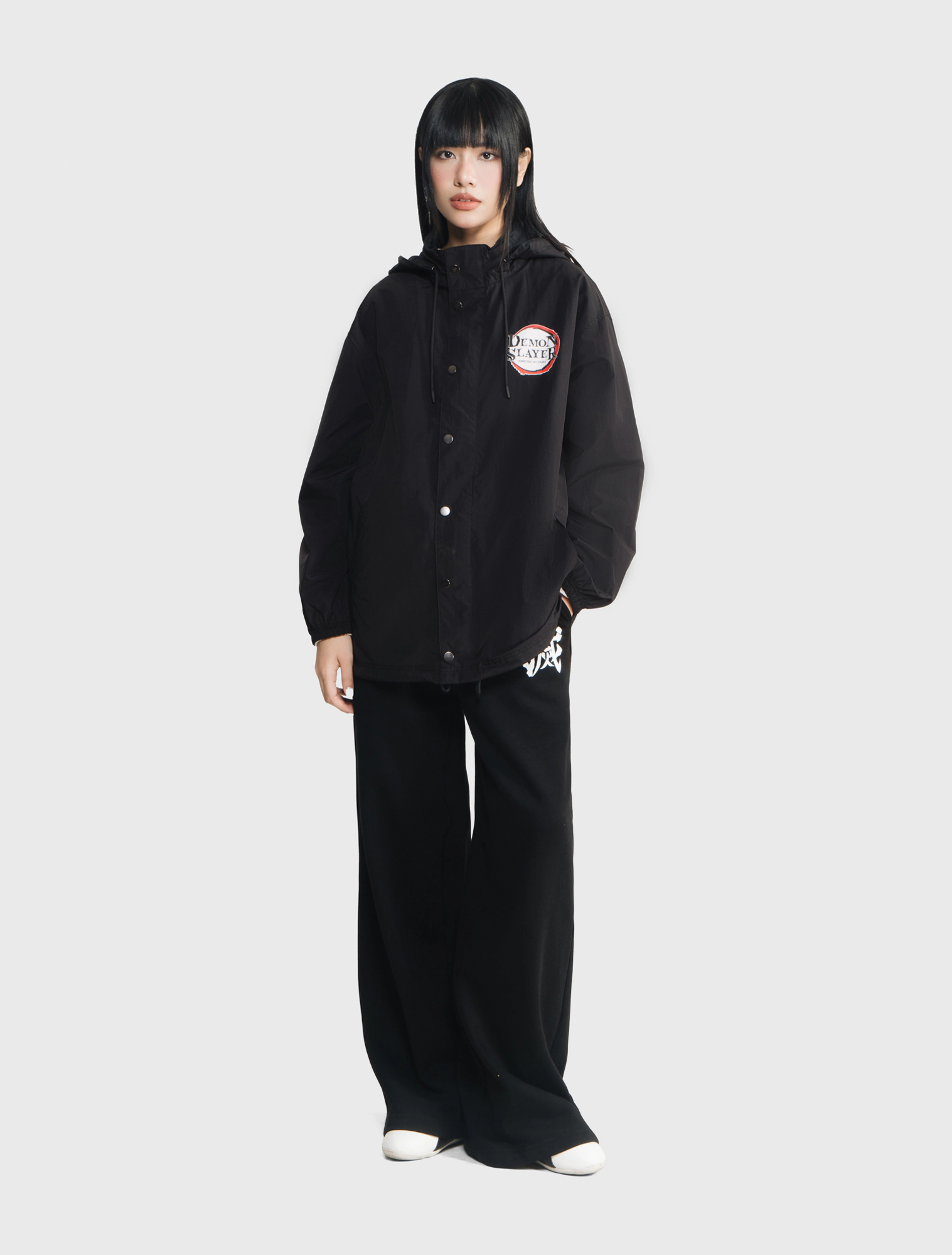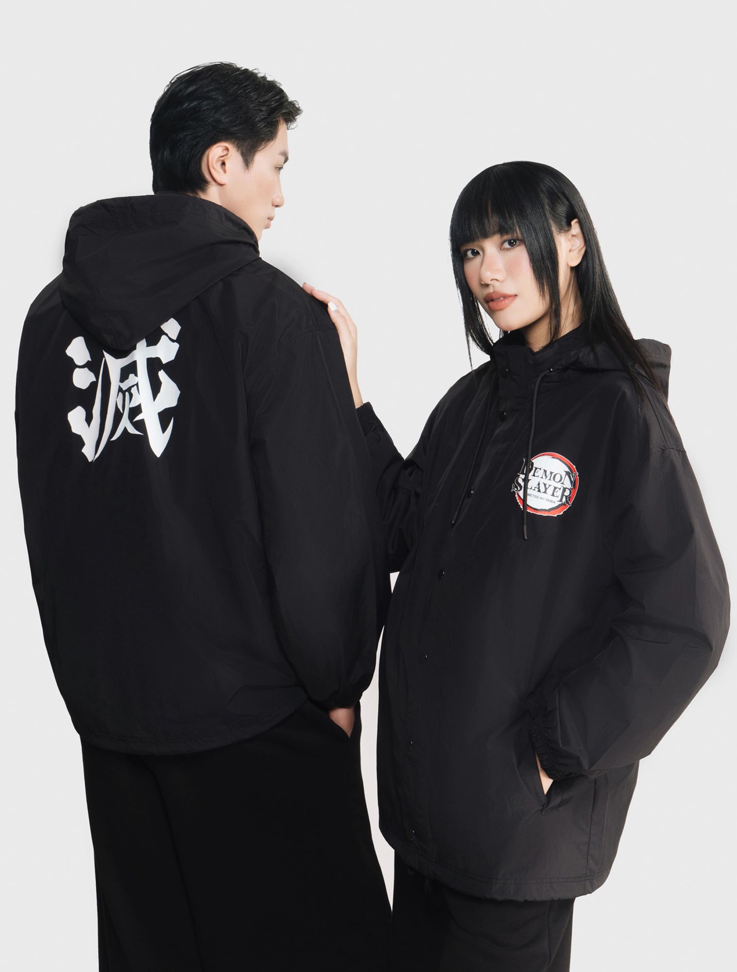 Áo khoác gió unisex người lớn. Phom áo relax thoải mái, hiện đại. Mũ áo có thể gấp gọn nhét vào cổ áo. Áo màu đen, hình in Demon Slayer thời trang, phù hợp cả nam và nữ.