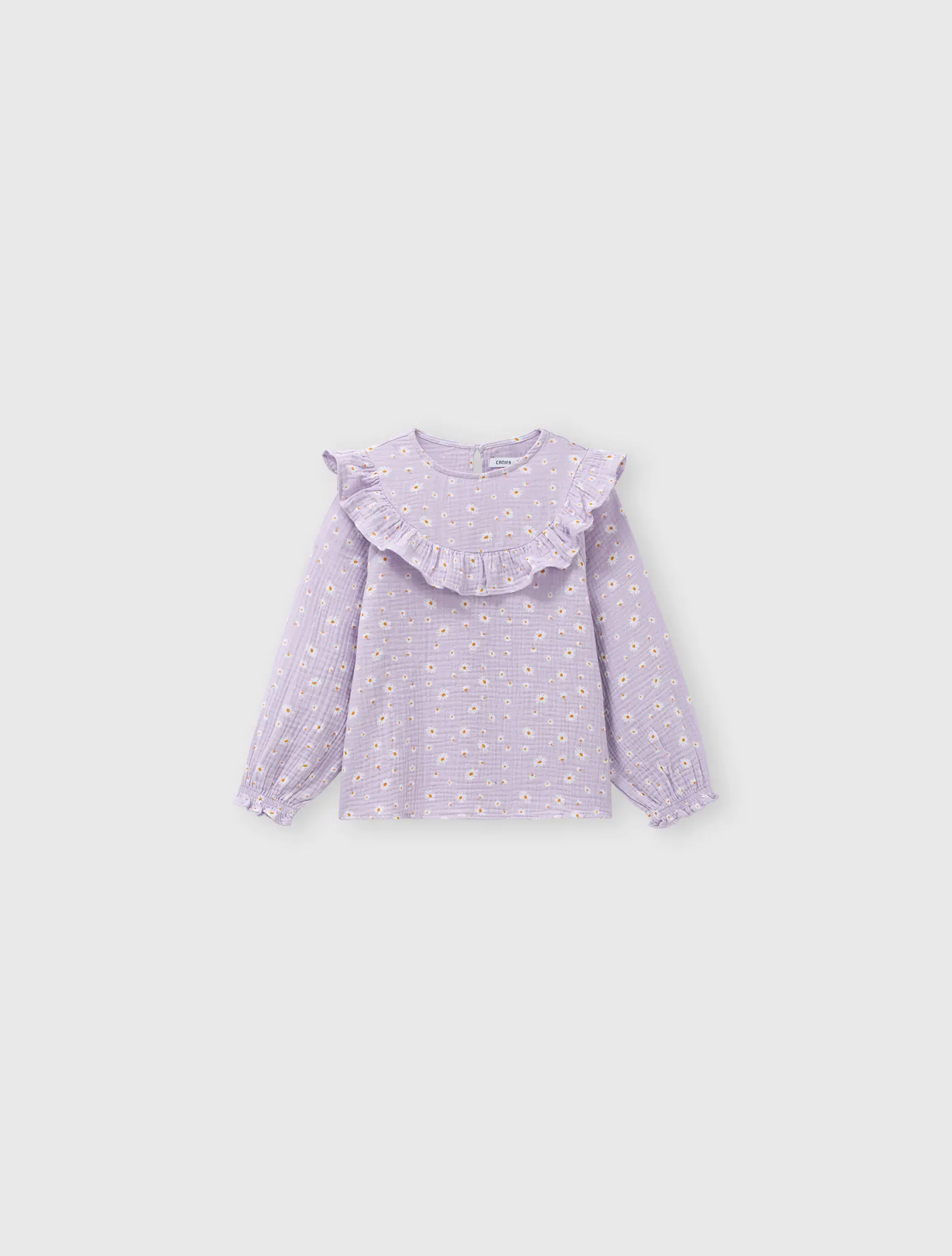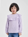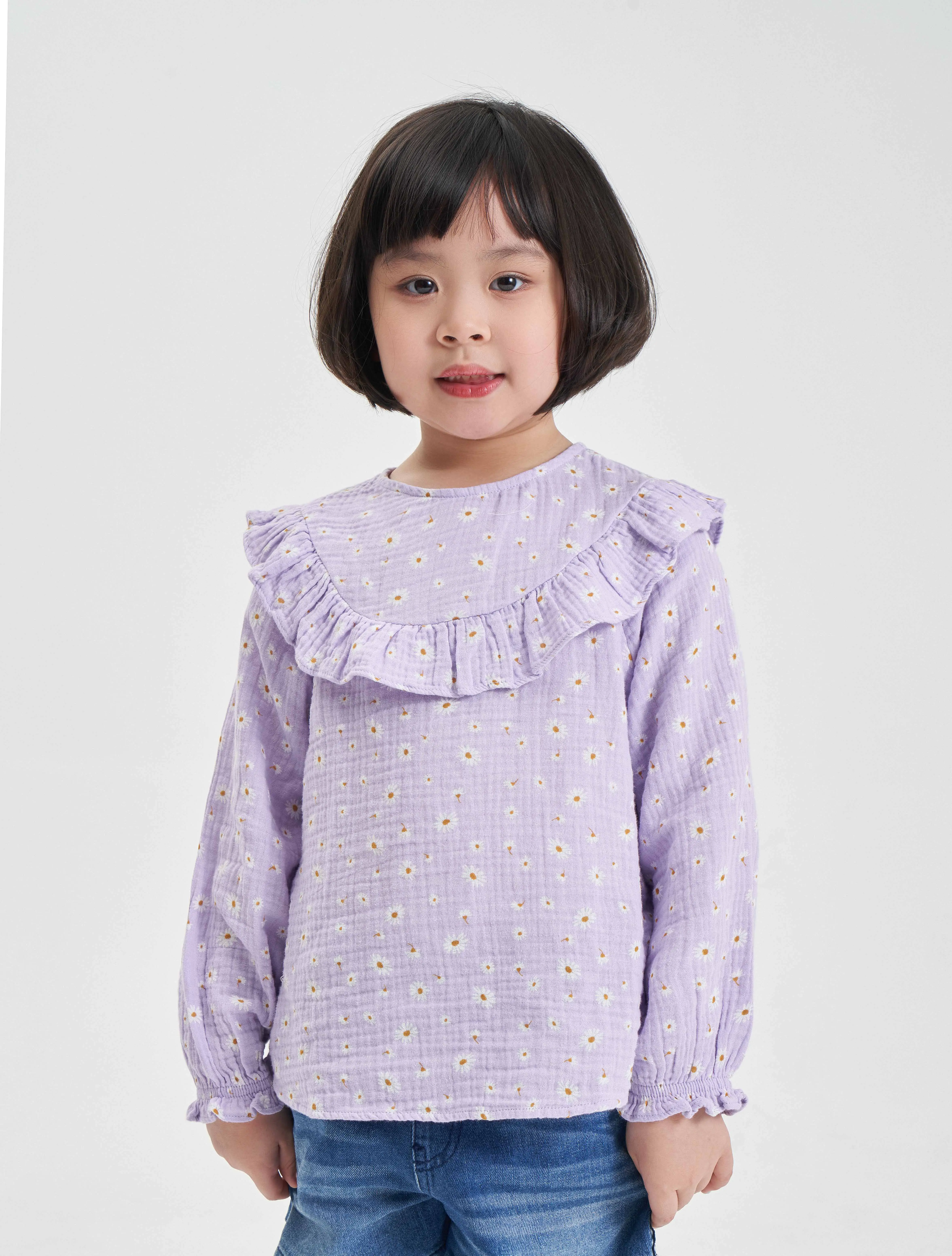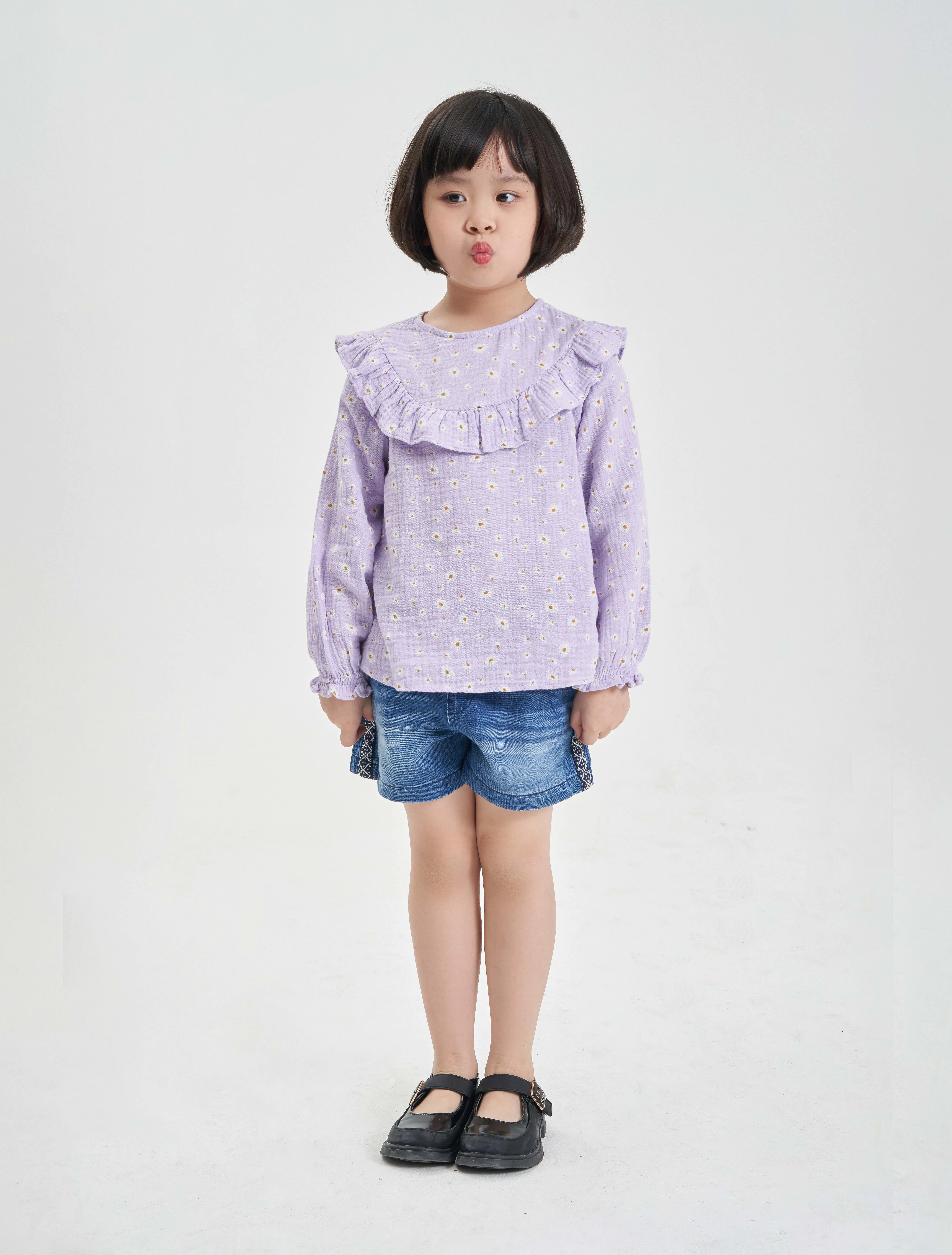 Áo kiểu bé gái với bèo trước ngực tạo sự nữ tính, phù hợp phối với nhiều loại trang phục cho bé gái.