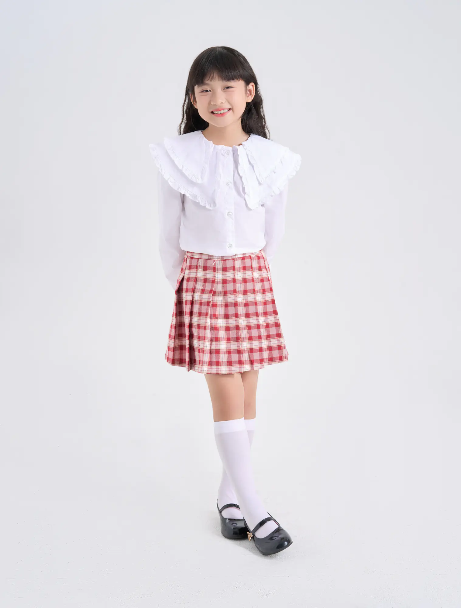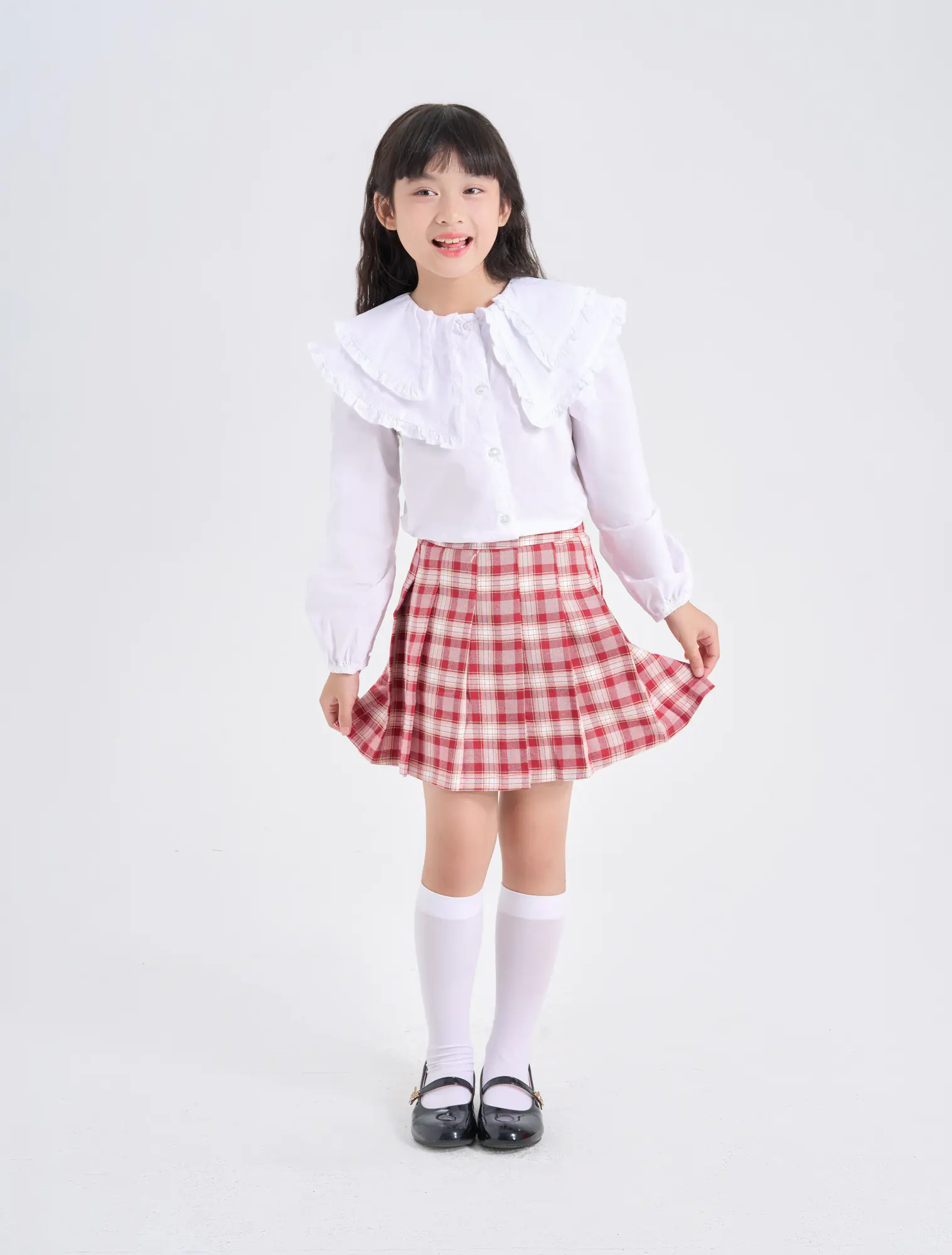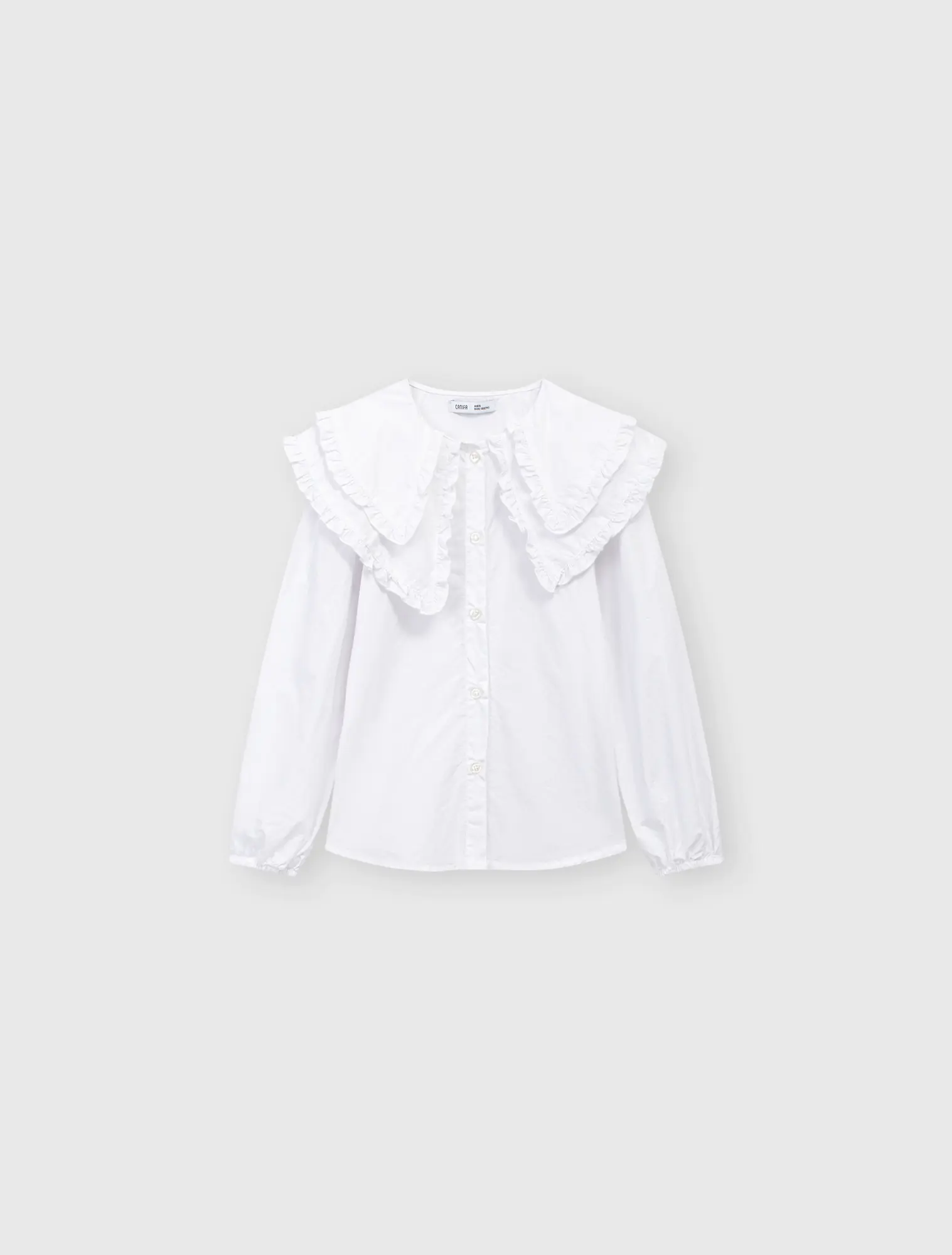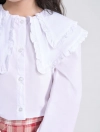 Áo kiểu bé gái có chi tiết 2 lớp lá cổ to mang đến sự nữ tính. Áo có thể kết hợp với các kiểu áo len gilet, váy yếm,... Chất liệu có độ dày vừa phải rất phù hợp với thời tiết giao mùa.