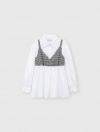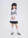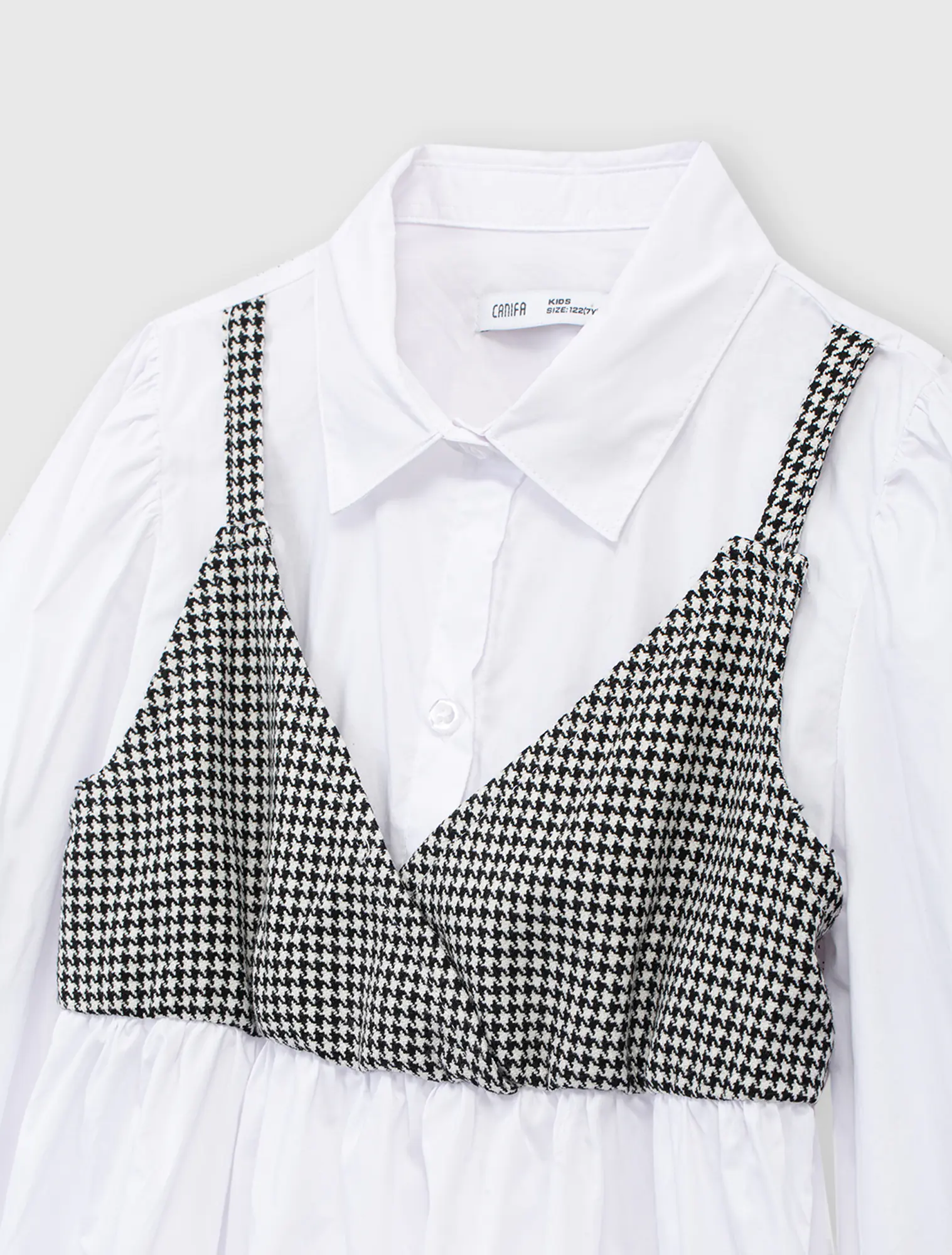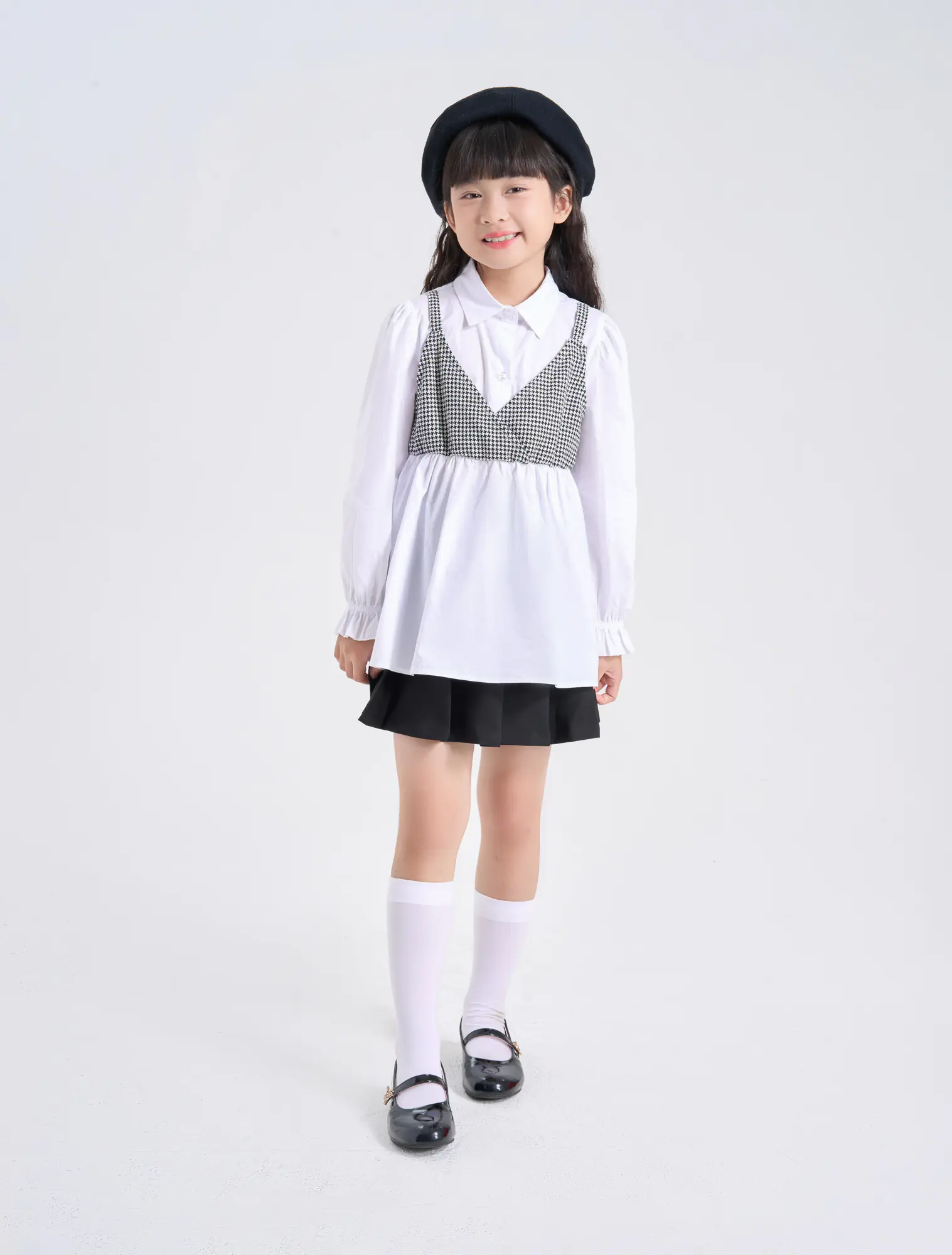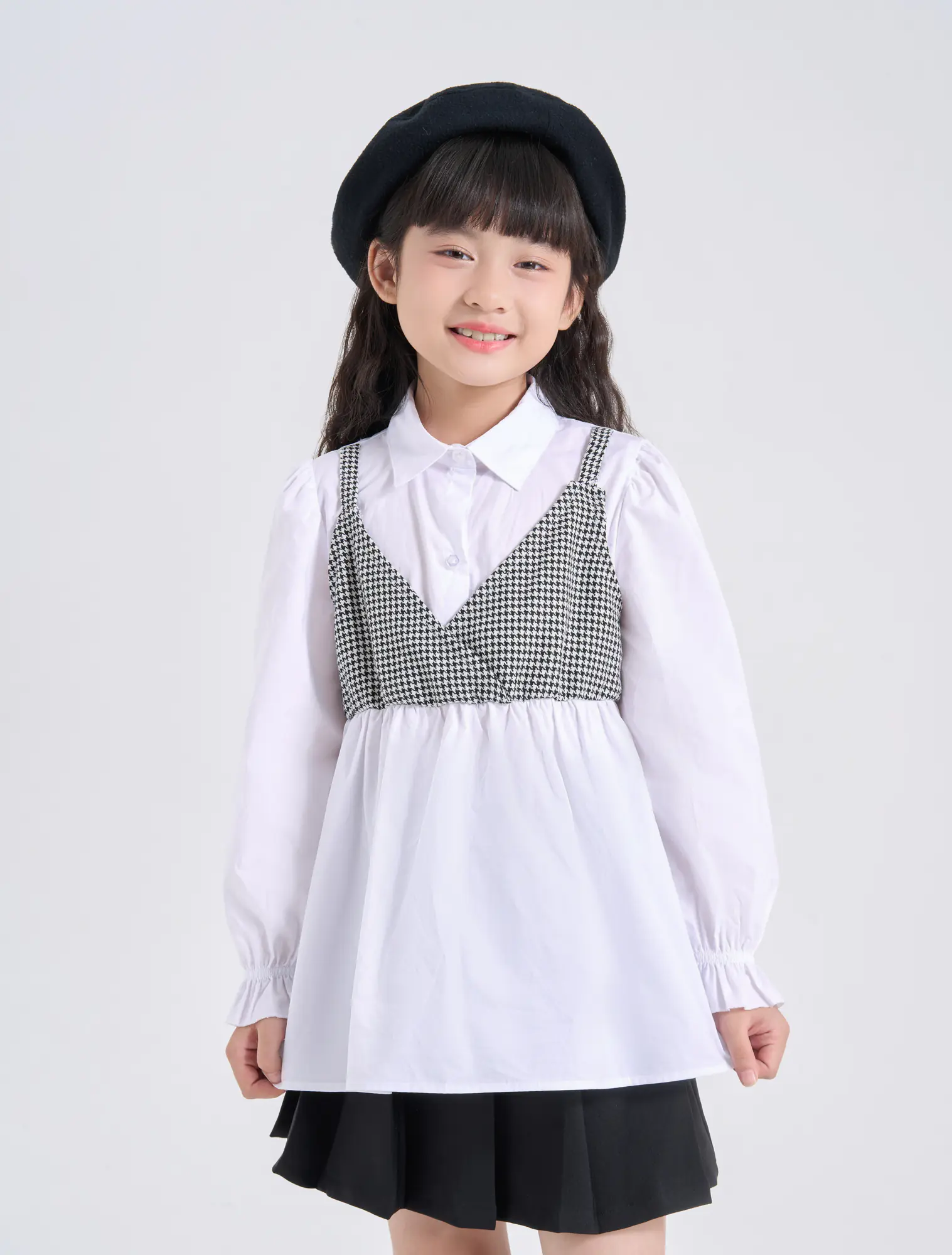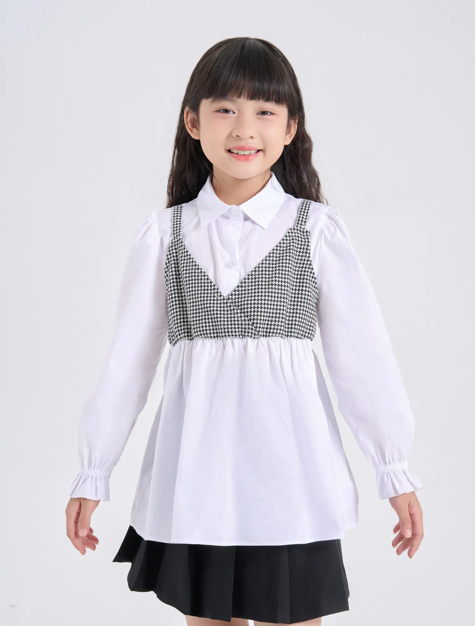 Áo kiểu bé gái có chi tiết phối yếm. Chất liệu có độ dày vừa phải rất phù hợp với thời tiết giao mùa.