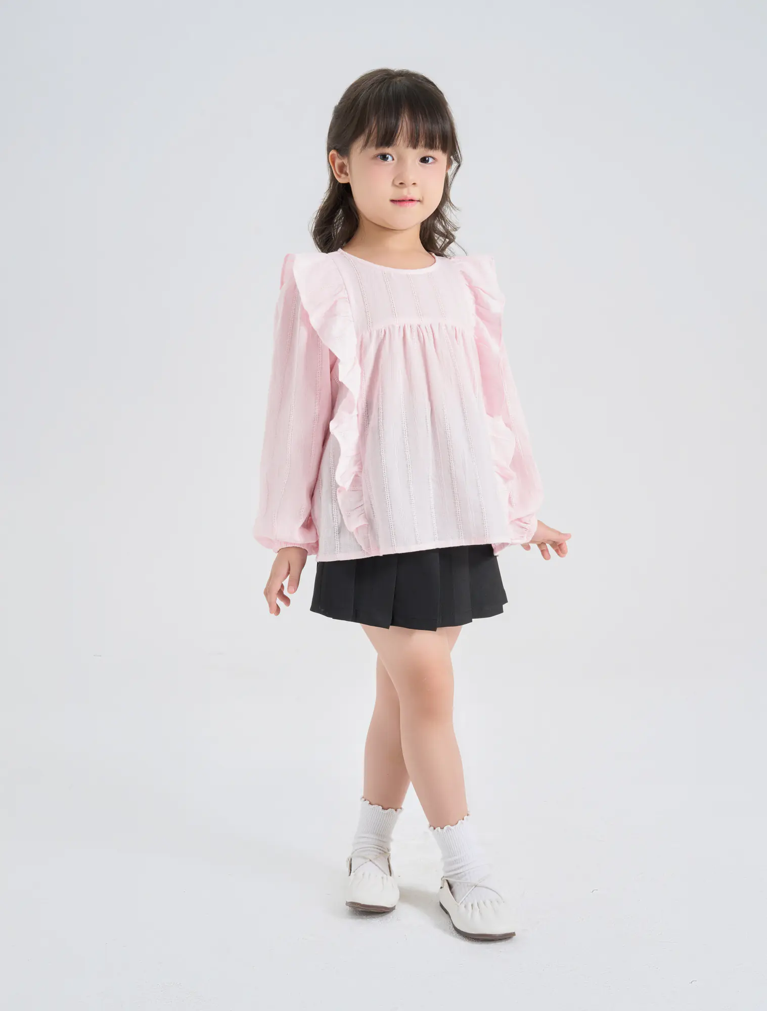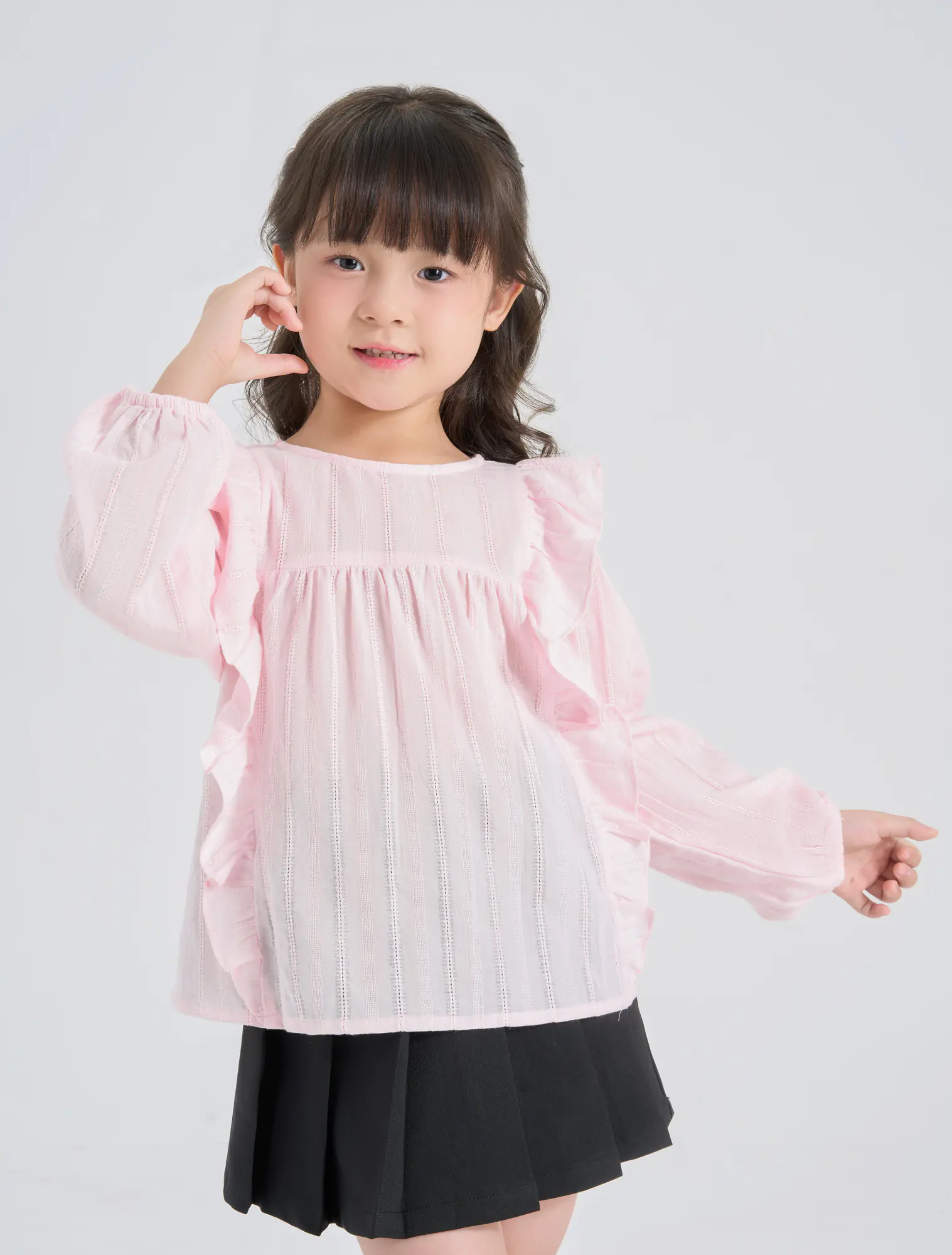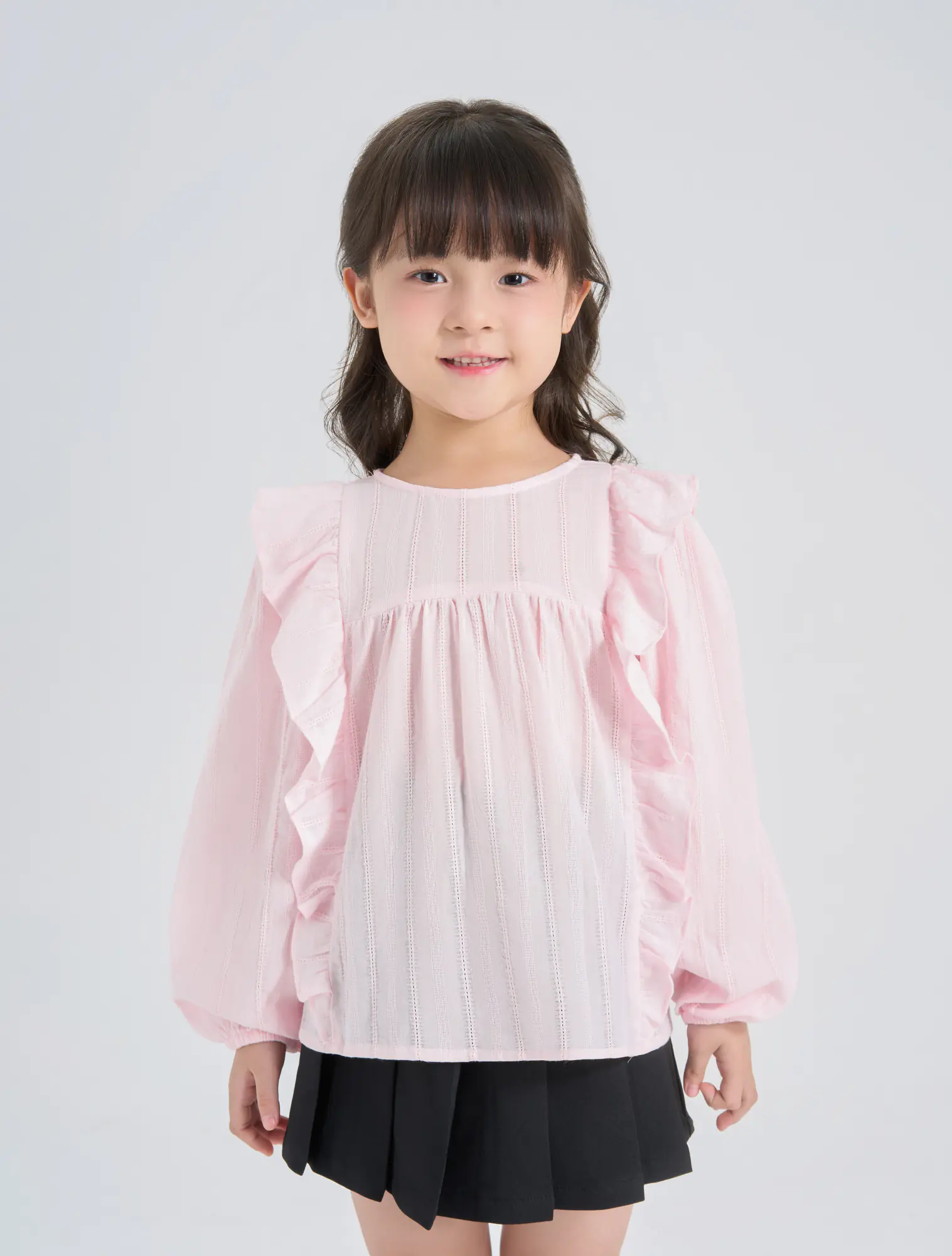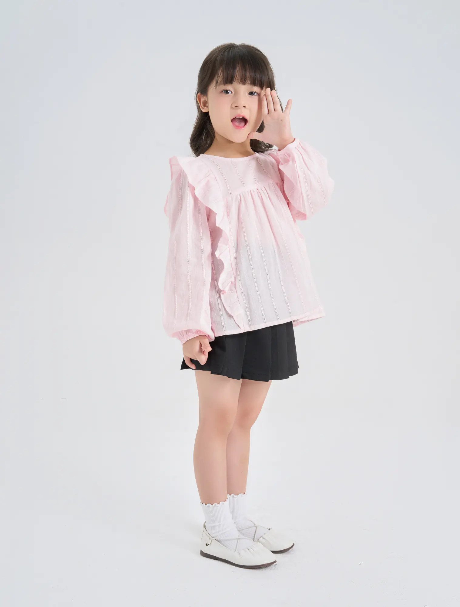 Áo kiểu bé gái phối bèo trước ngực tạo sự nữ tính, phù hợp phối với nhiều loại trang phục cho bé gái.