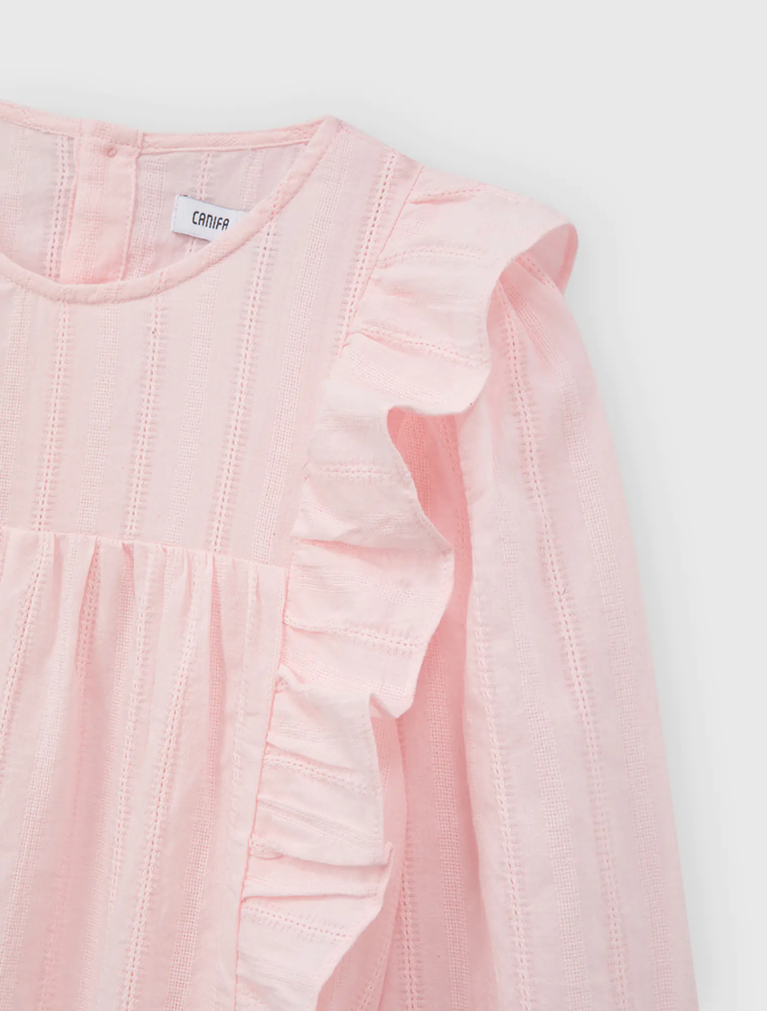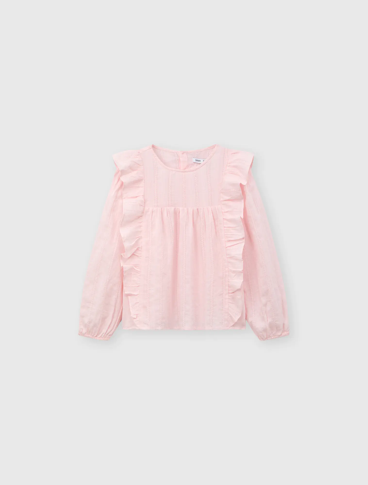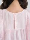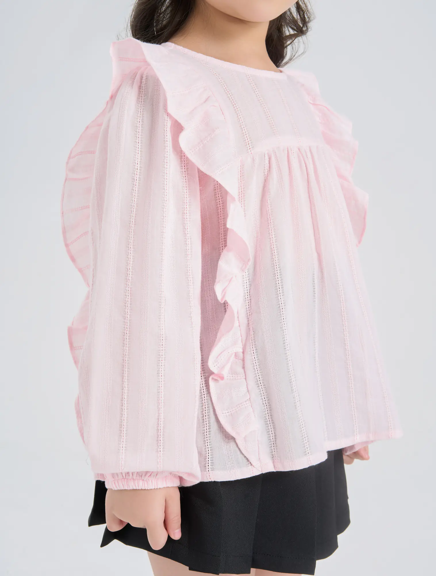 Áo kiểu bé gái phối bèo trước ngực tạo sự nữ tính, phù hợp phối với nhiều loại trang phục cho bé gái.